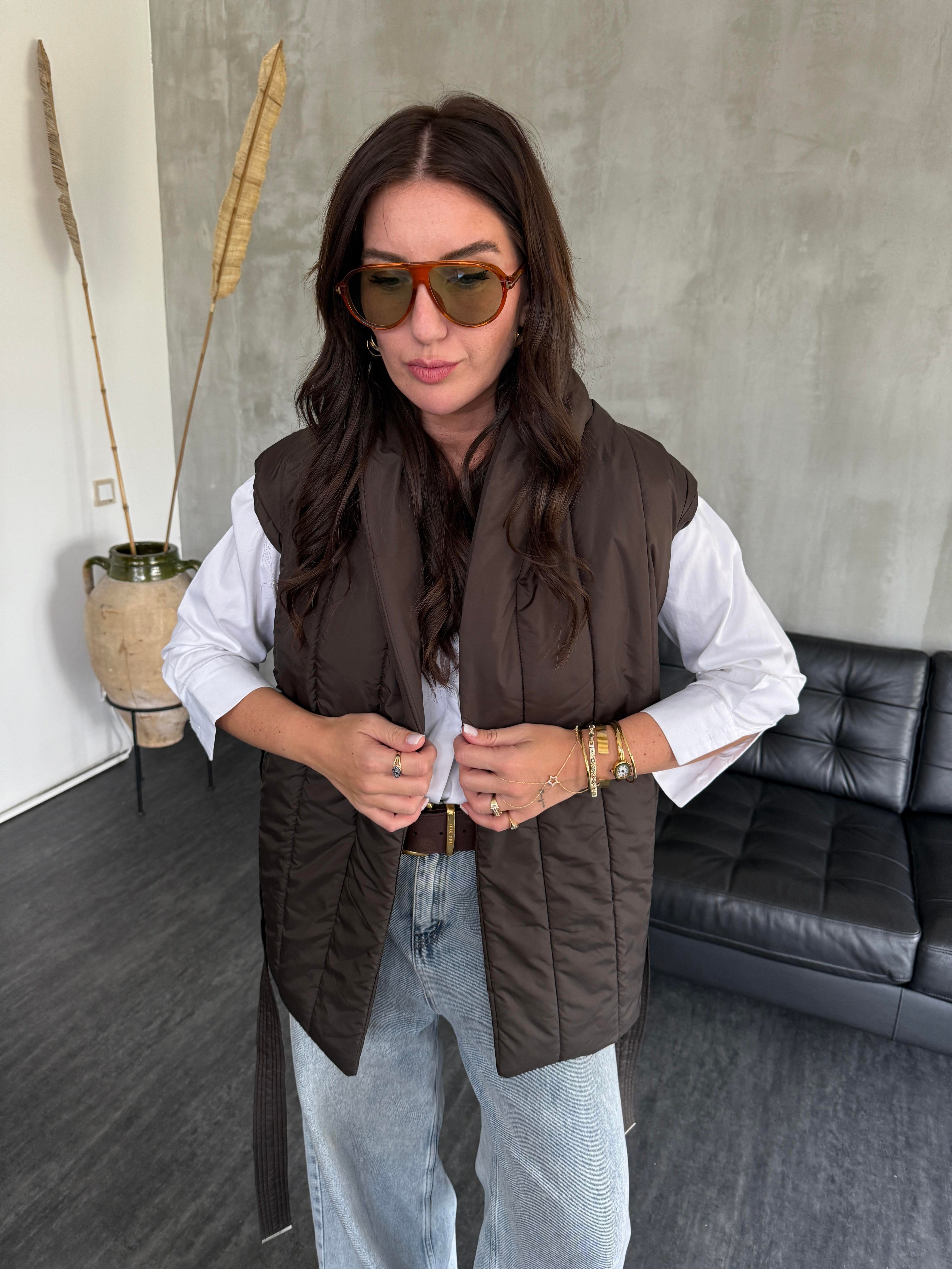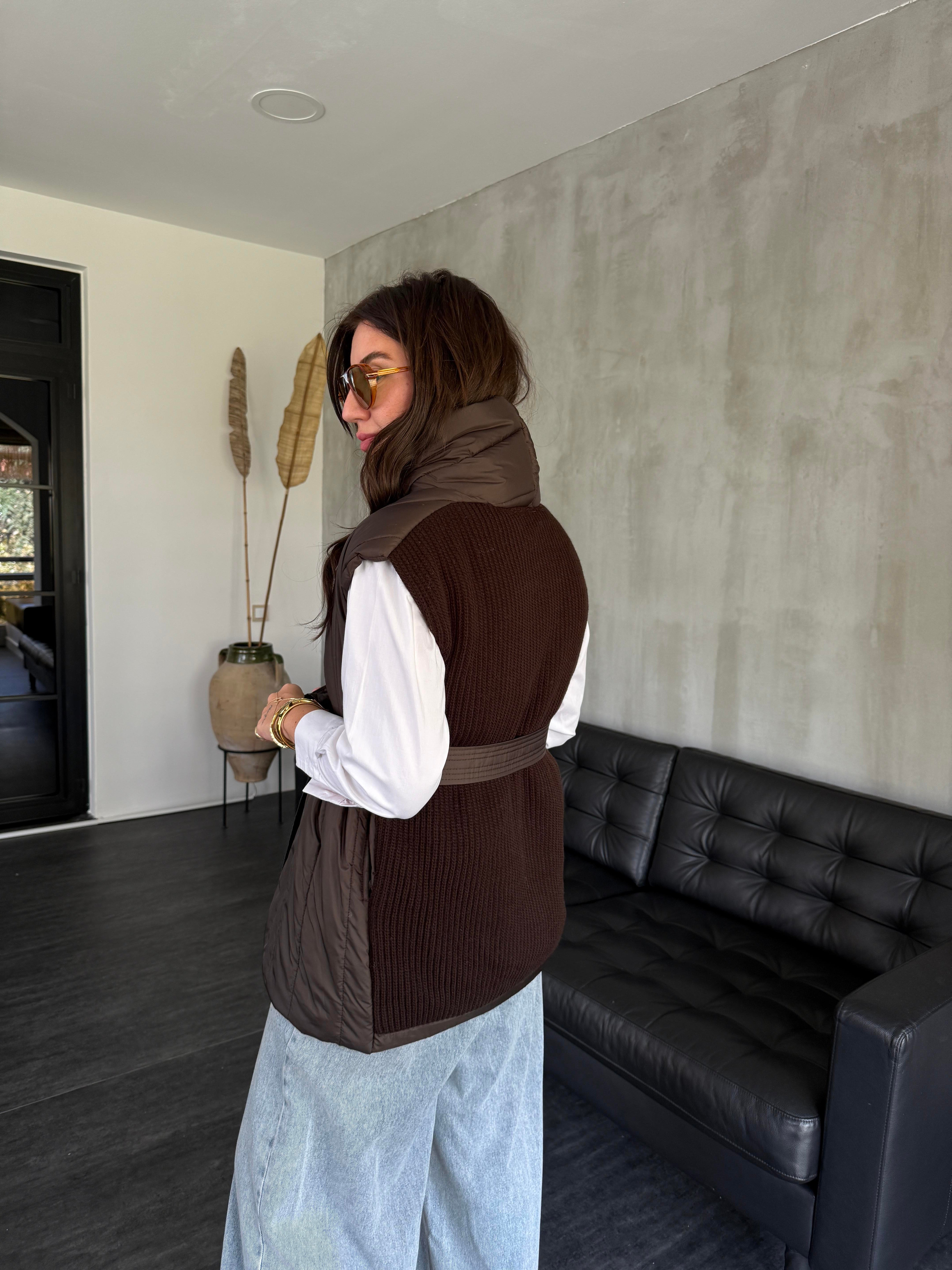 Arkası Triko Detaylı , Kuşaklı , Acı Kahve Puff Yelek