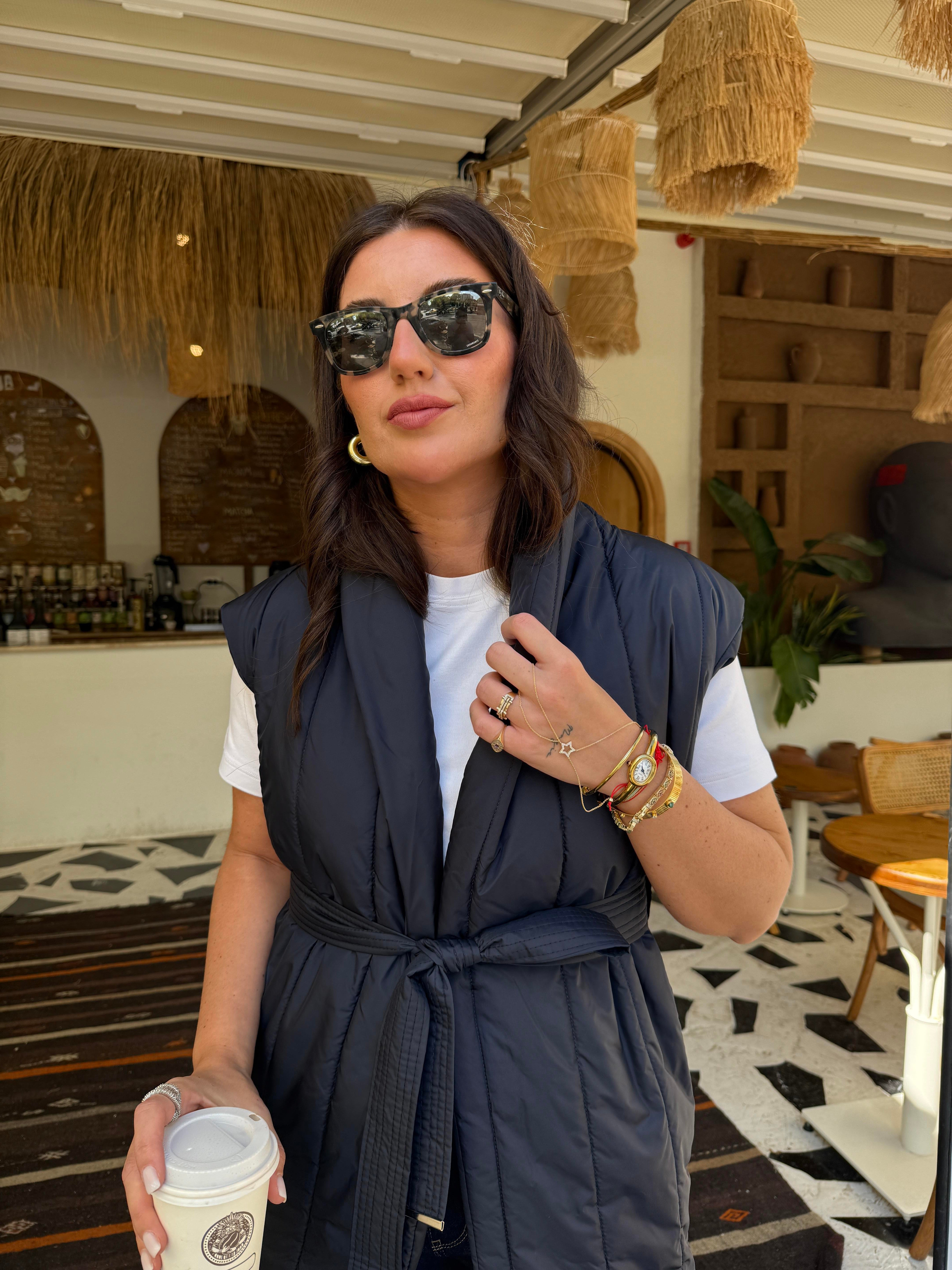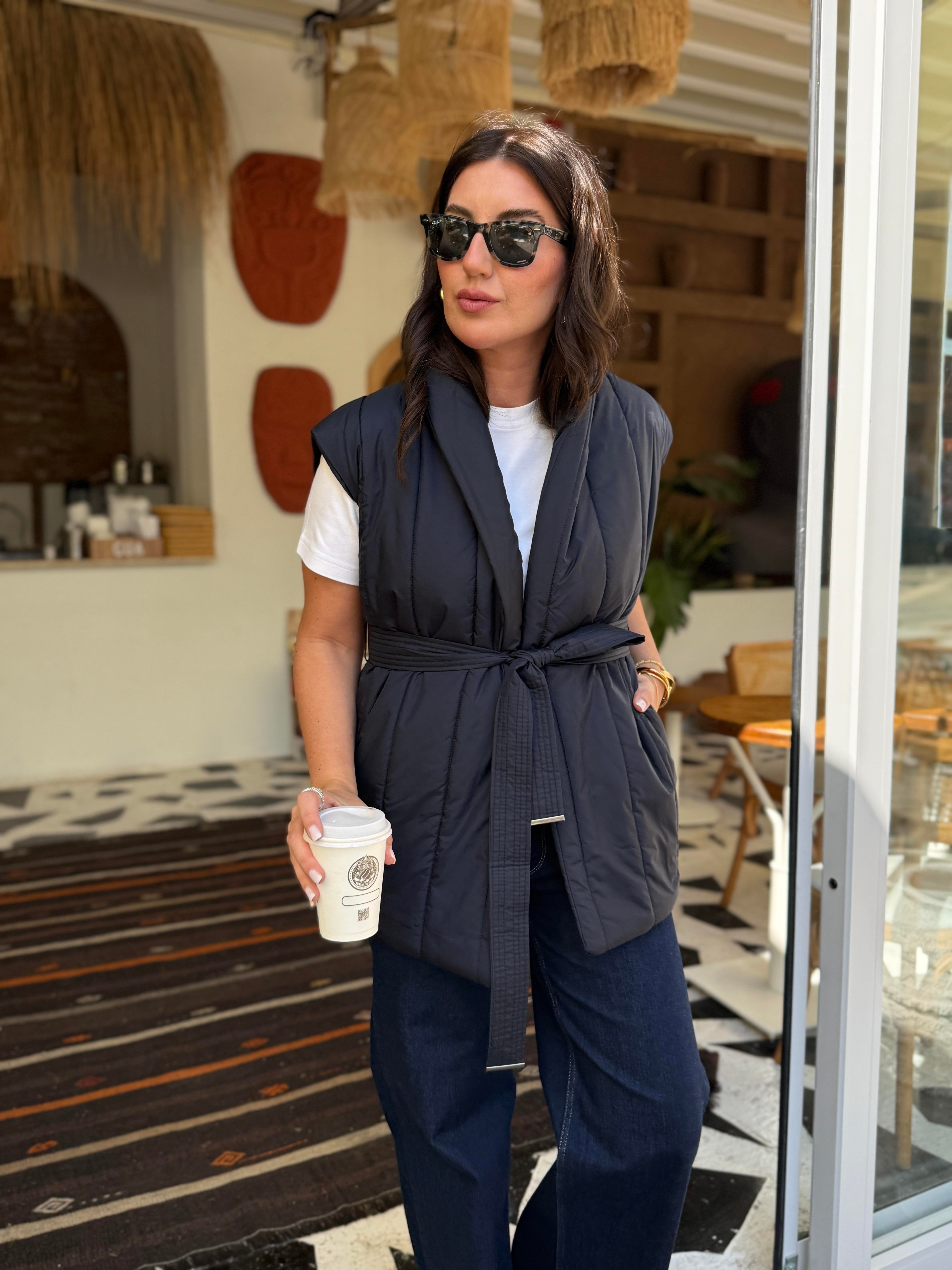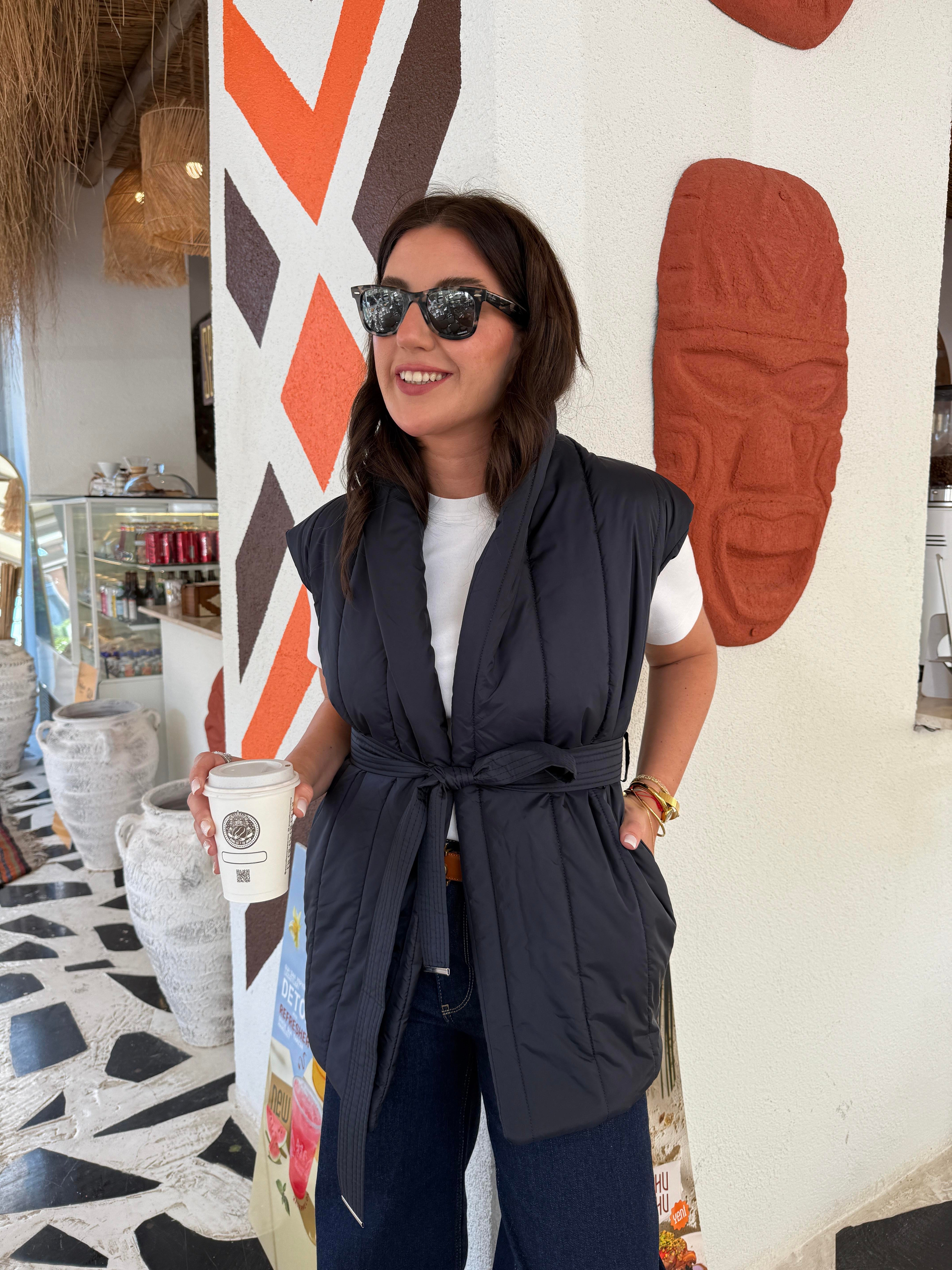 Arkası Triko Detaylı , Kuşaklı , Lacivert Puff Yelek