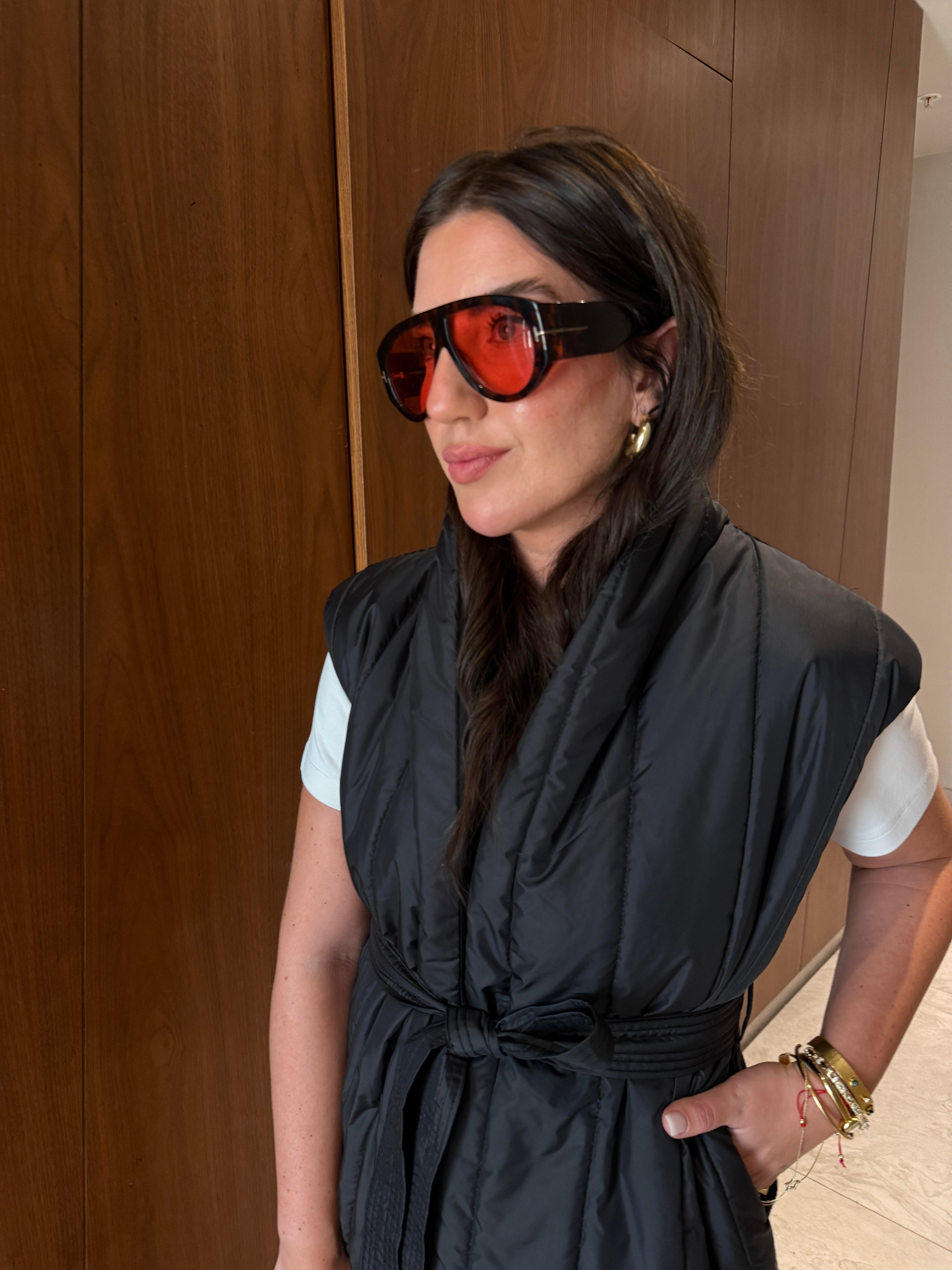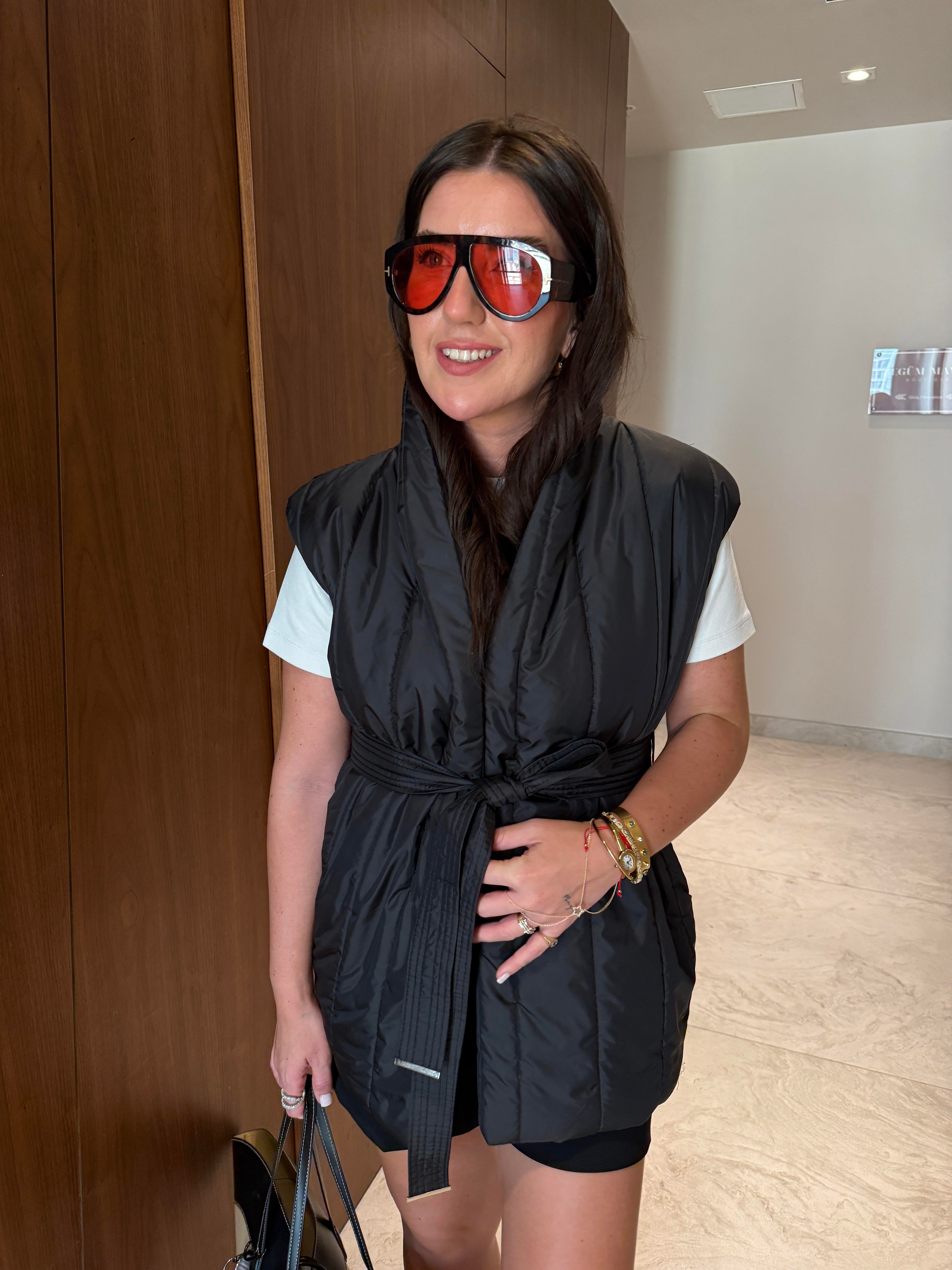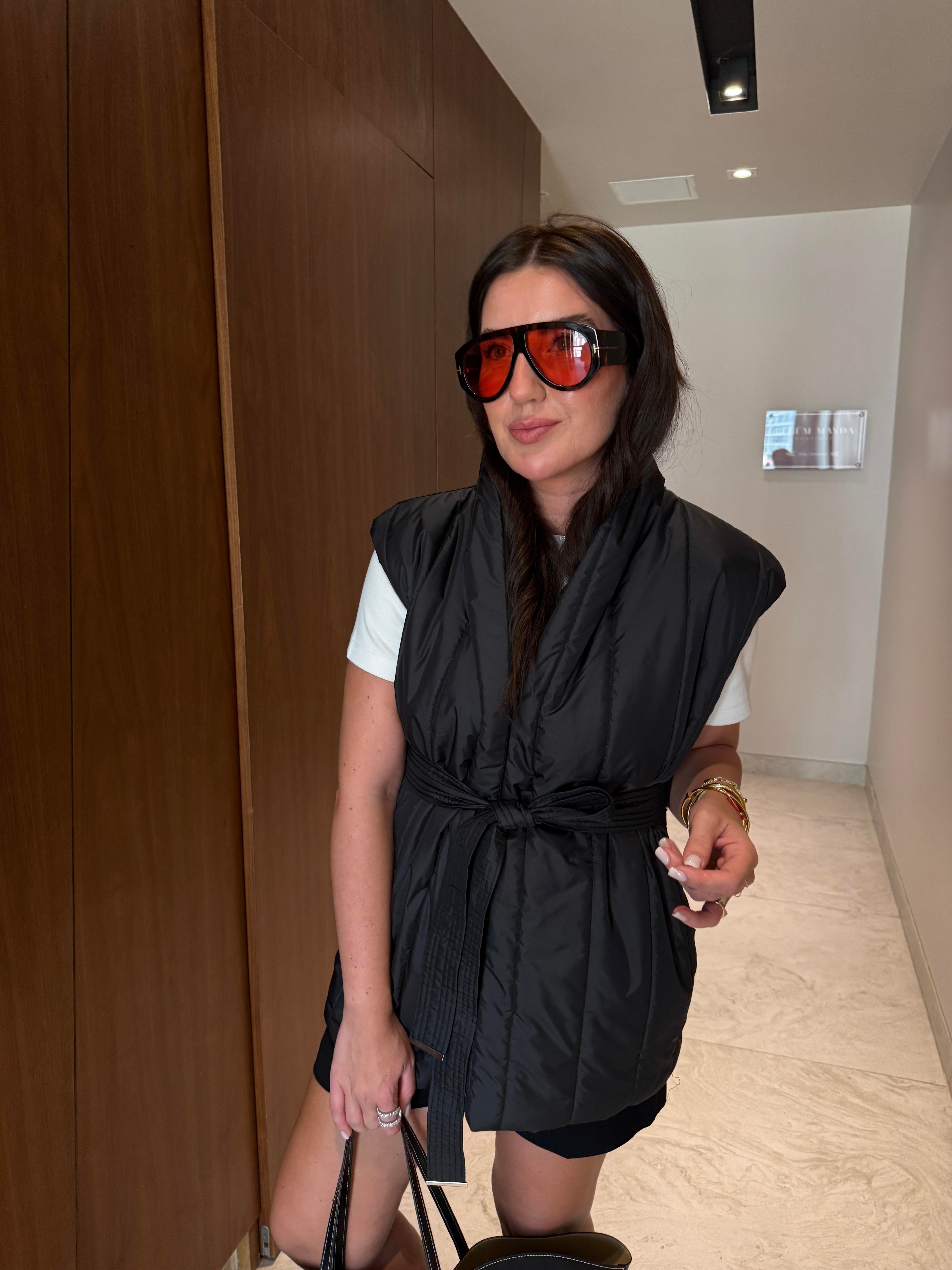 Arkası Triko Detaylı , Kuşaklı , Siyah Puff Yelek