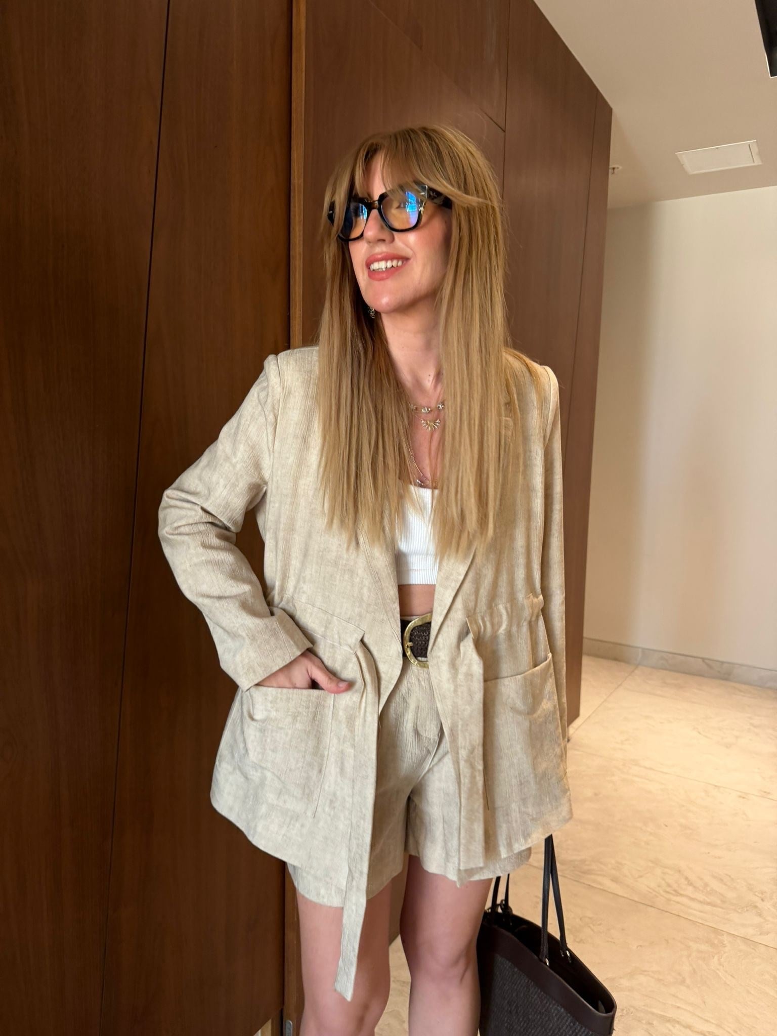 Belden Büzgülü , Ceket & Şort , Özel Dokulu , Bej Takım