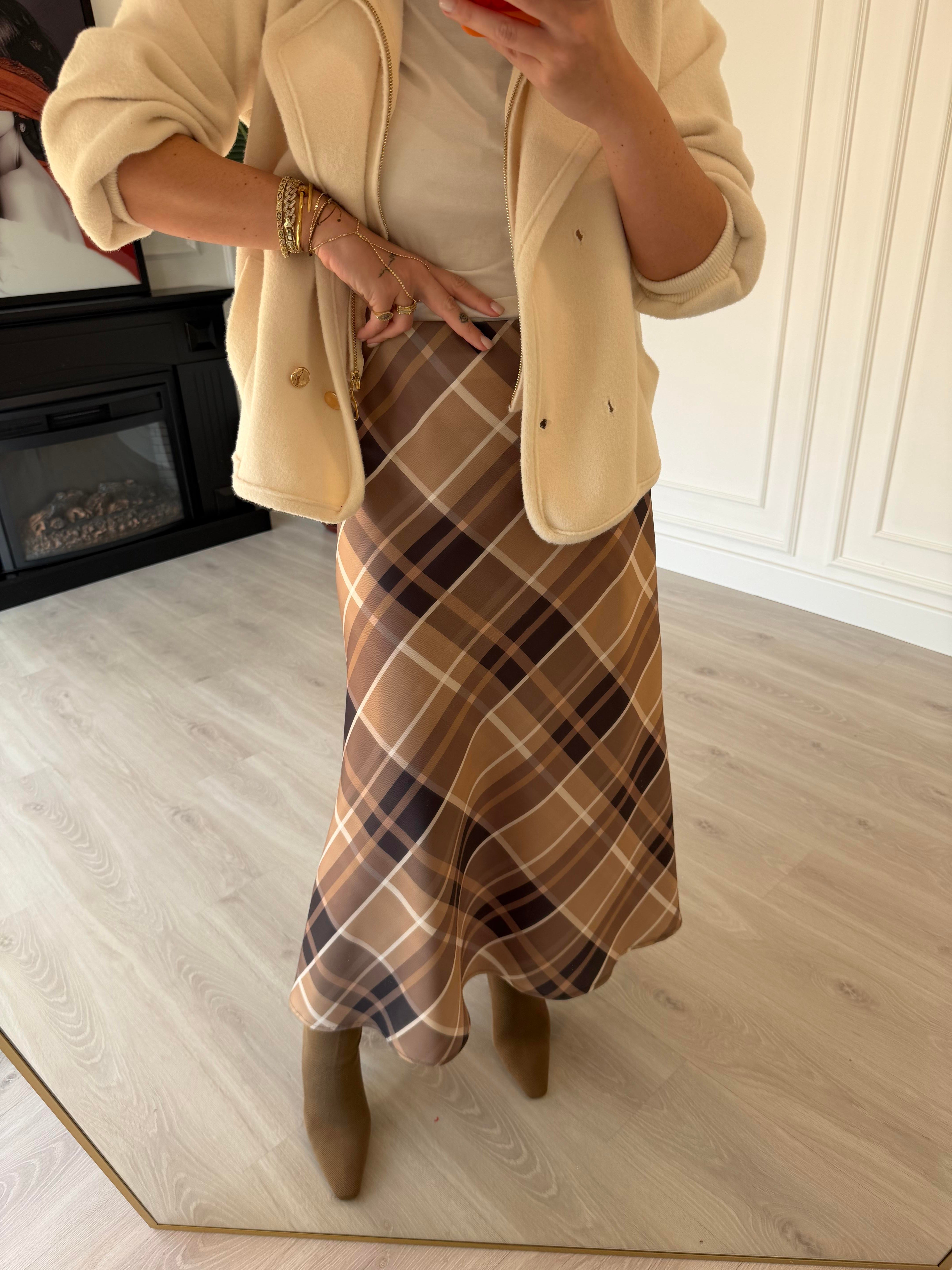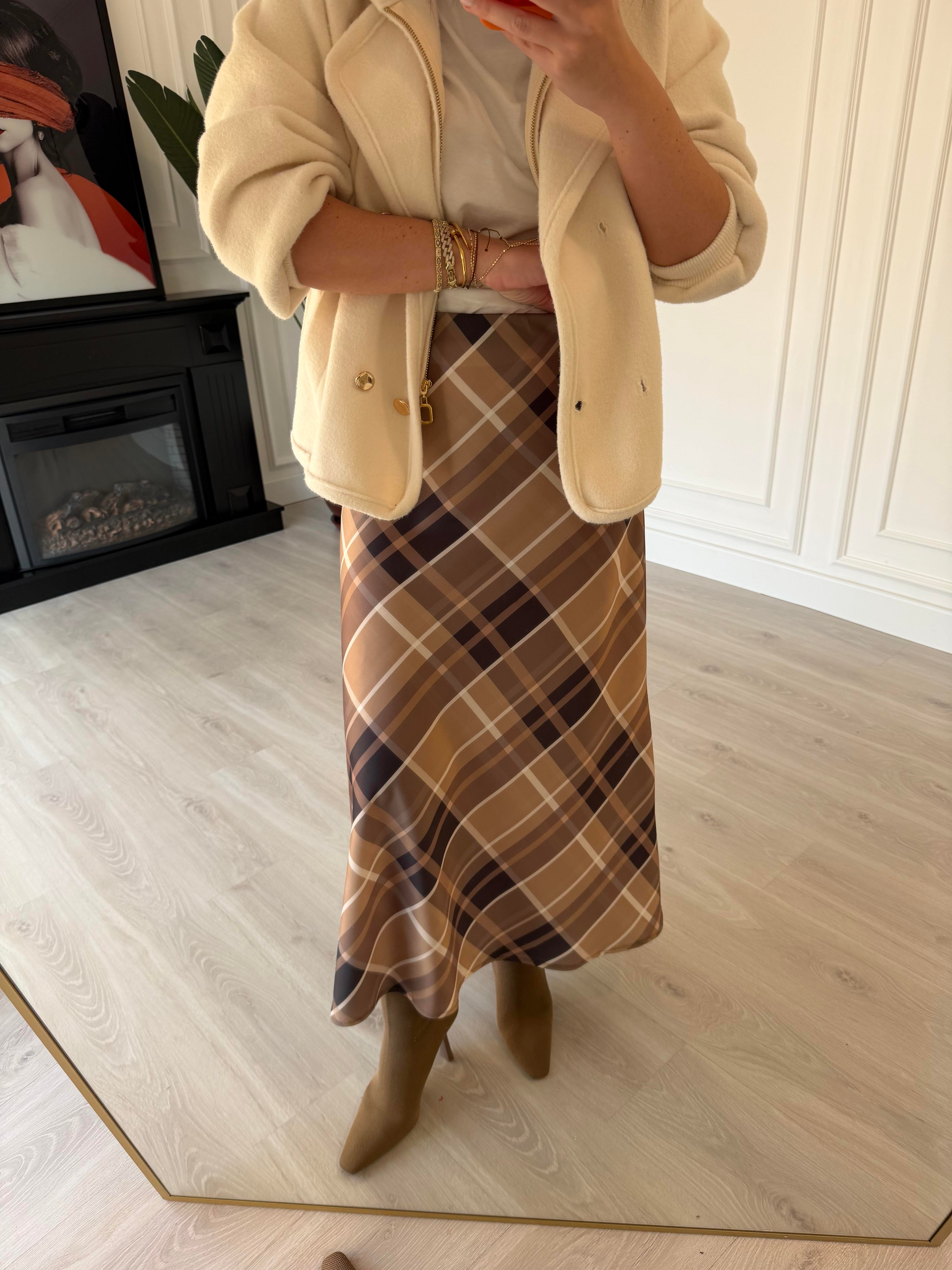 Beli Gizli Lastikli Kahve & Bej Ekoseli Tok Saten Etek