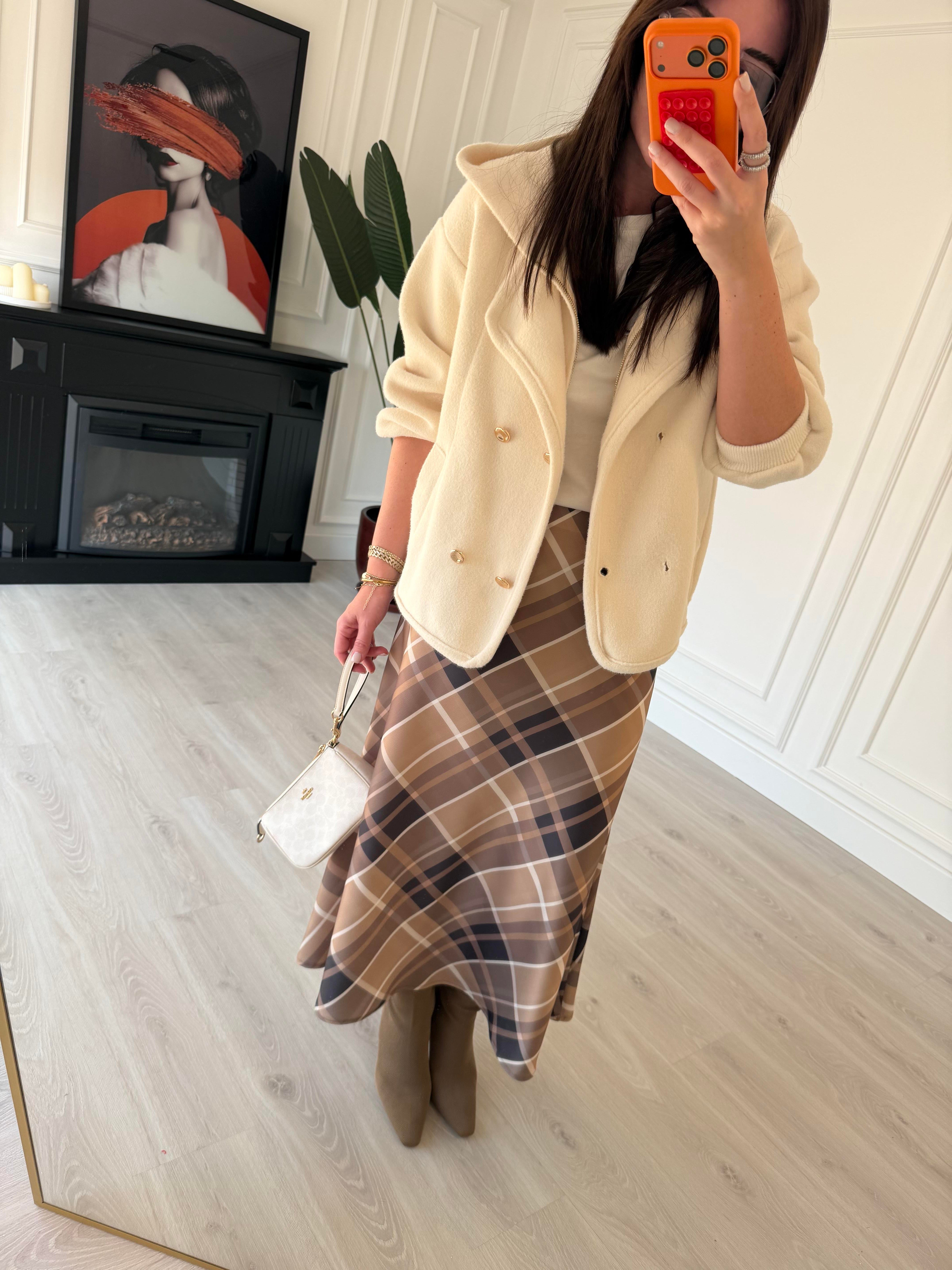 Beli Gizli Lastikli Haki & Bej Ekoseli Tok Saten Etek Beli Gizli Lastikli Siyah & Bej Ekoseli Tok Saten Etek