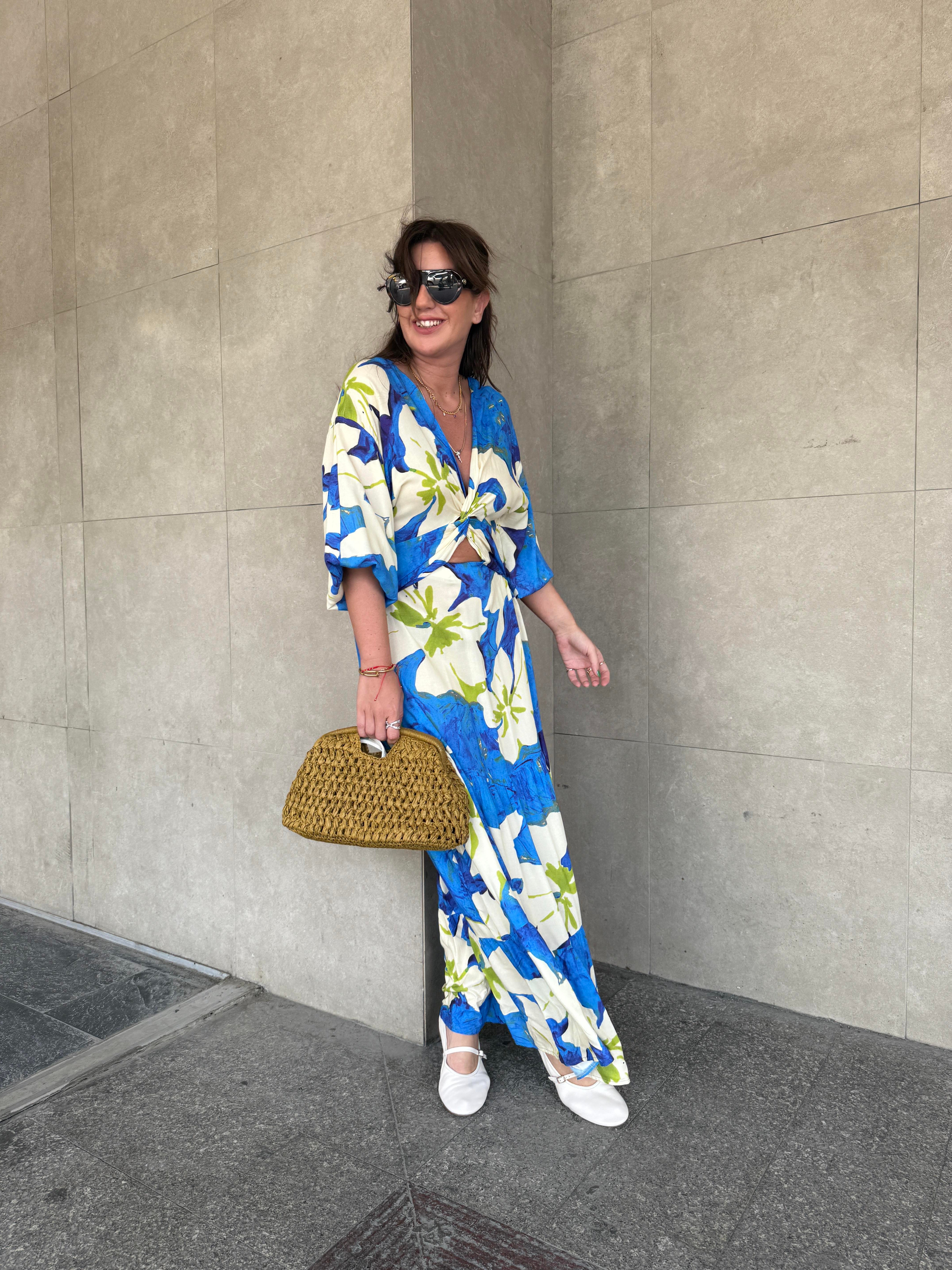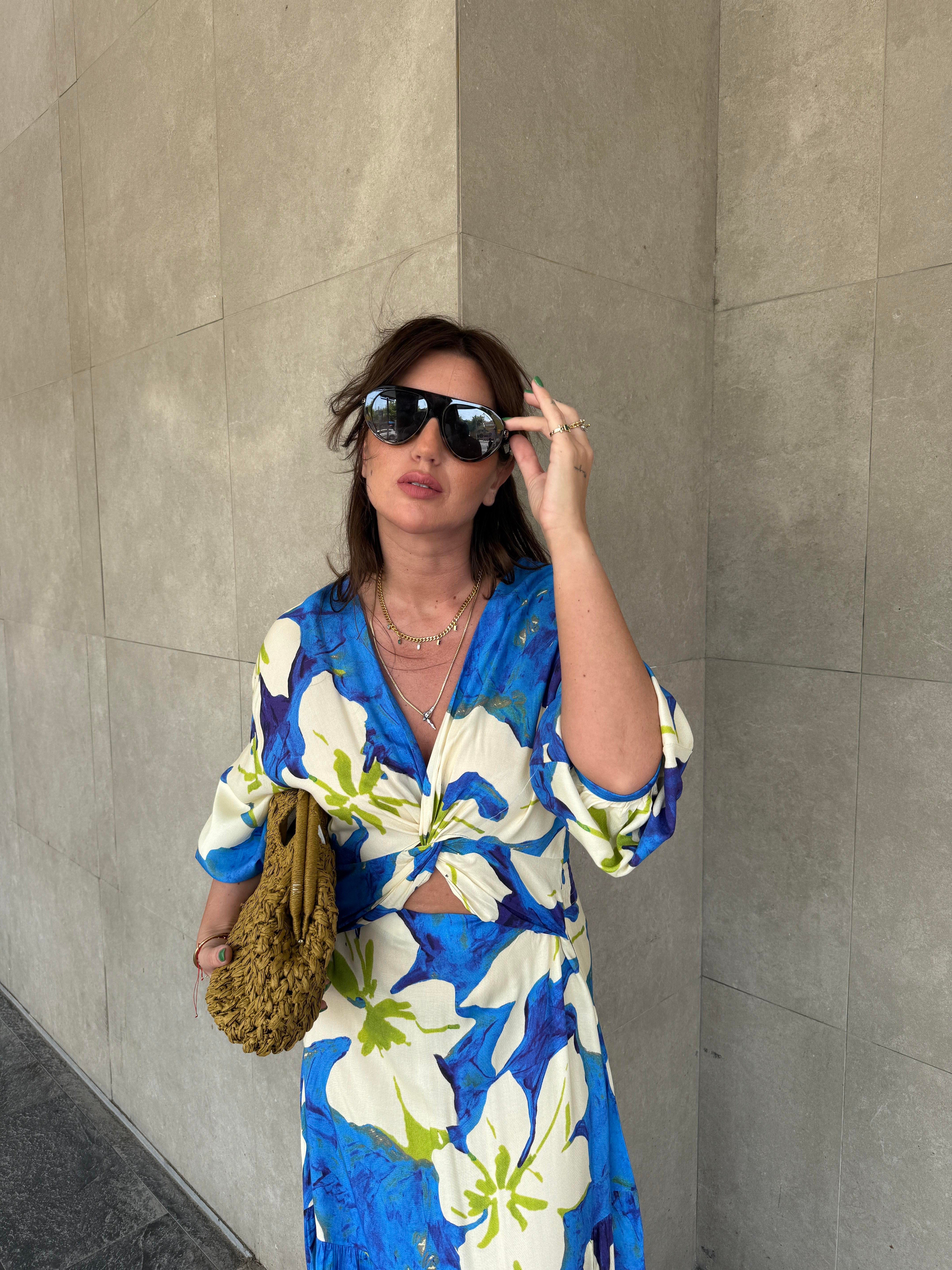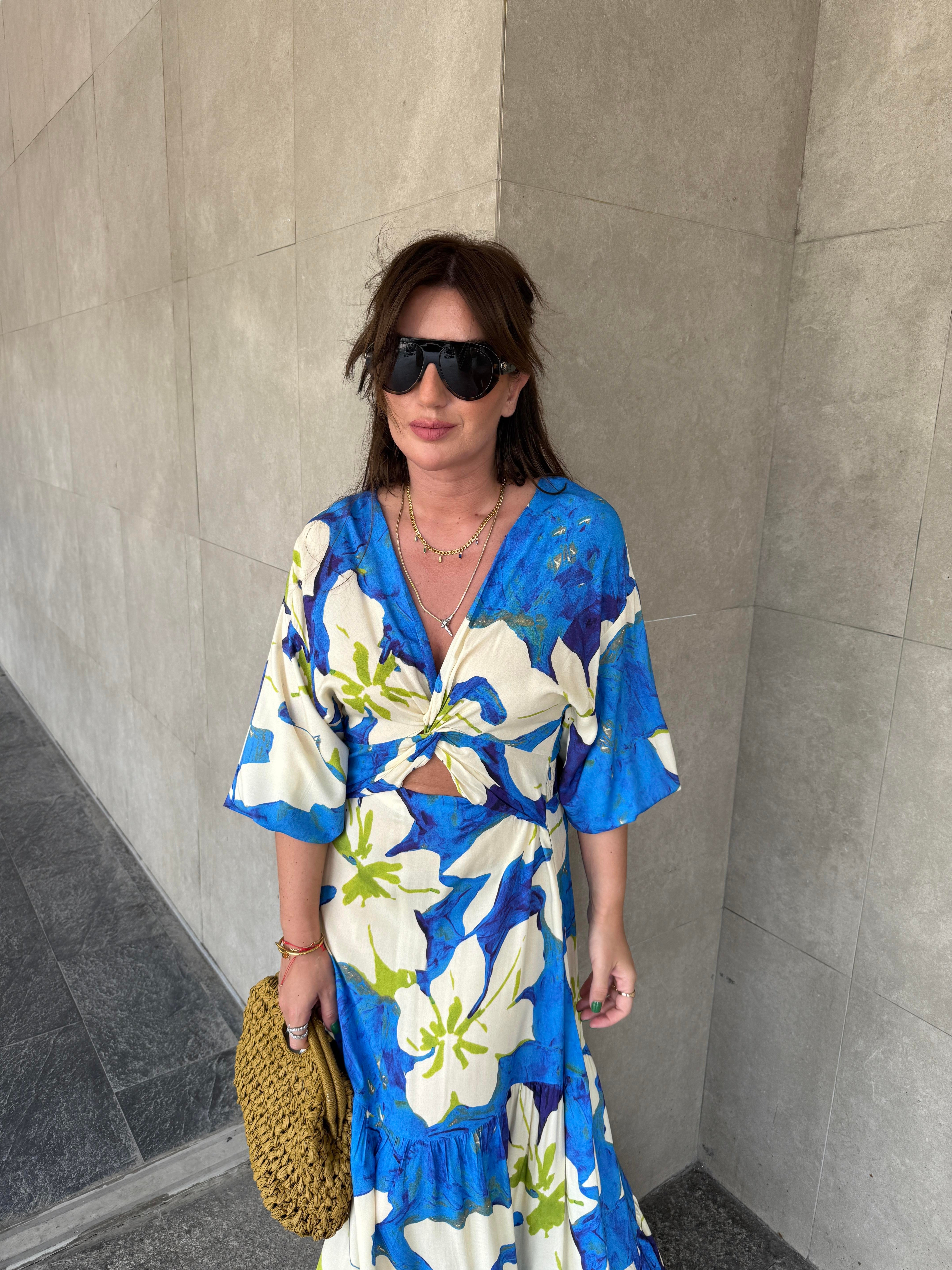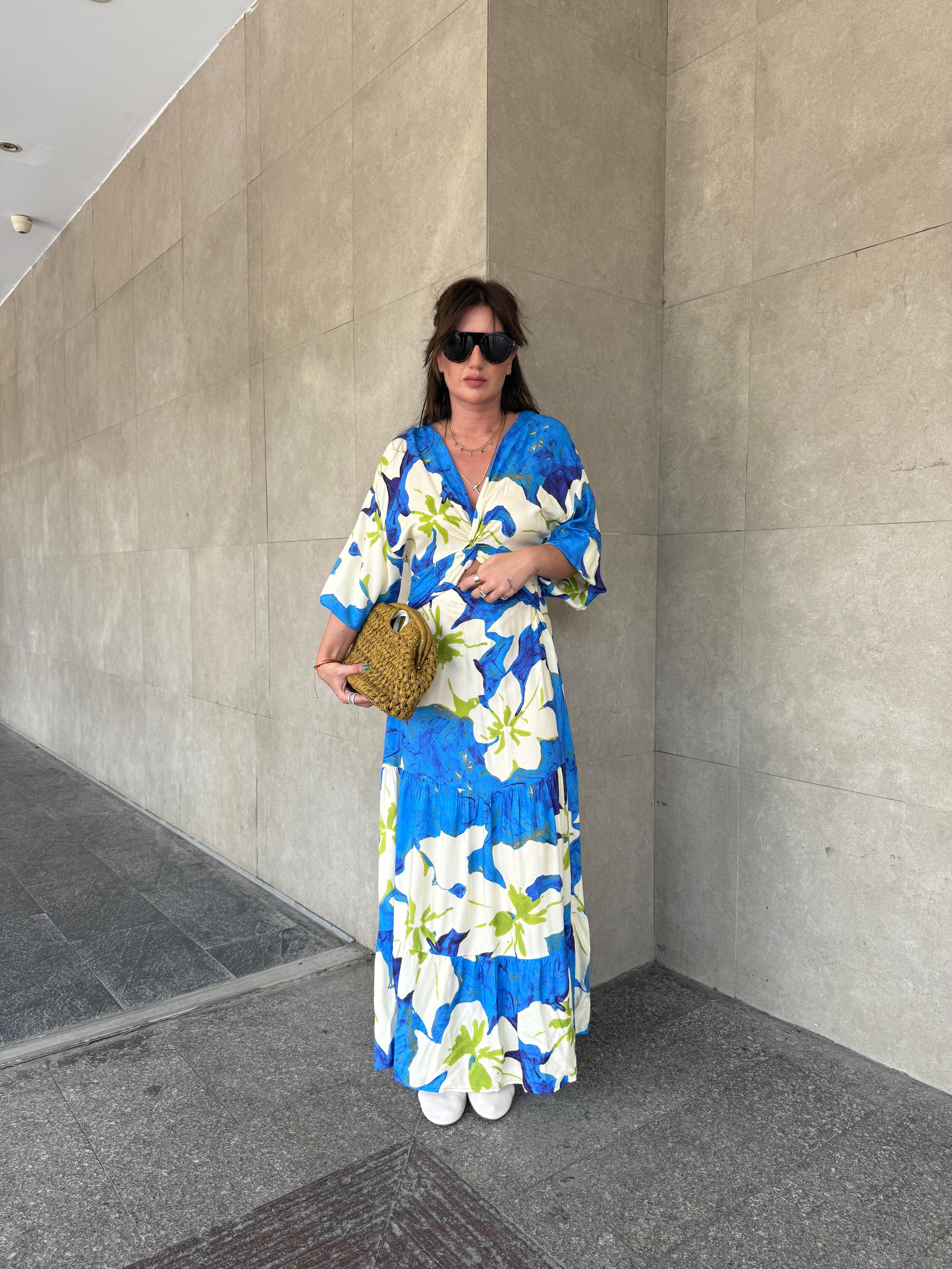 Beli Lastikli , Mavi Çiçek Desenli , Kasımpatı Elbise (hf400elb)