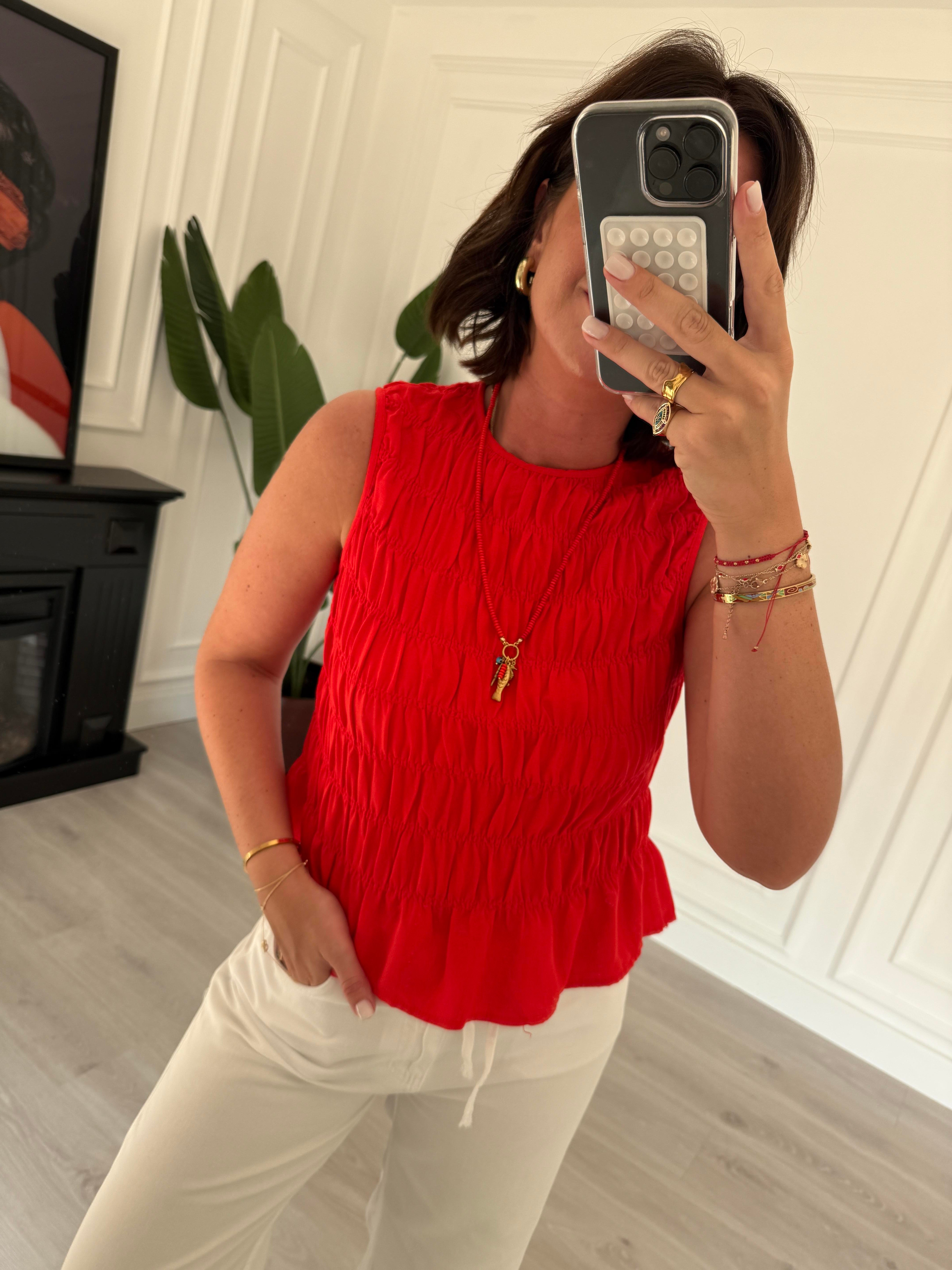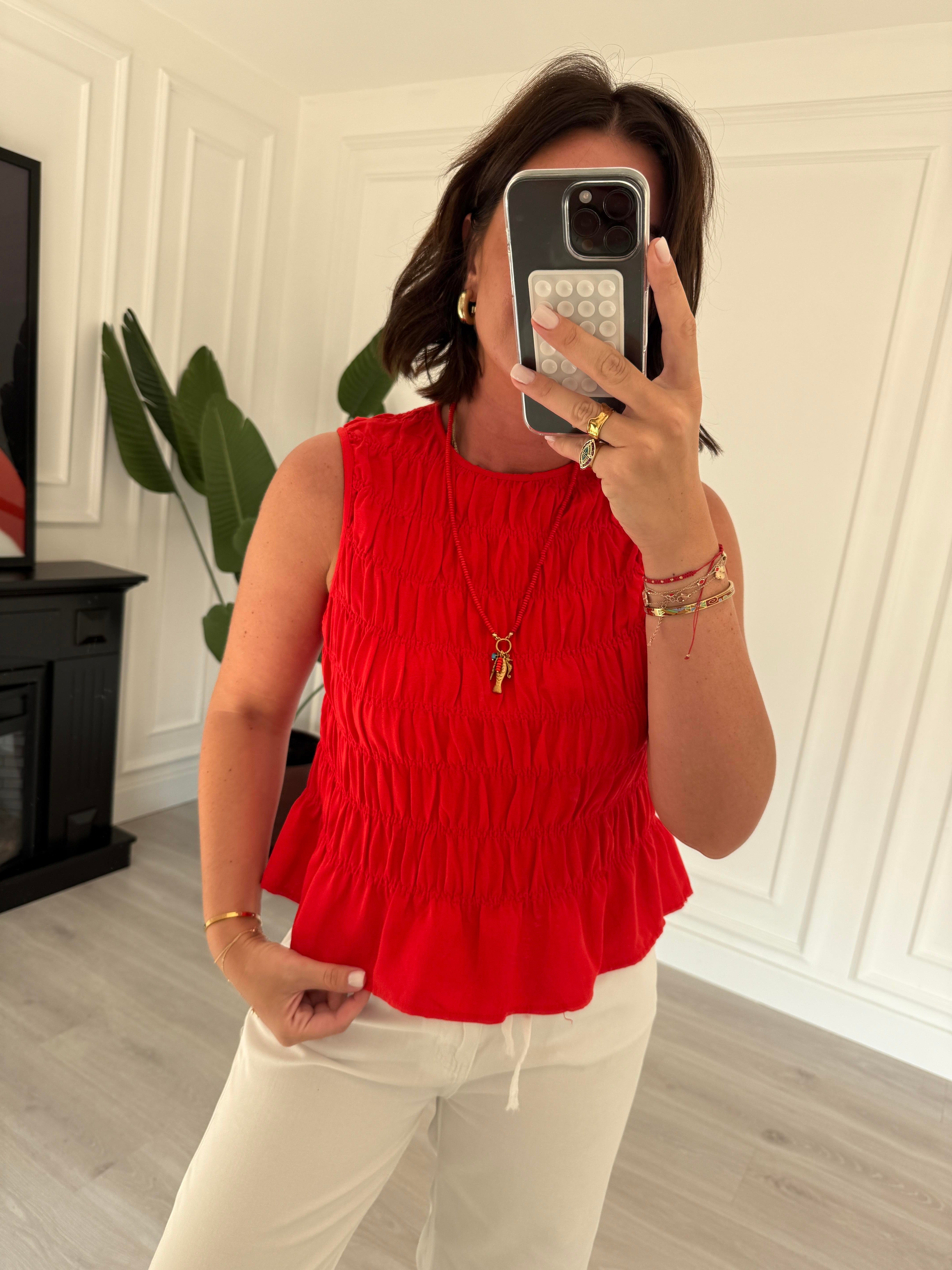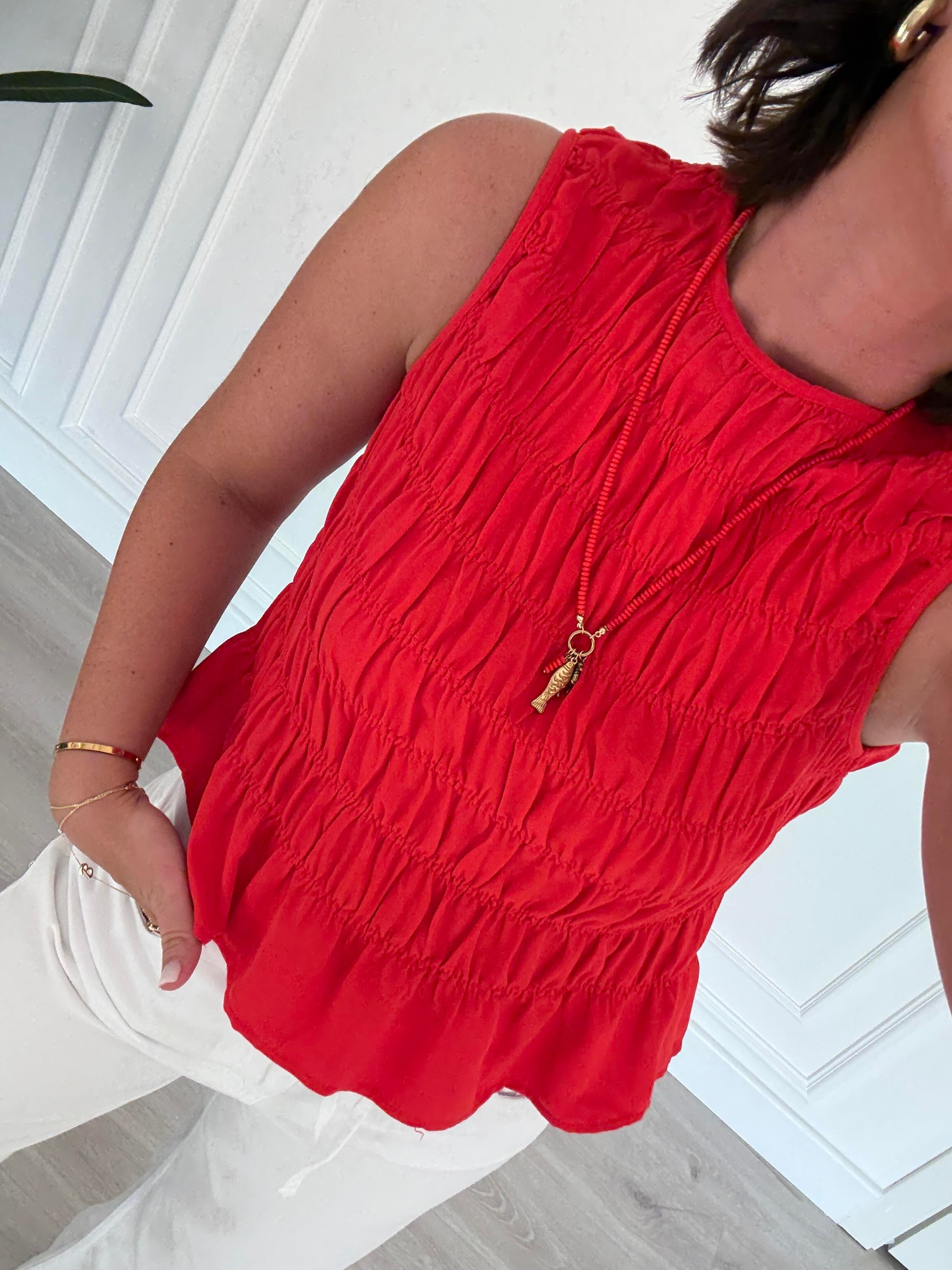 Büzgülü , Tasarım , Kırmızı Kolsuz Bluz