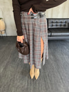 Çift Kemer Detaylı , Yırtmaçlı , Kahverengi Ekoseli Etek