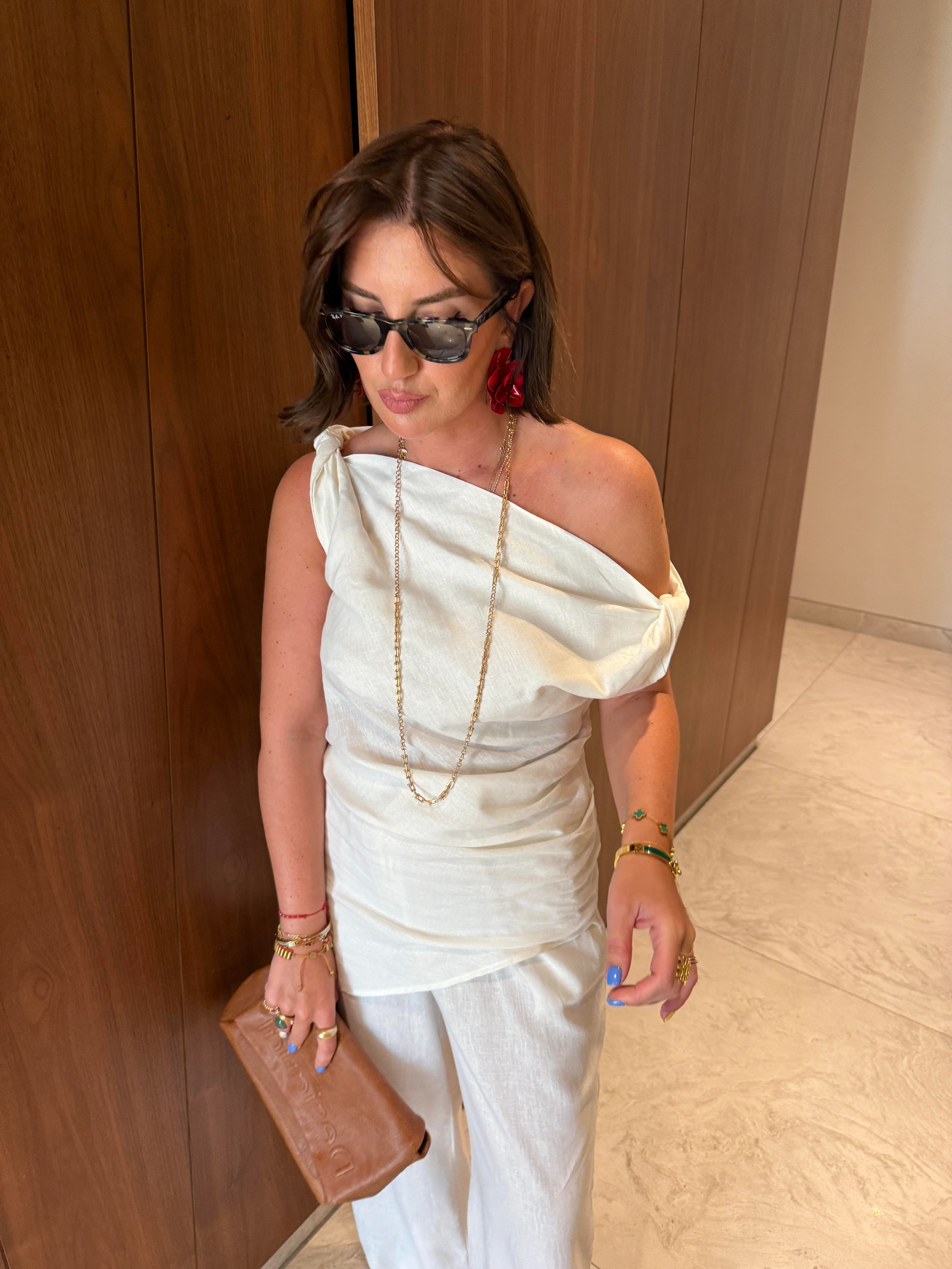 Ekru, Premium Keten , Çapraz Omuzlu , Pantolon & Bluz Takım