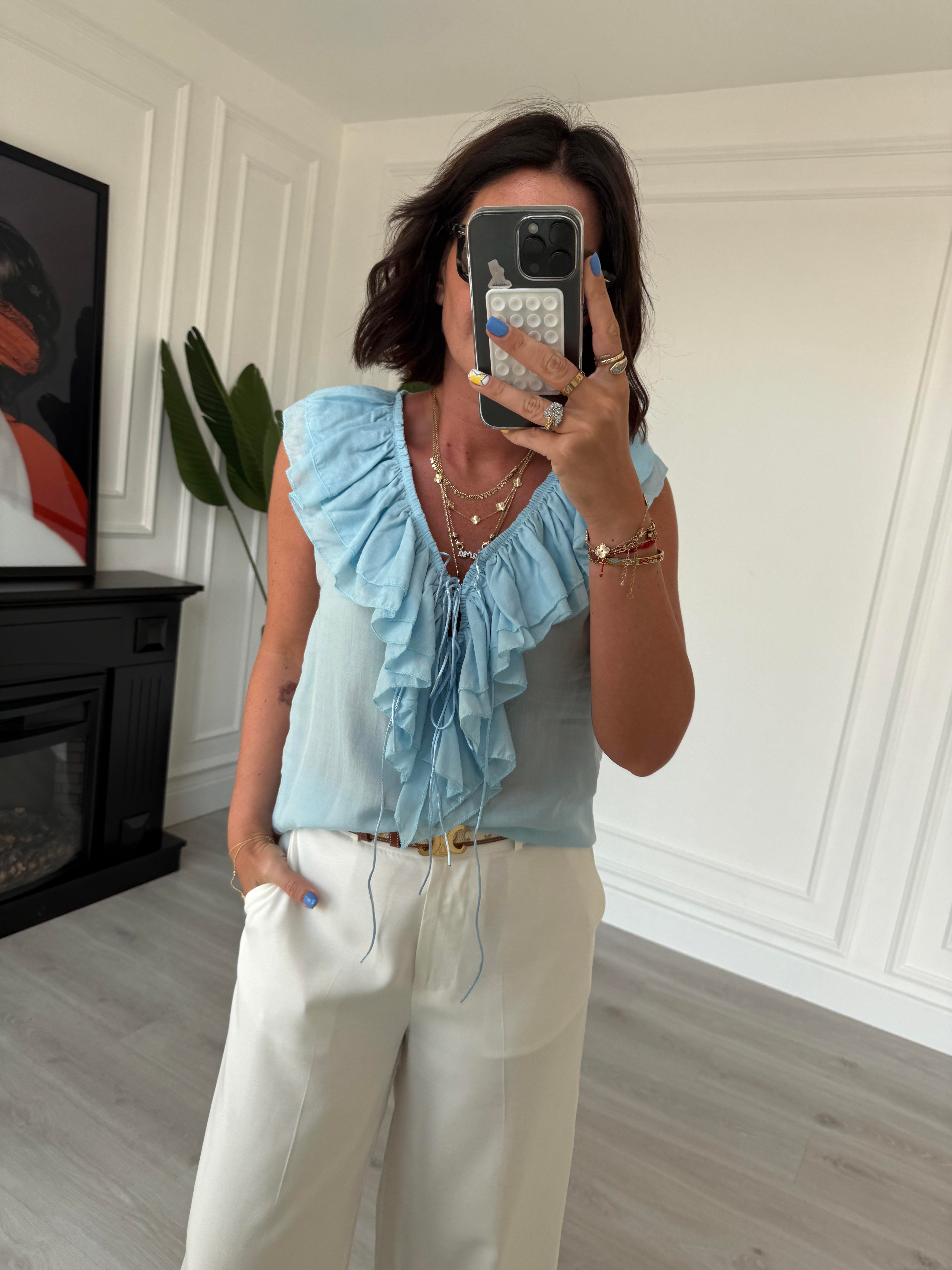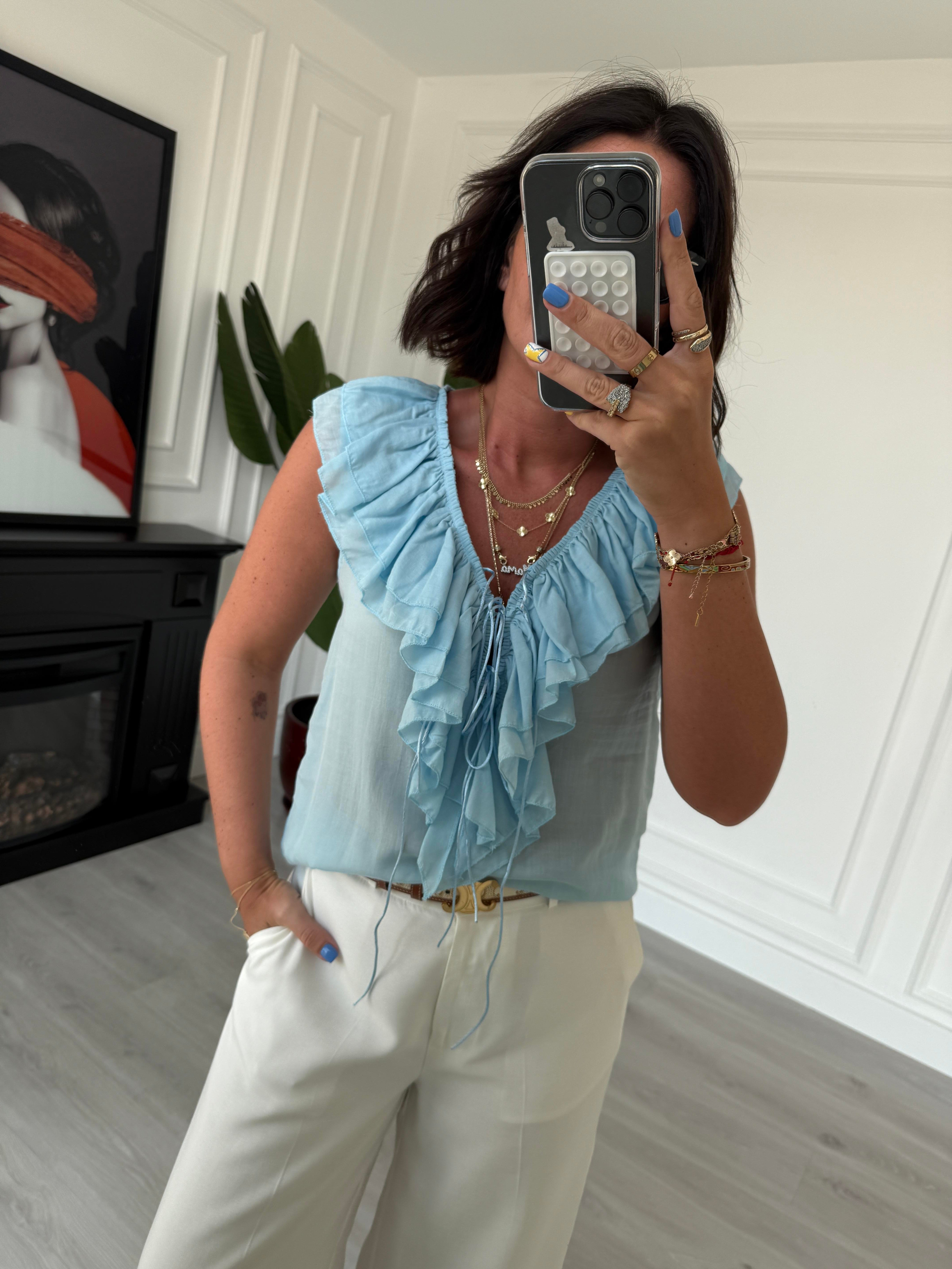 Fırfır Detaylı , Premium Seri , Bebe Mavisi , Kolsuz Bluz