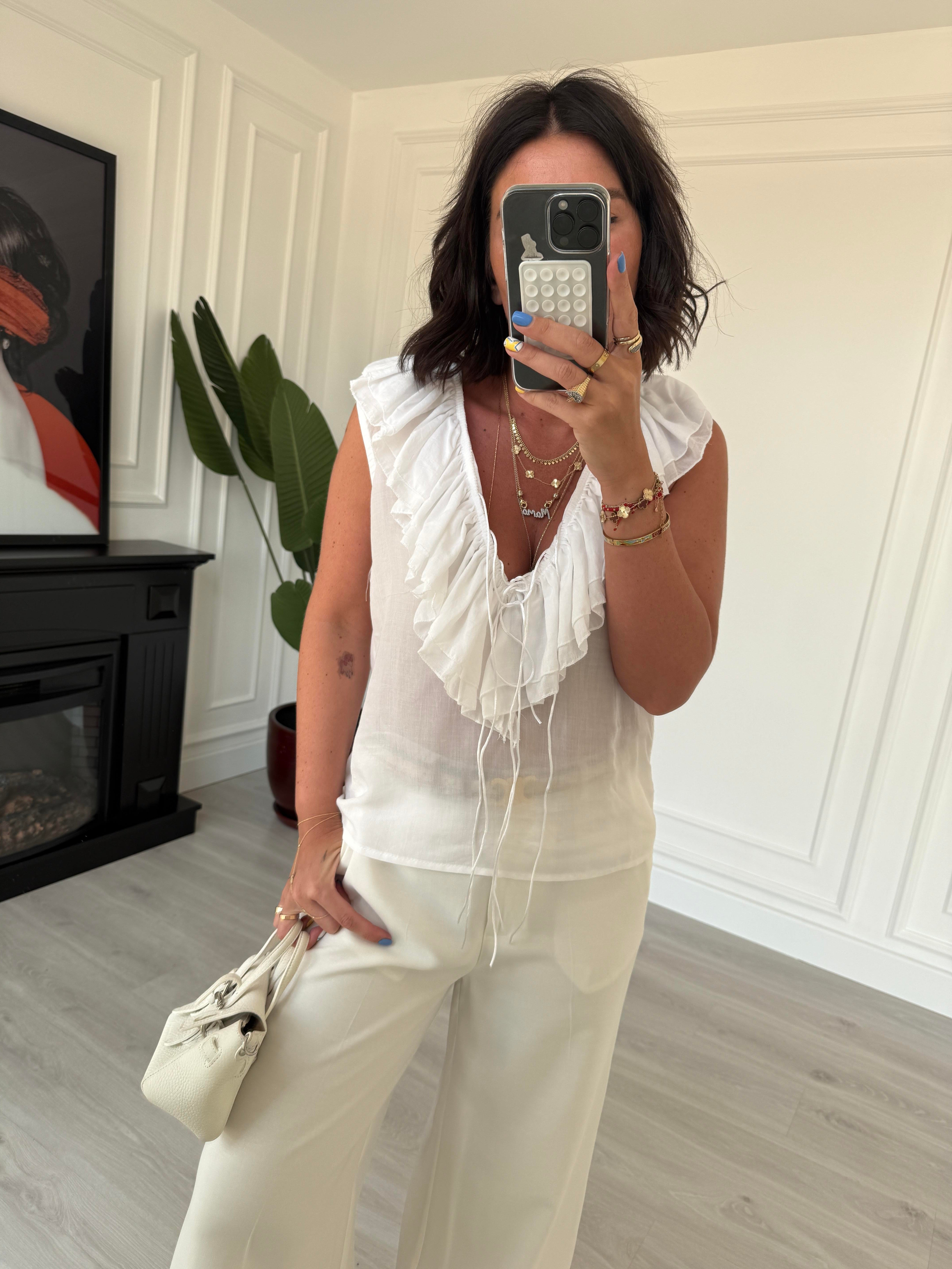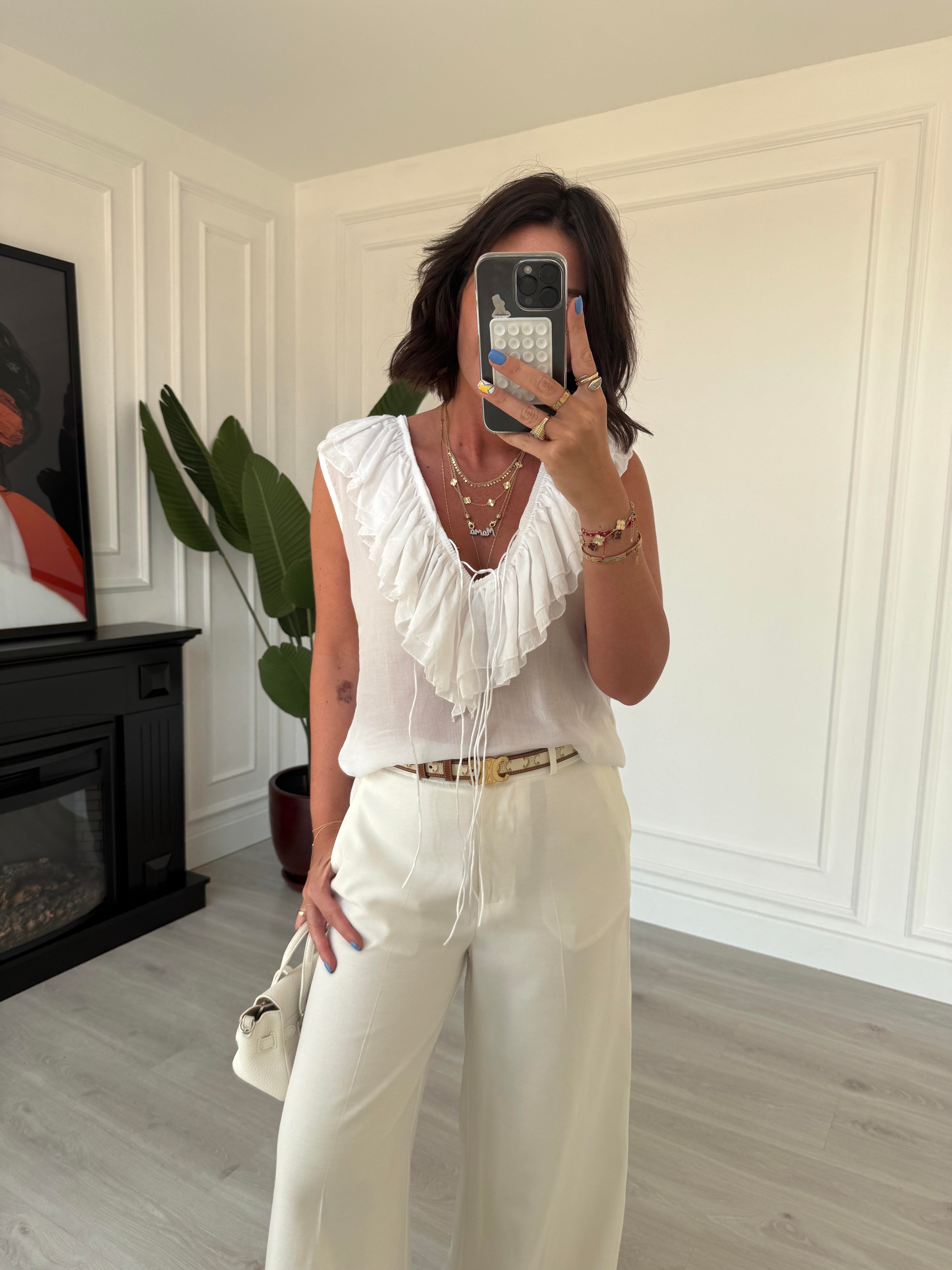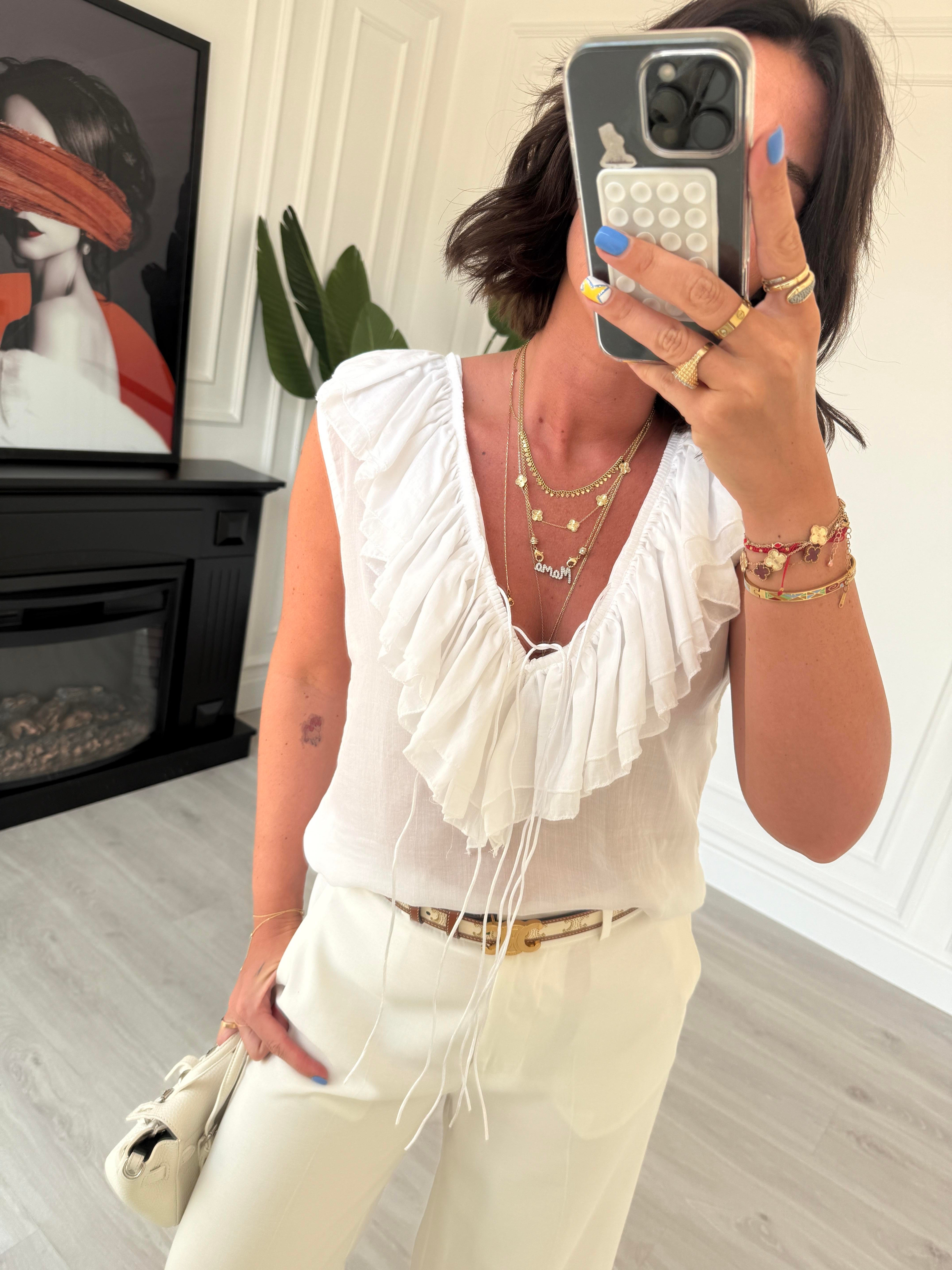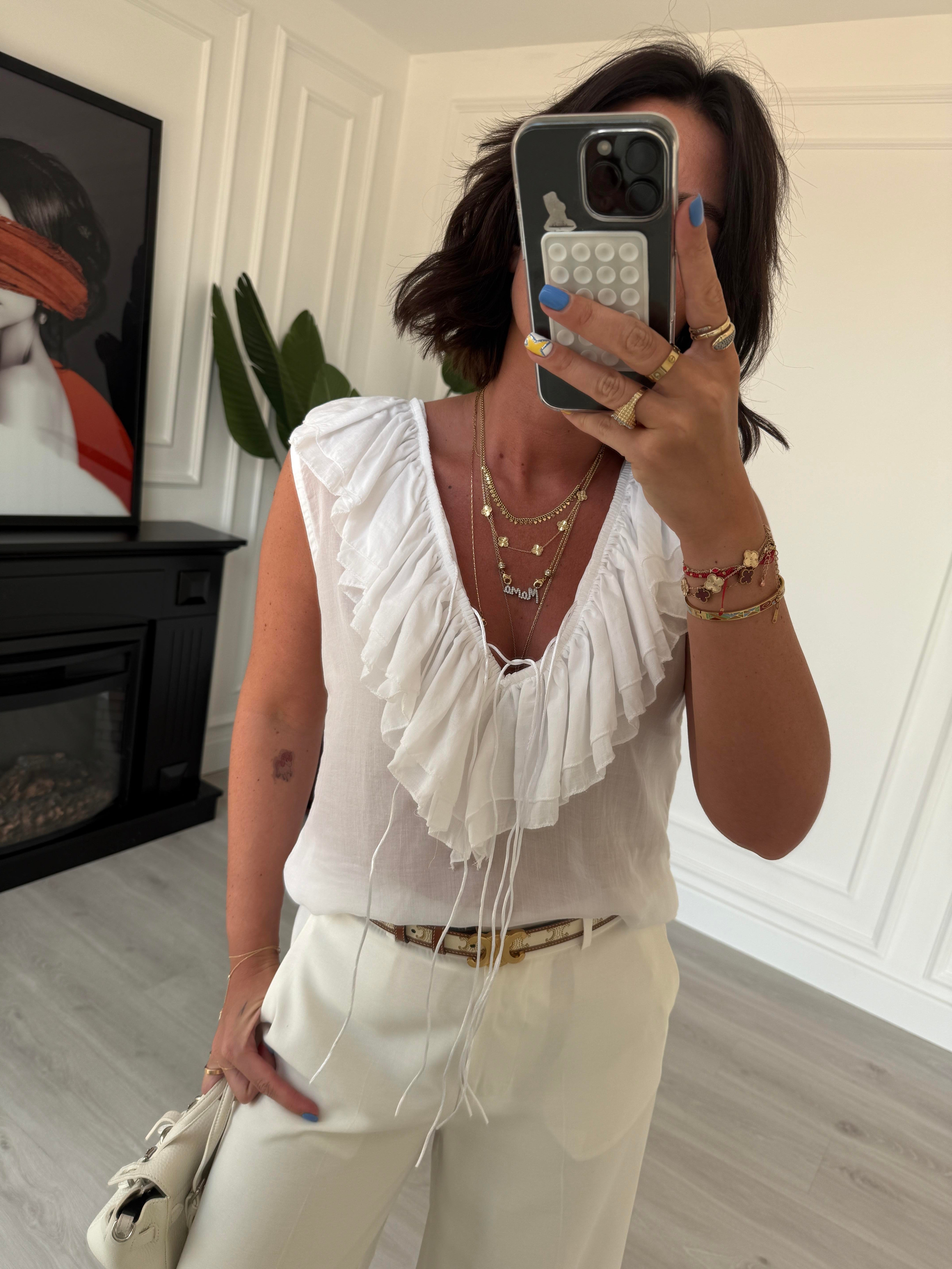 Fırfır Detaylı , Premium Seri , Beyaz , Kolsuz Bluz