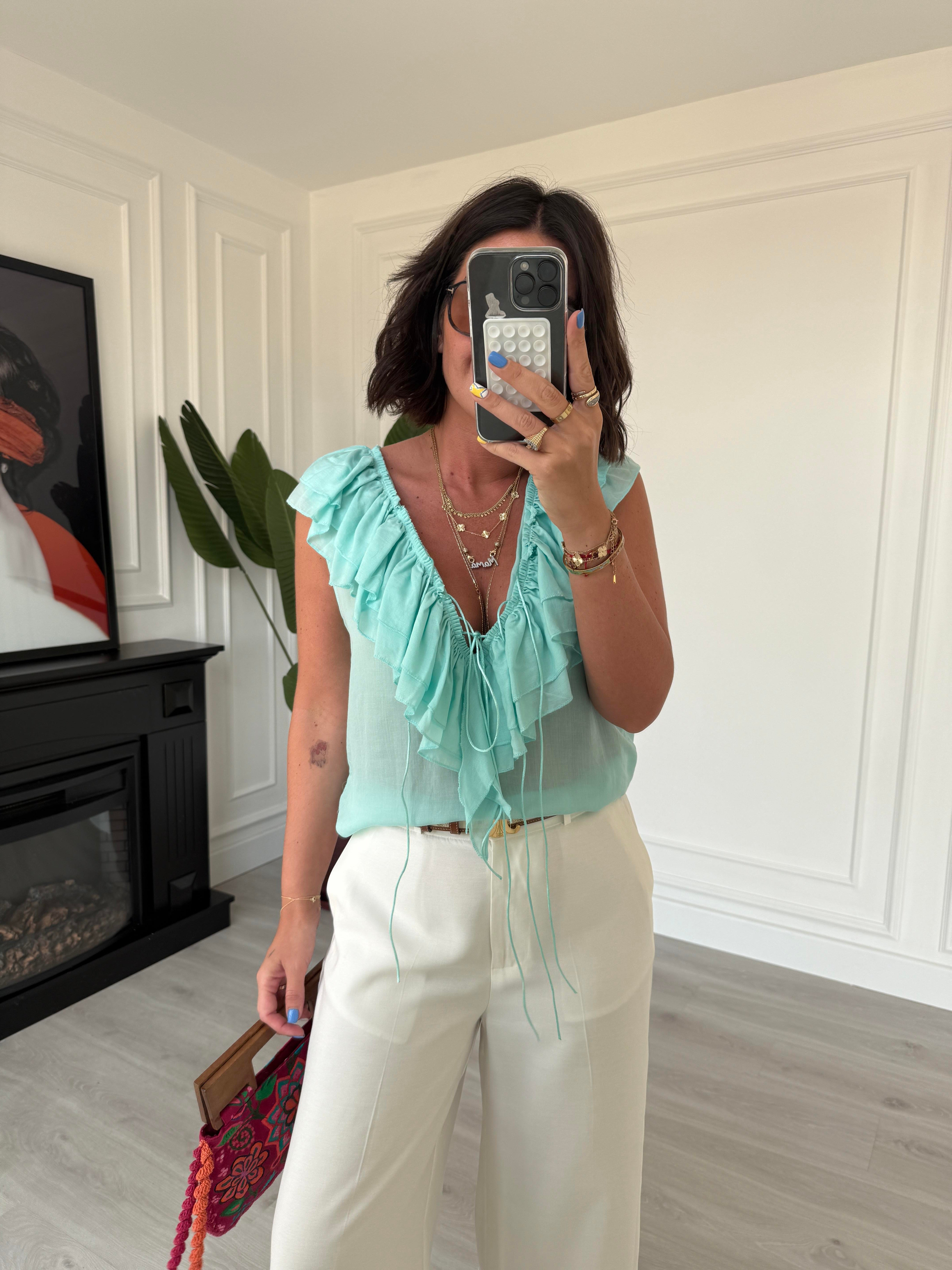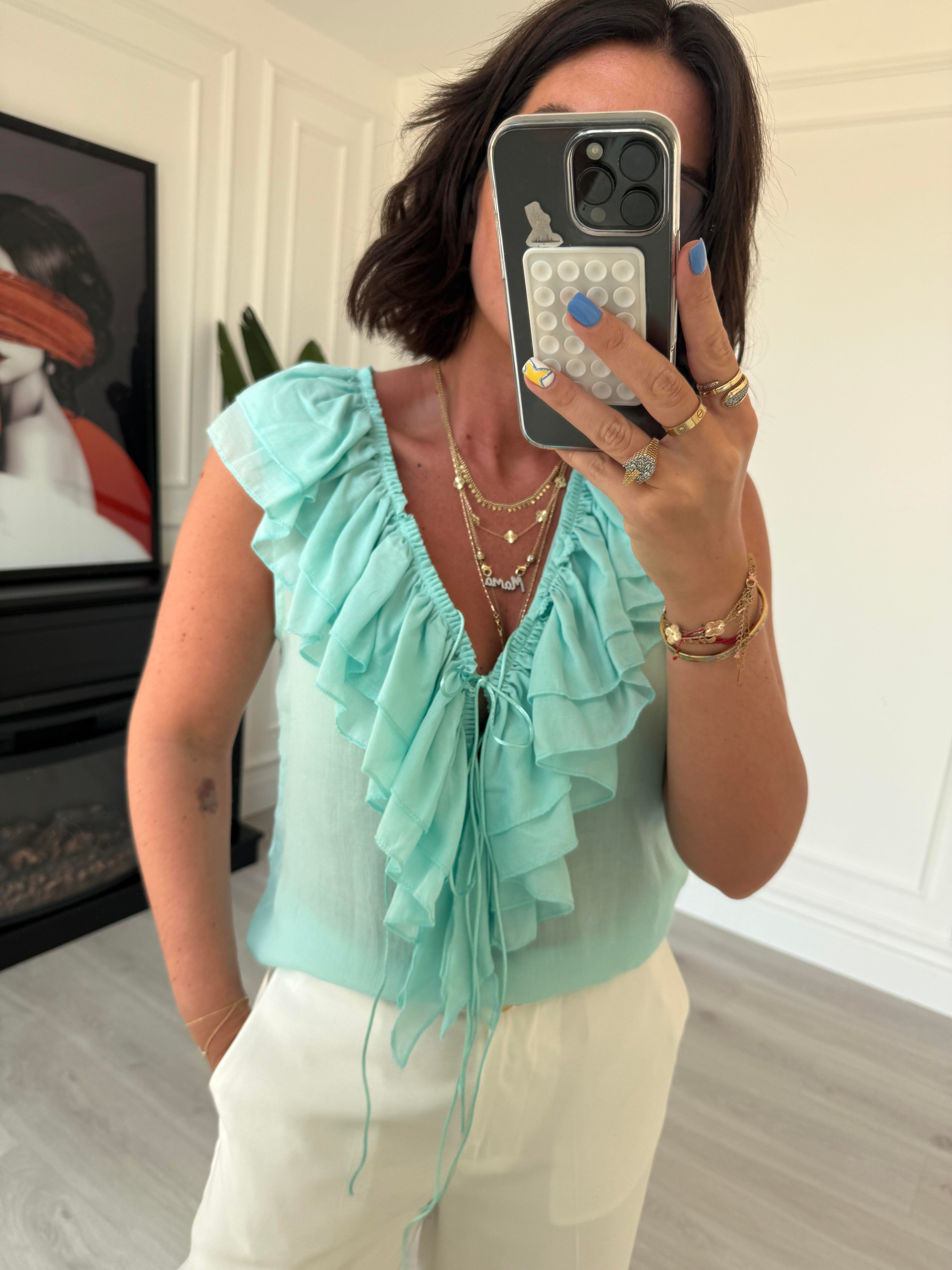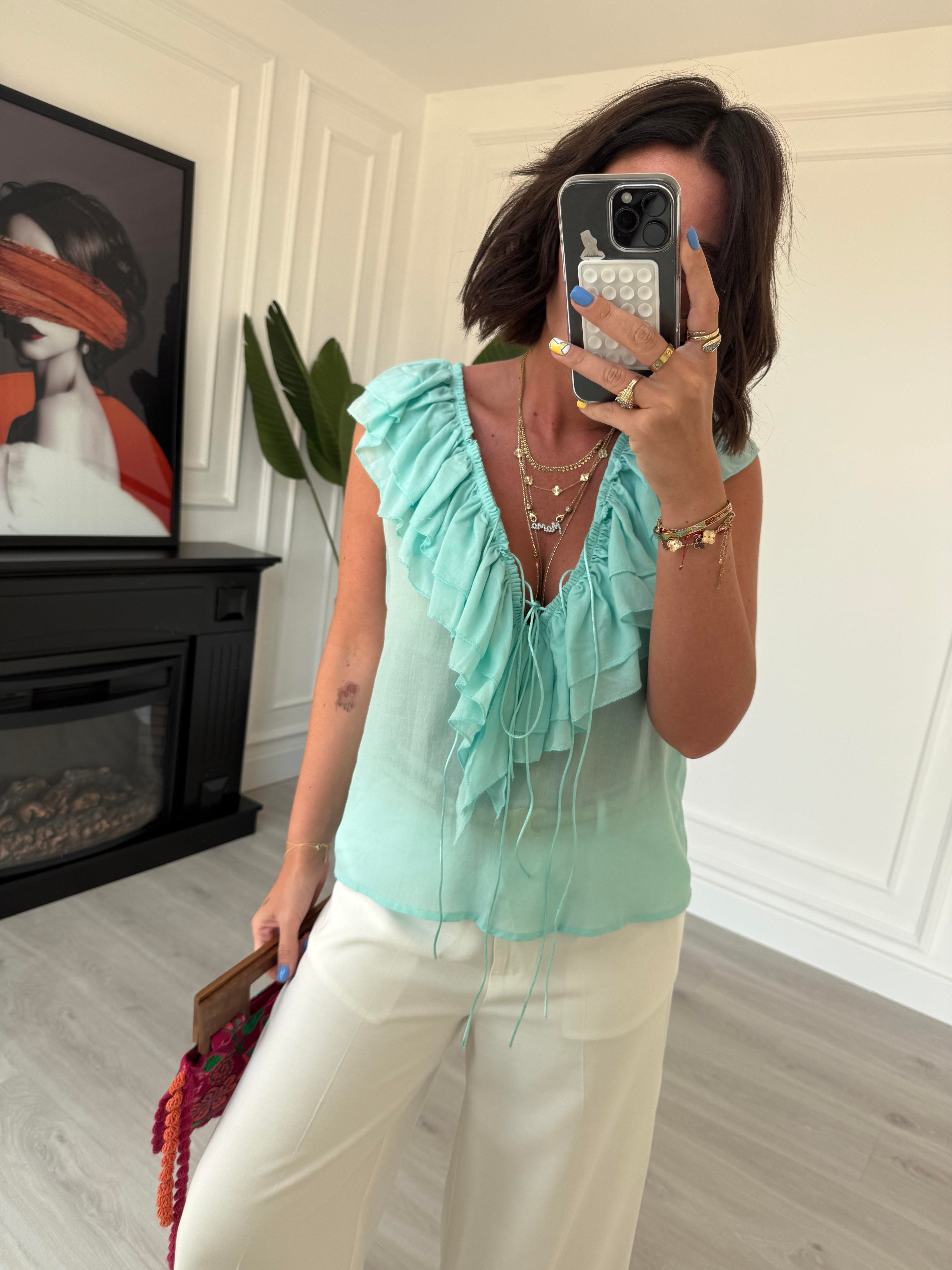 Fırfır Detaylı , Premium Seri , Su Yeşili , Kolsuz Bluz