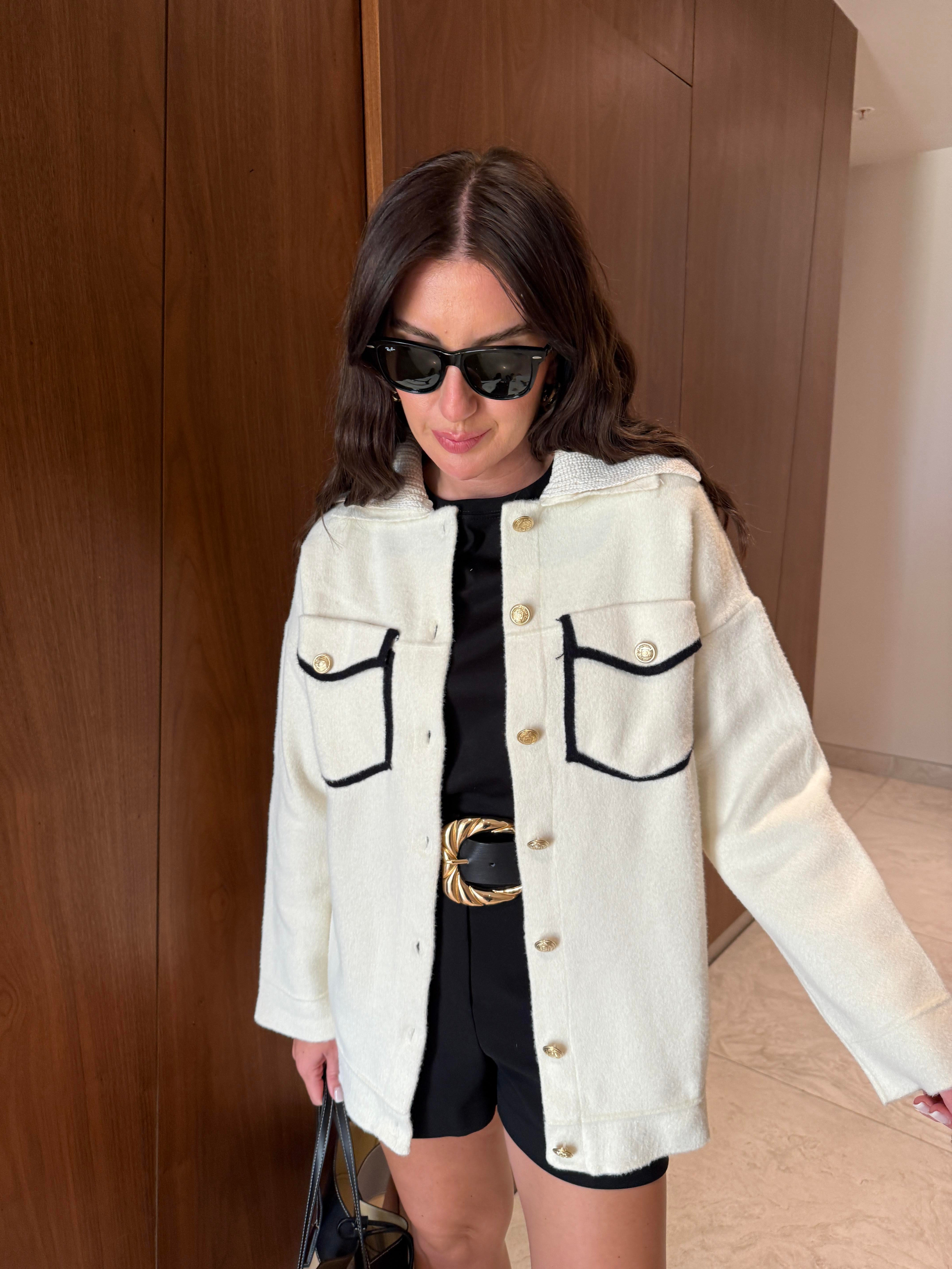 Gold Düğmeli , Çıkarılabilir Yakalı , Ekru , Kaşe Triko Ceket