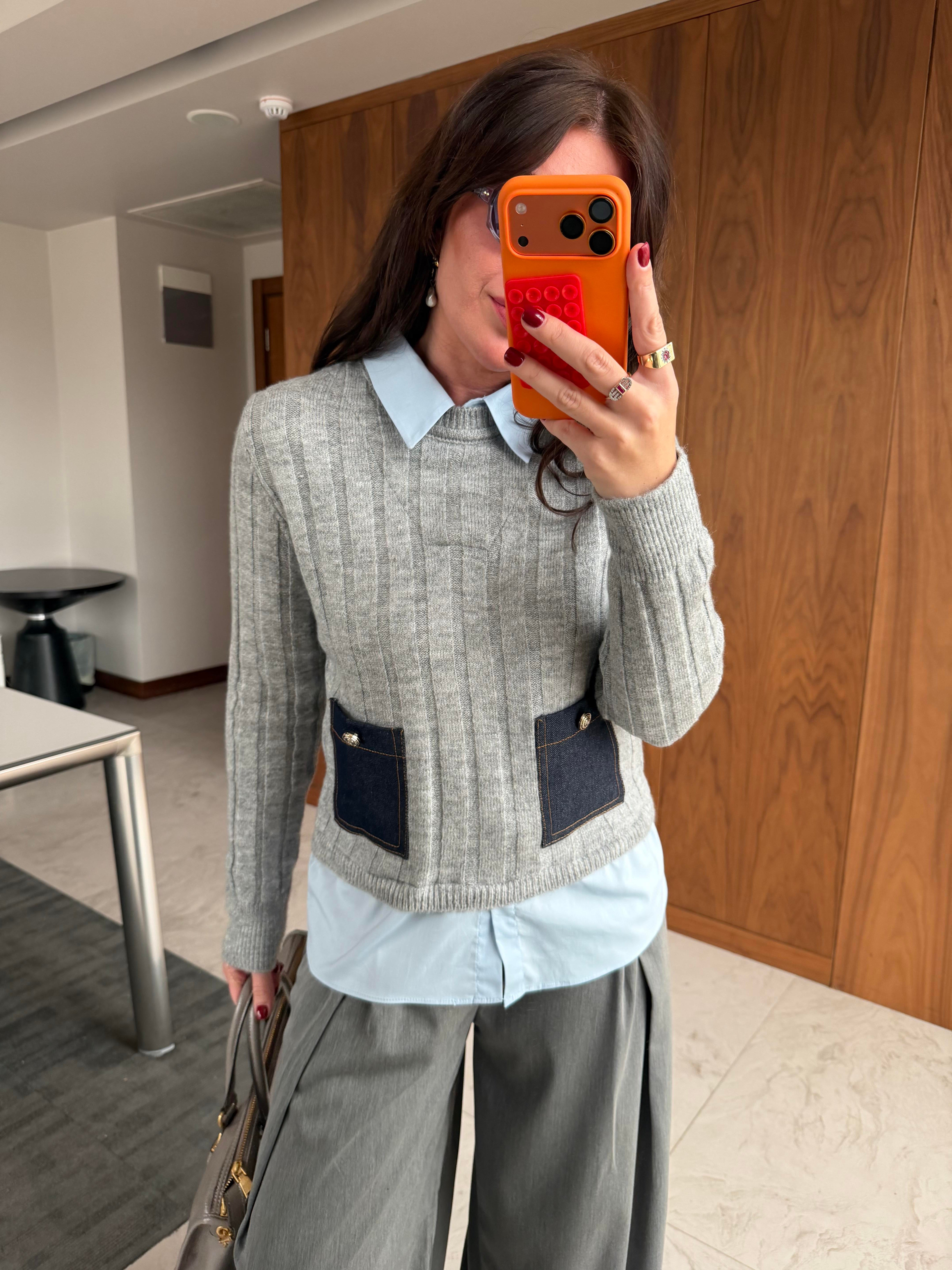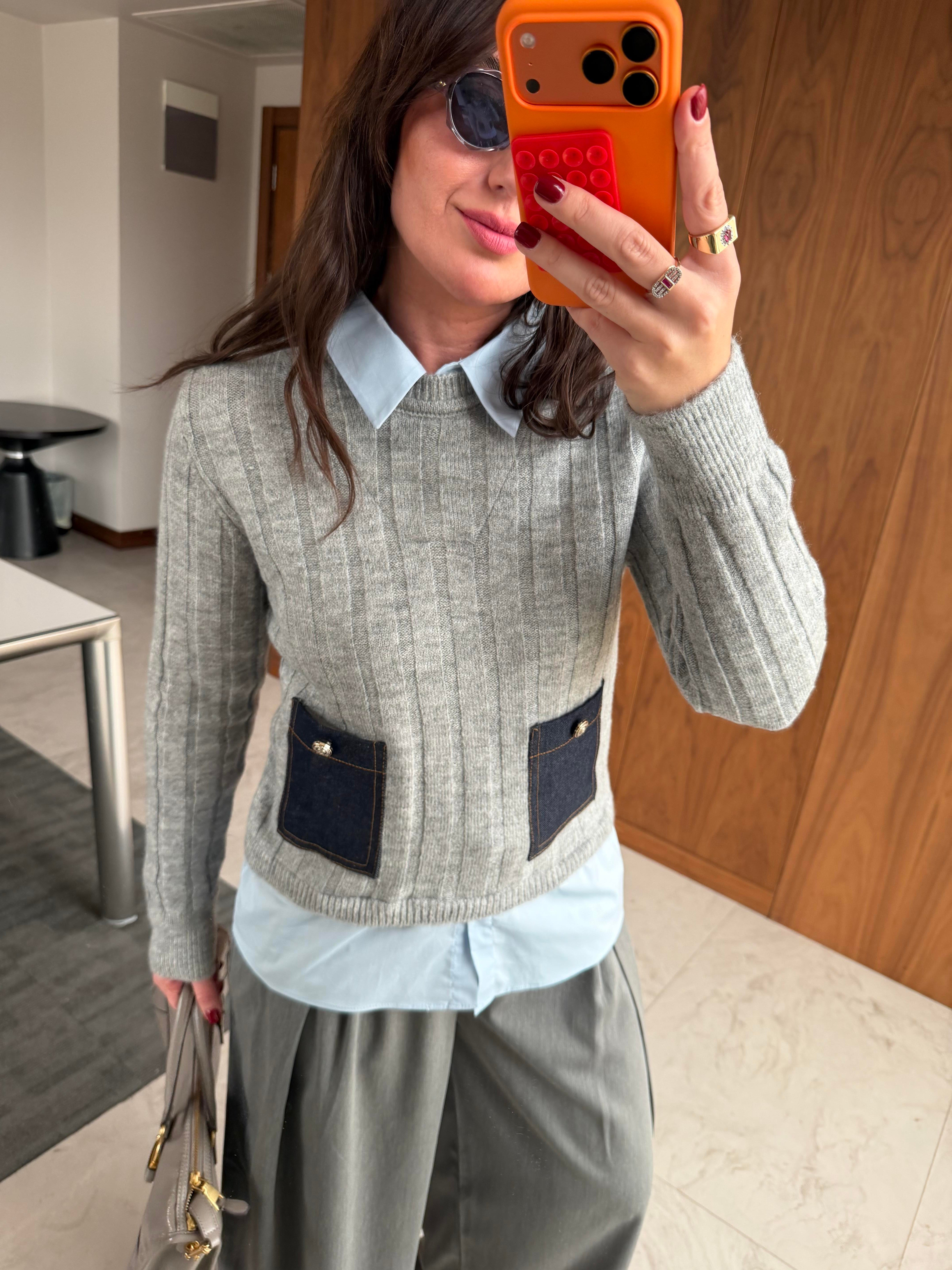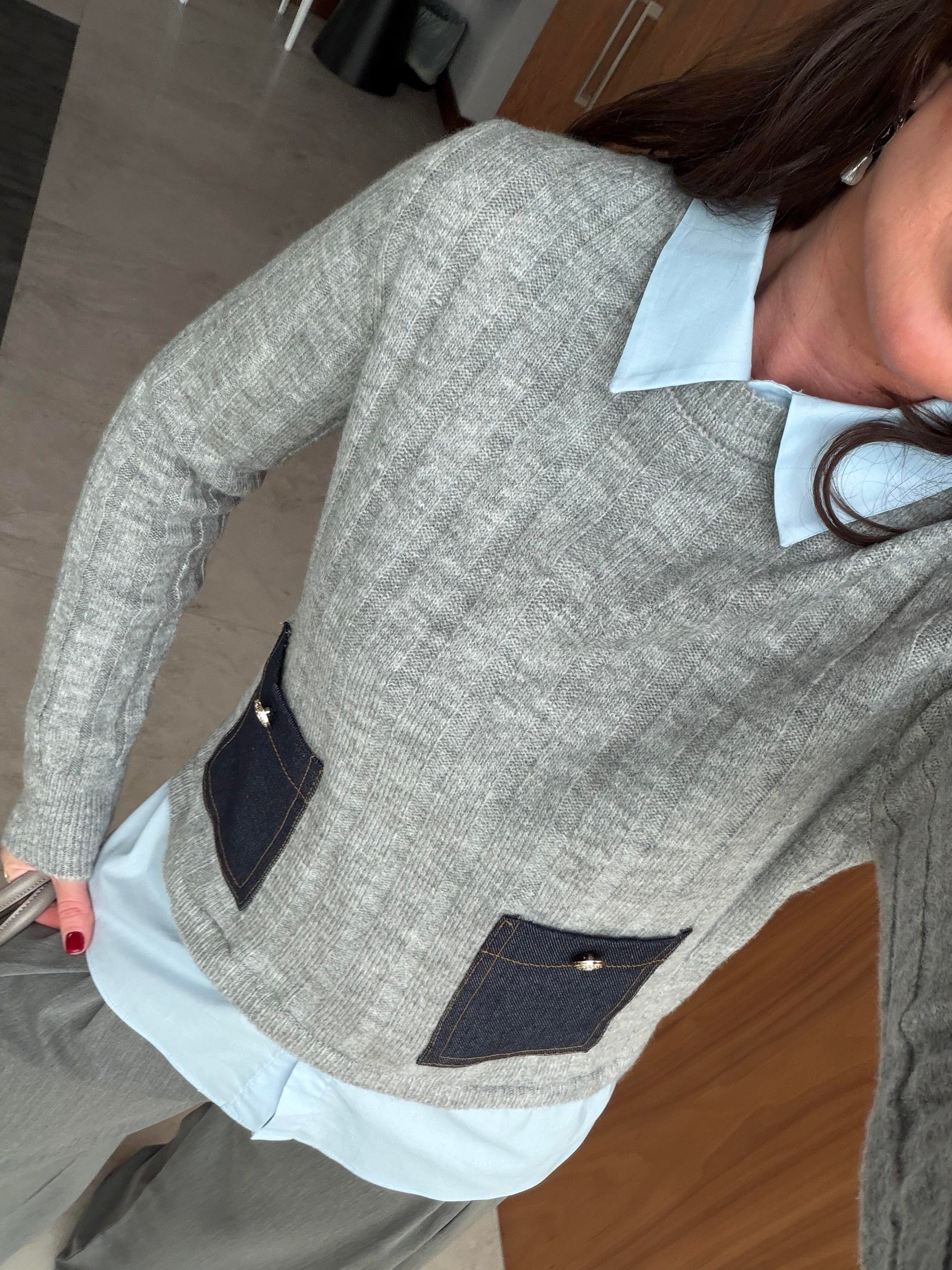 Gömlek Detaylı Gri Triko Gömlek Detaylı Lacivert Triko