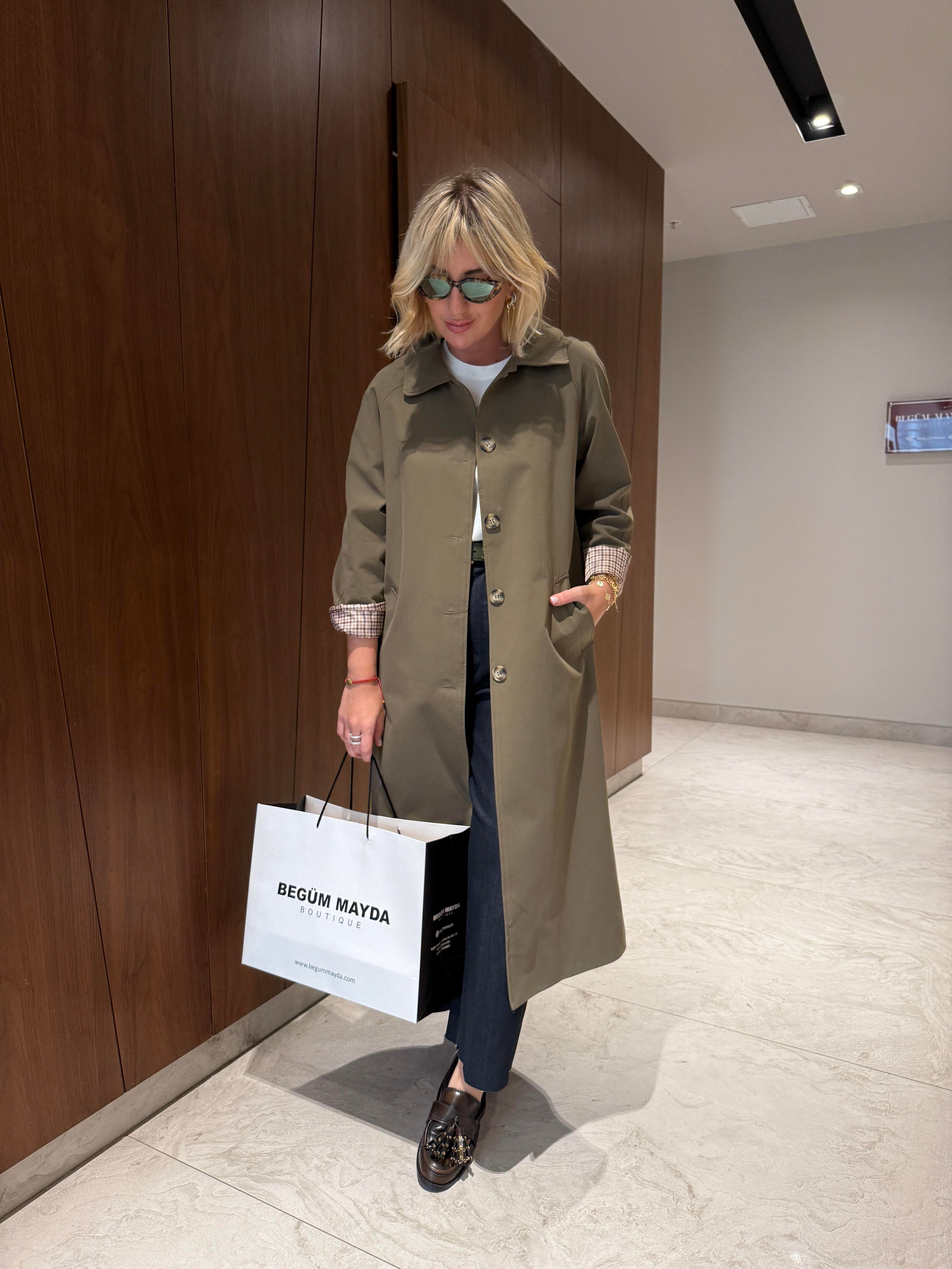 İçi Ekose Astarlı , Haki , Premium Trençkot