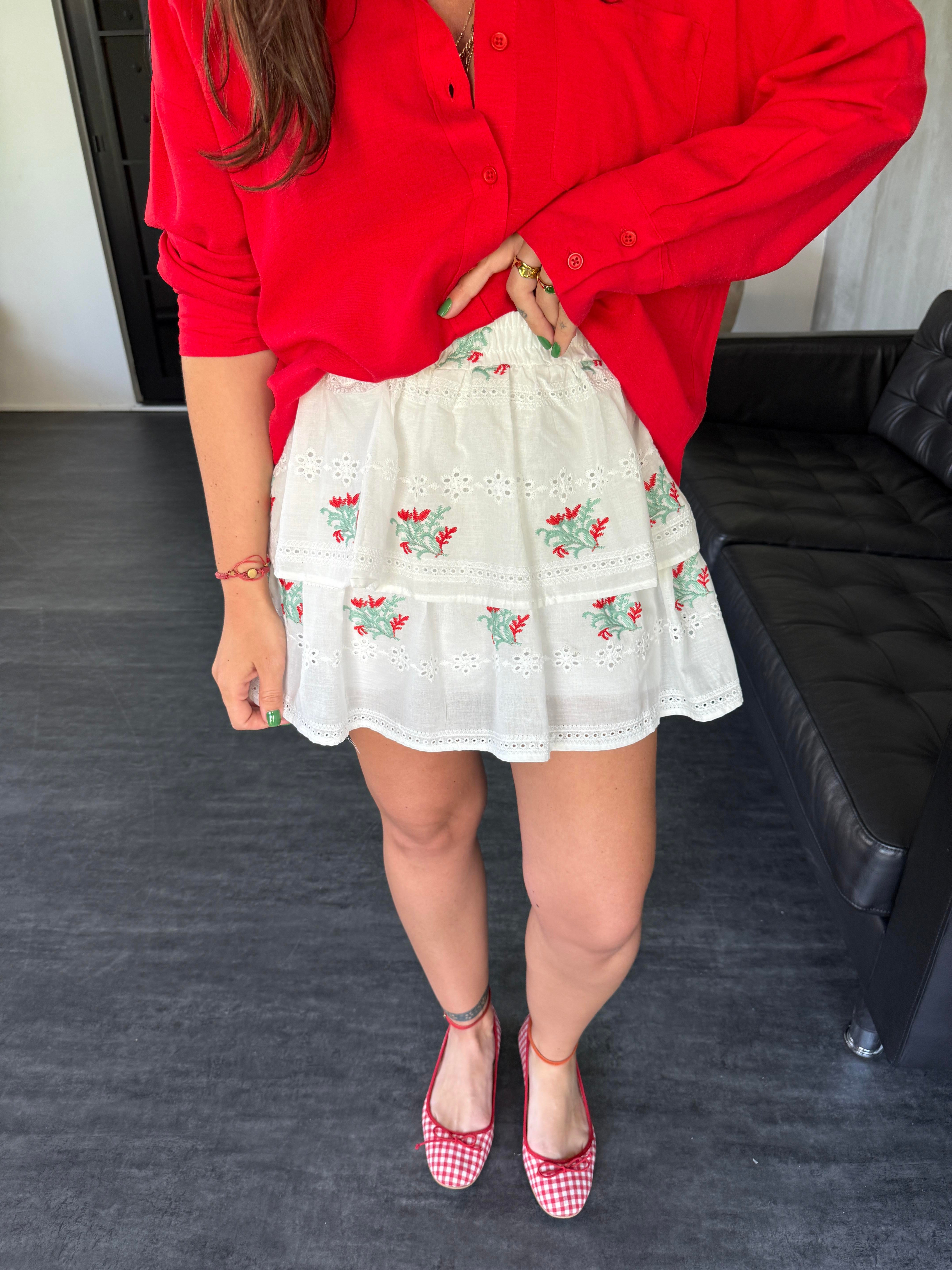 Kırmızı Çiçek İşlemeli , Fistolu Etek