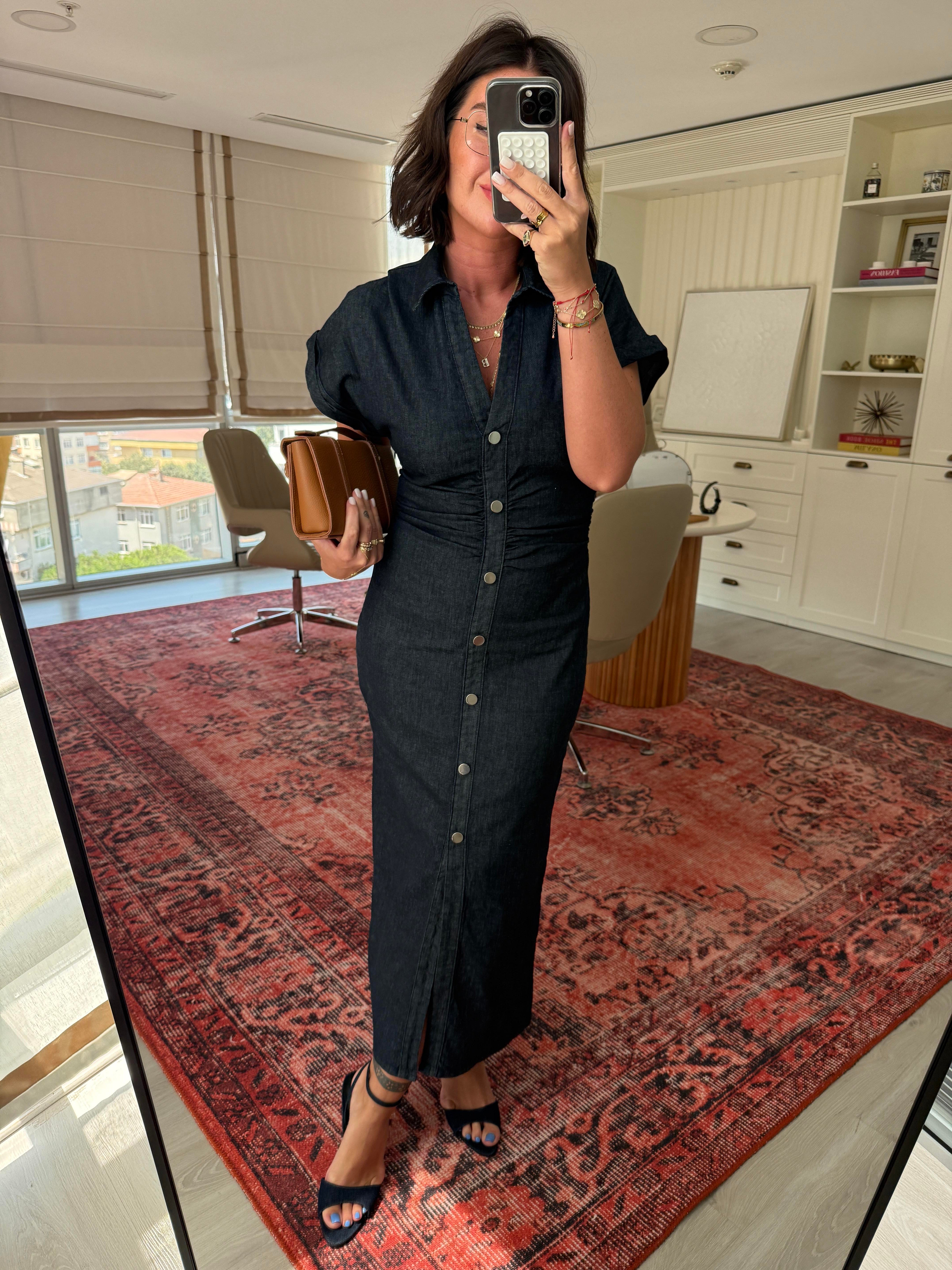 Likralı , Önden Düğmeli , Jean Elbise (lo533elb-7101)
