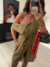 Omuz Dekolteli Haki Tasarım Keten Takım