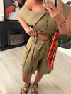 Omuz Dekolteli Haki Tasarım Keten Takım (f78392)