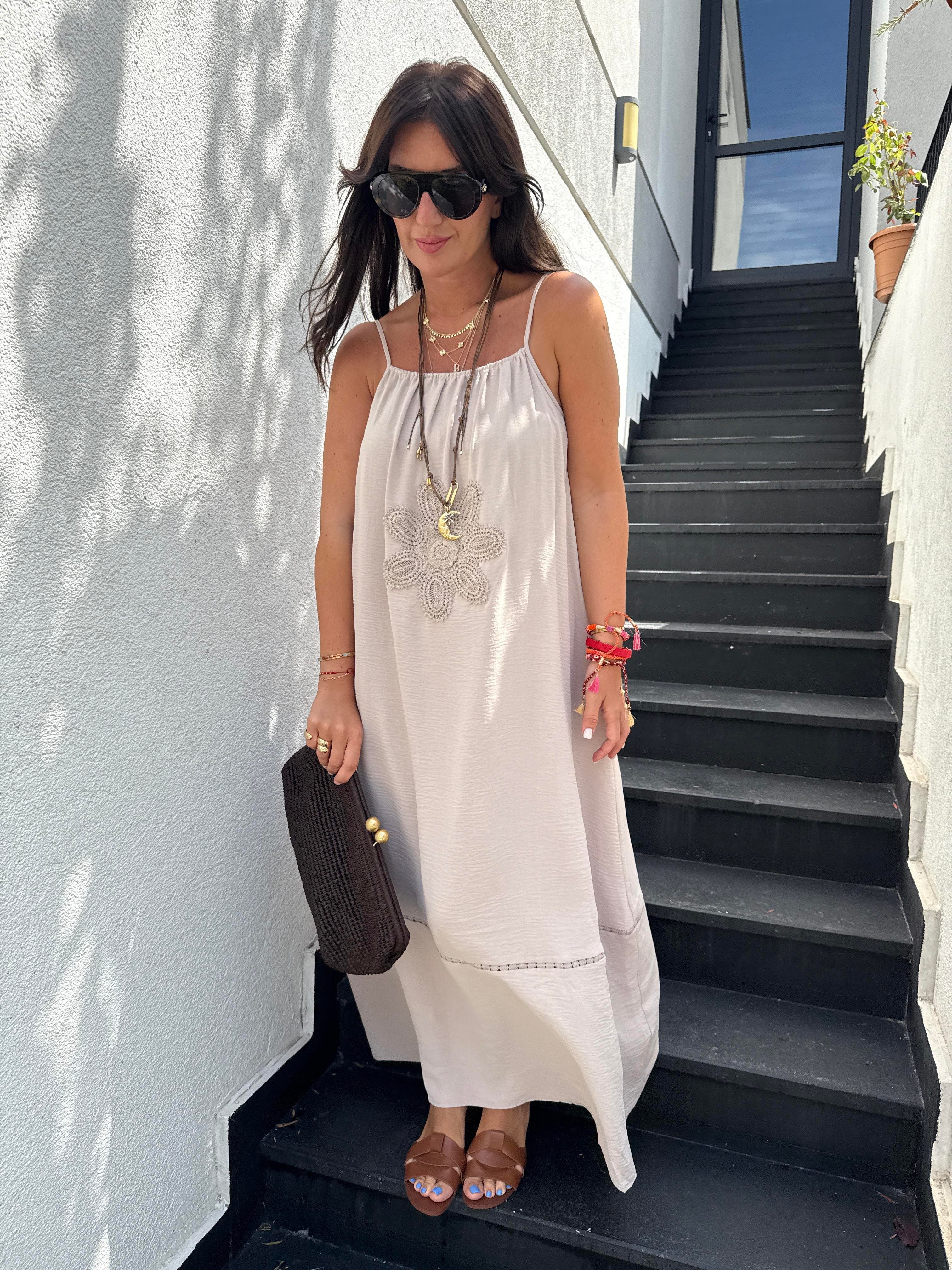 Önü Örgü Çiçekli , Bej , Askılı Elbise