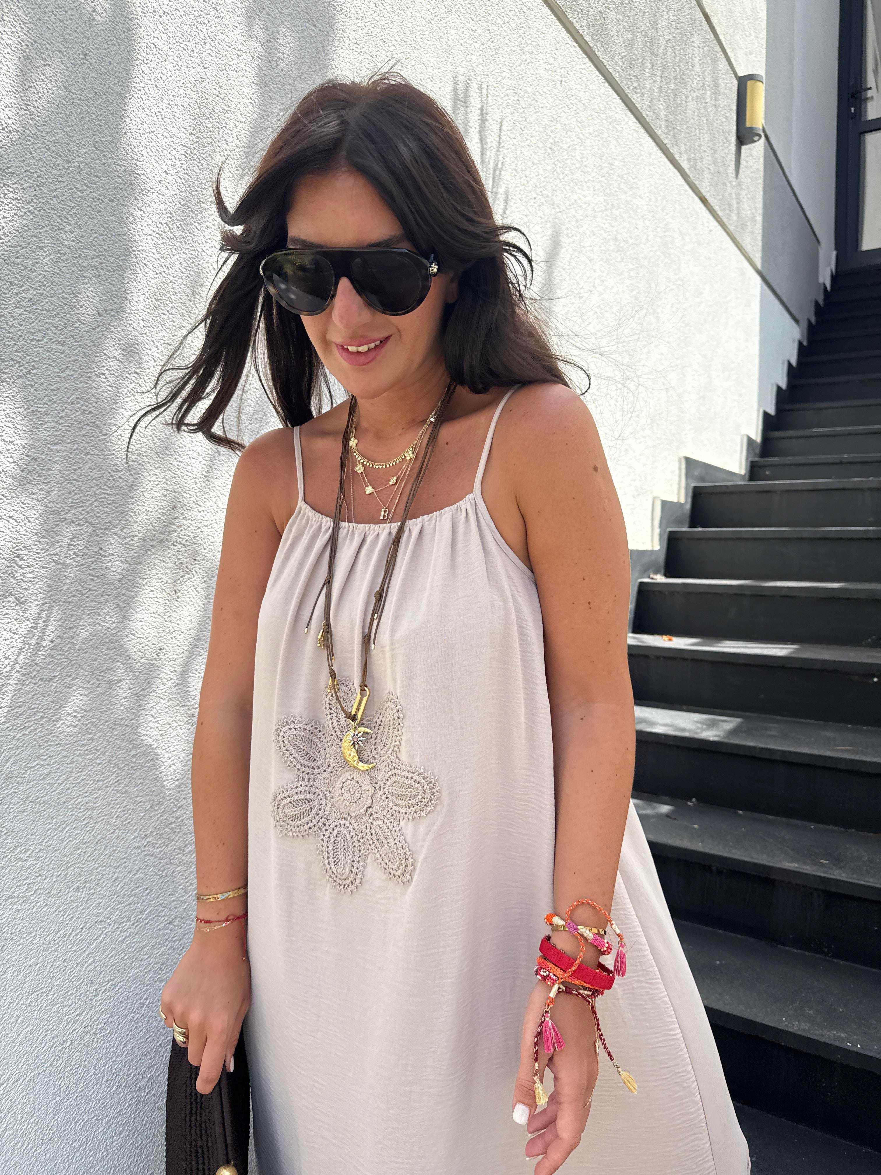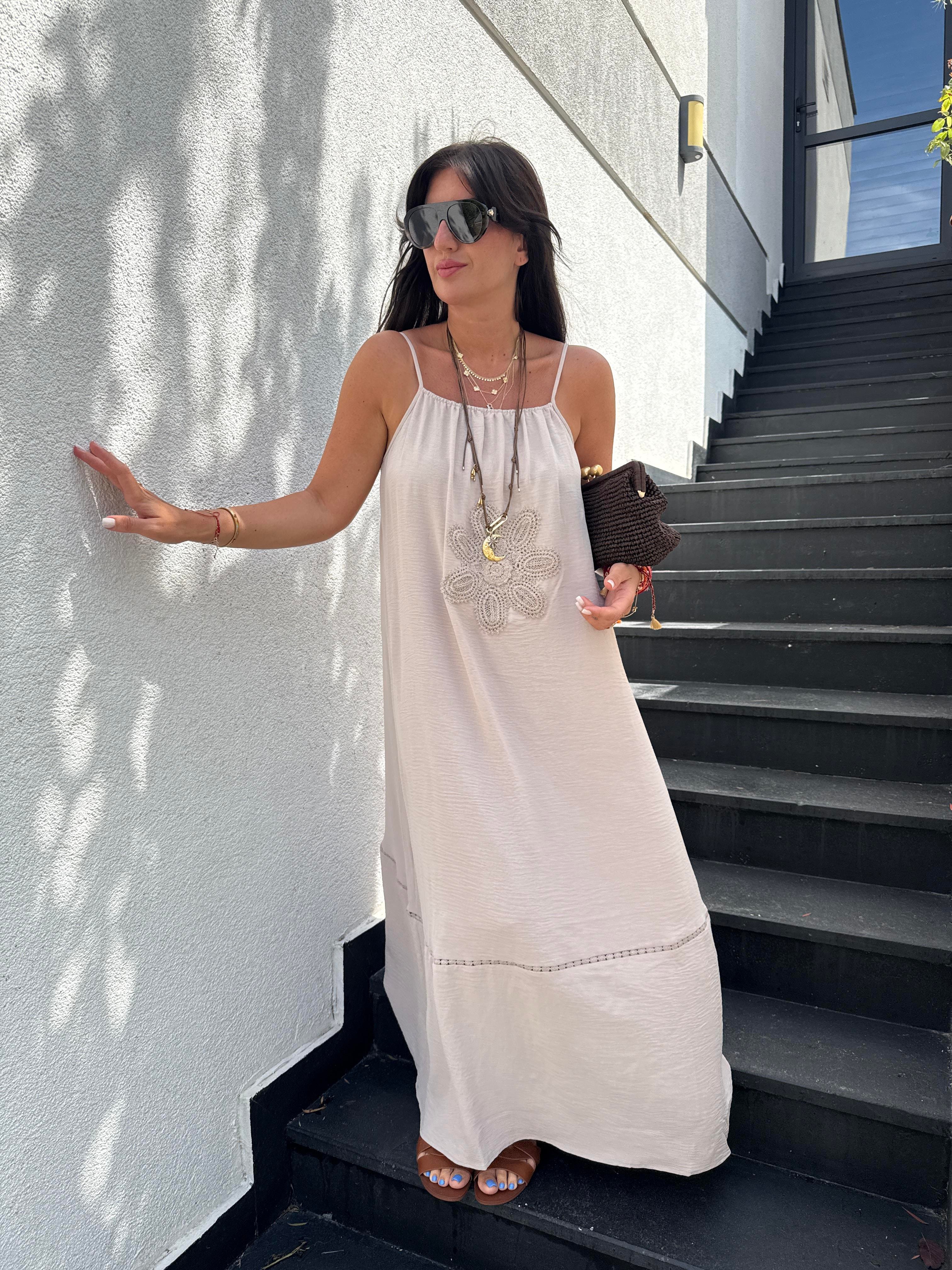 Önü Örgü Çiçekli , Bej , Askılı Elbise (she433elb-7143)