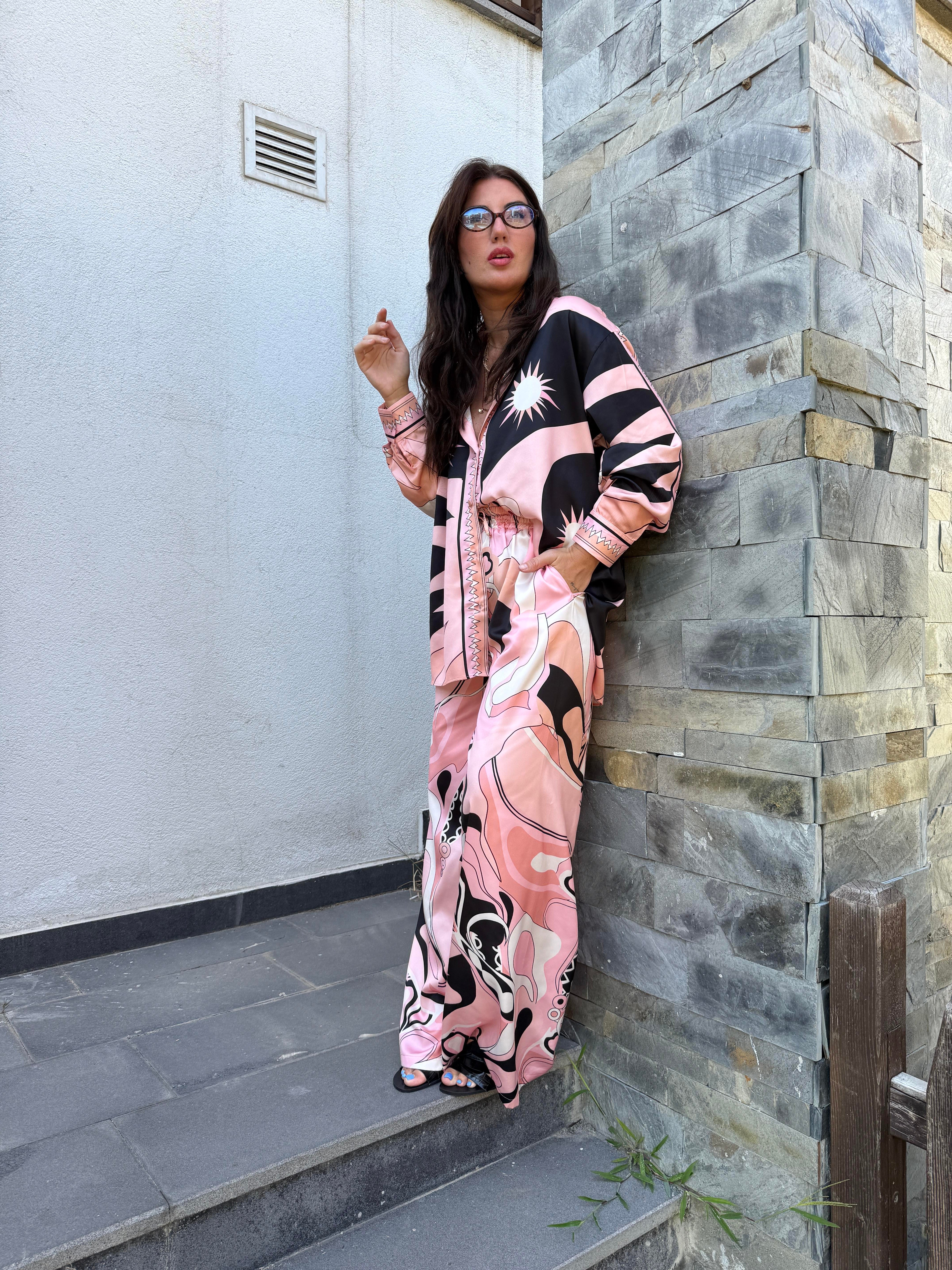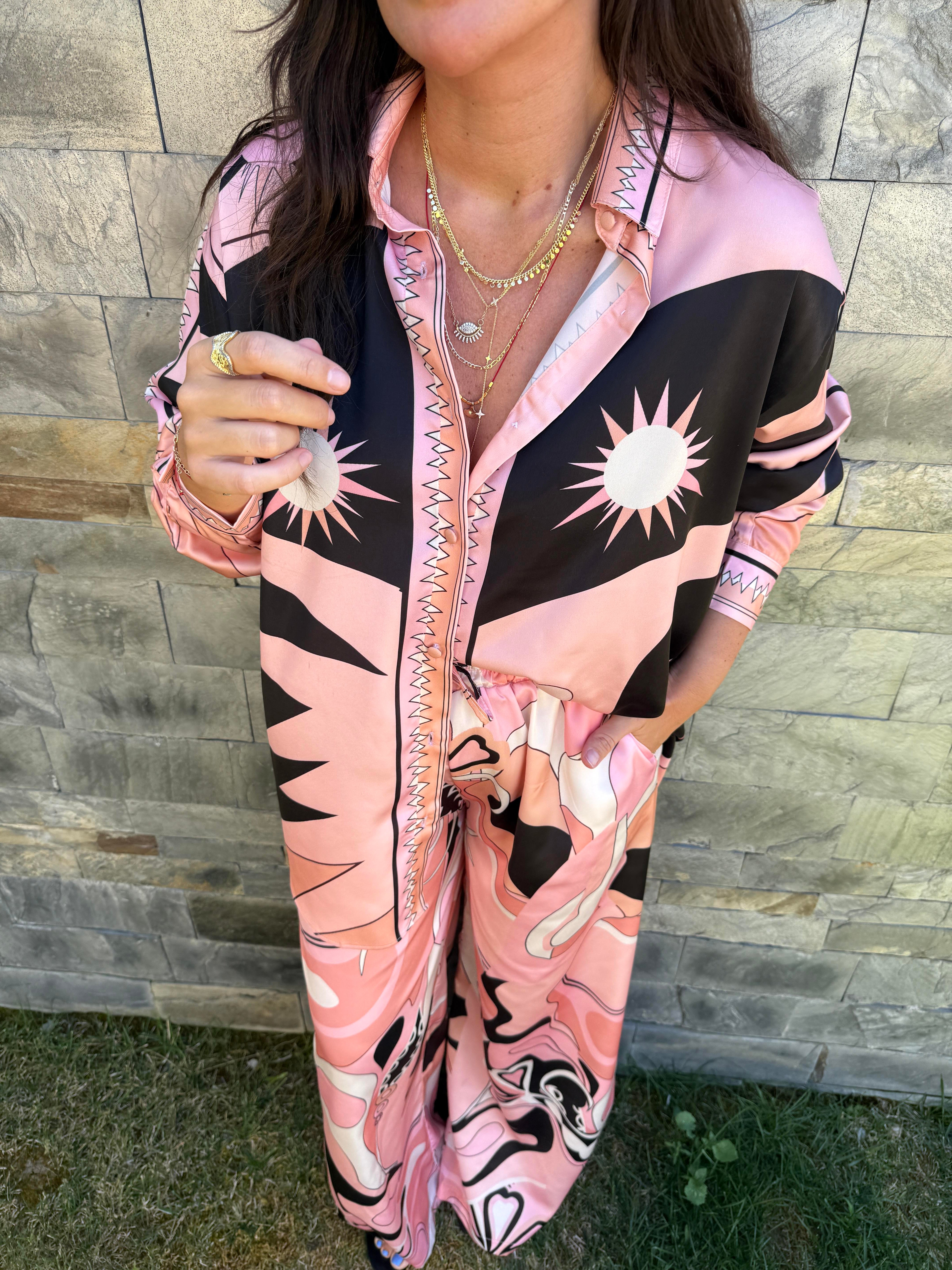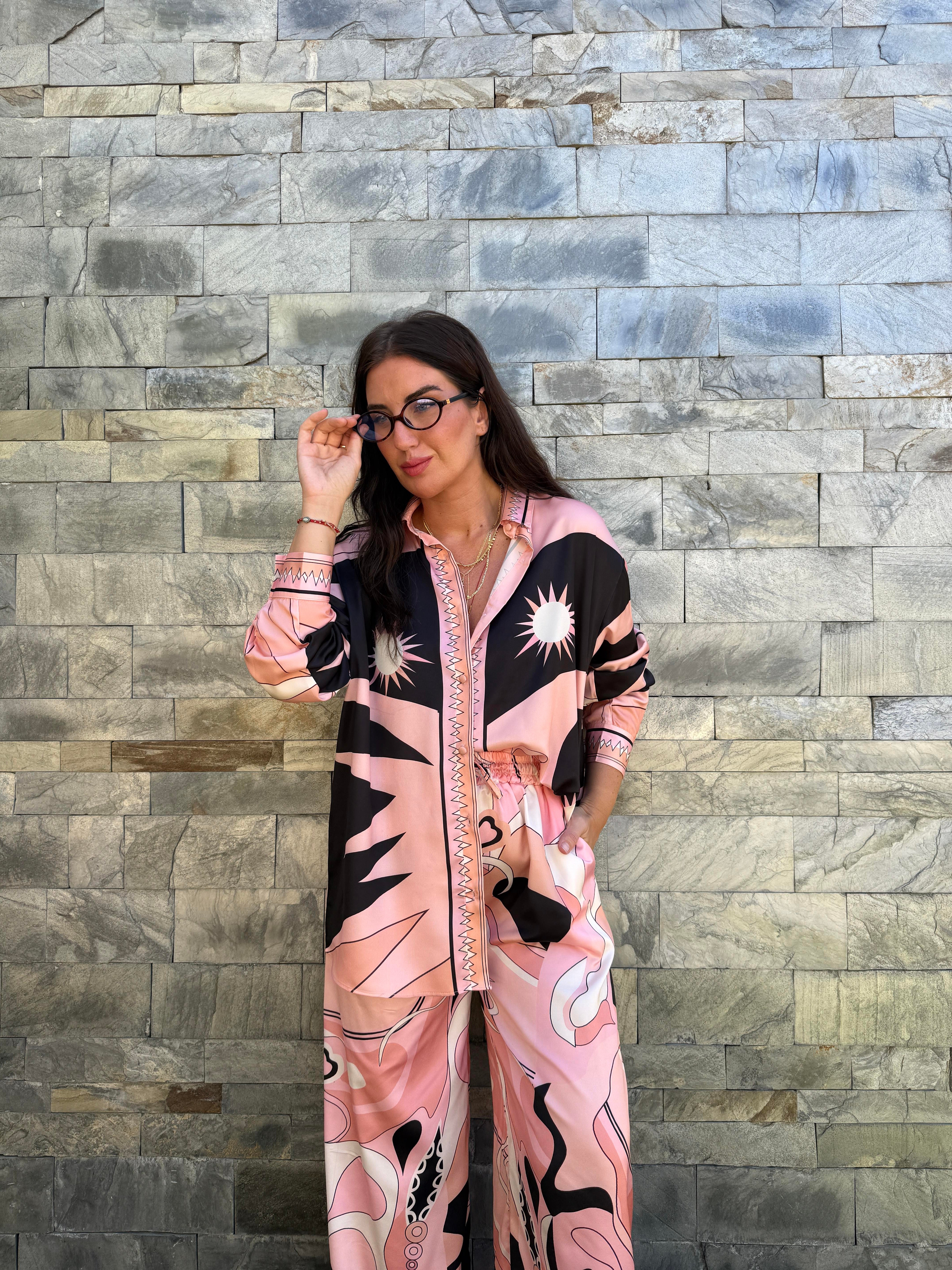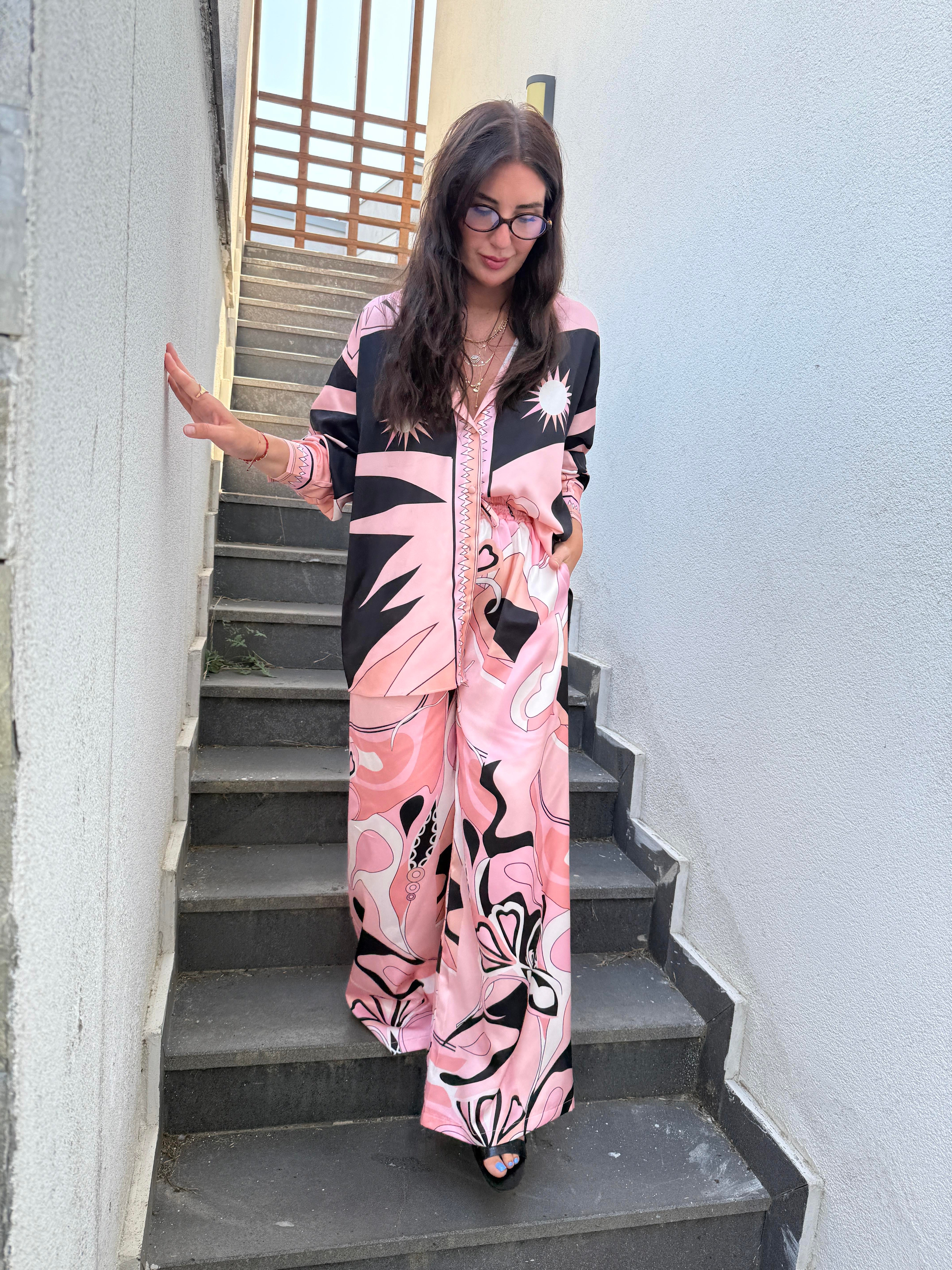 Orijinal Model , Beli Lastikli , Pantolon & Gömlek , Desenli , Pembe Saten Takım