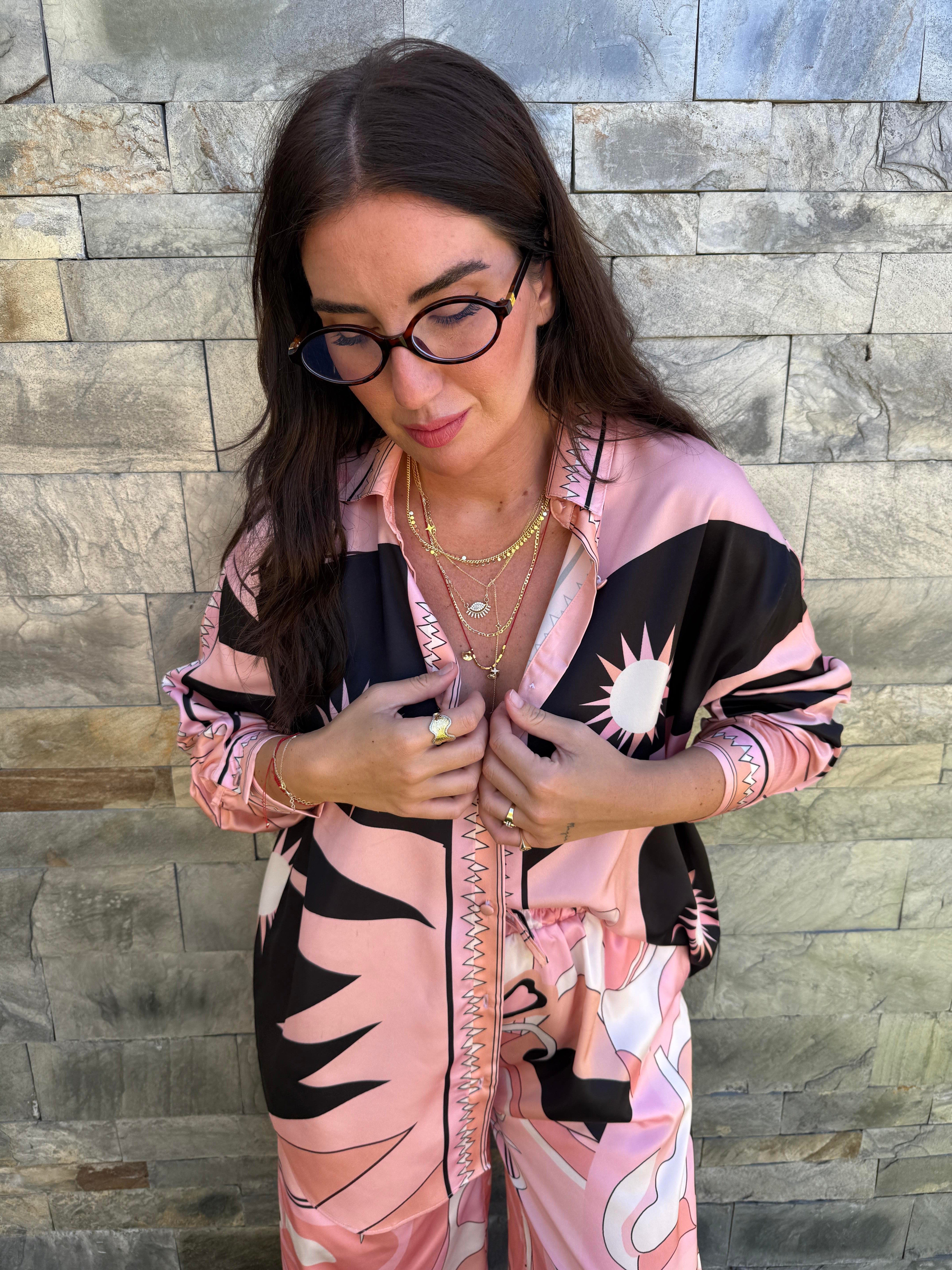 Orijinal Model , Beli Lastikli , Pantolon & Gömlek , Desenli , Pembe Saten Takım (pir324tkm -7381)