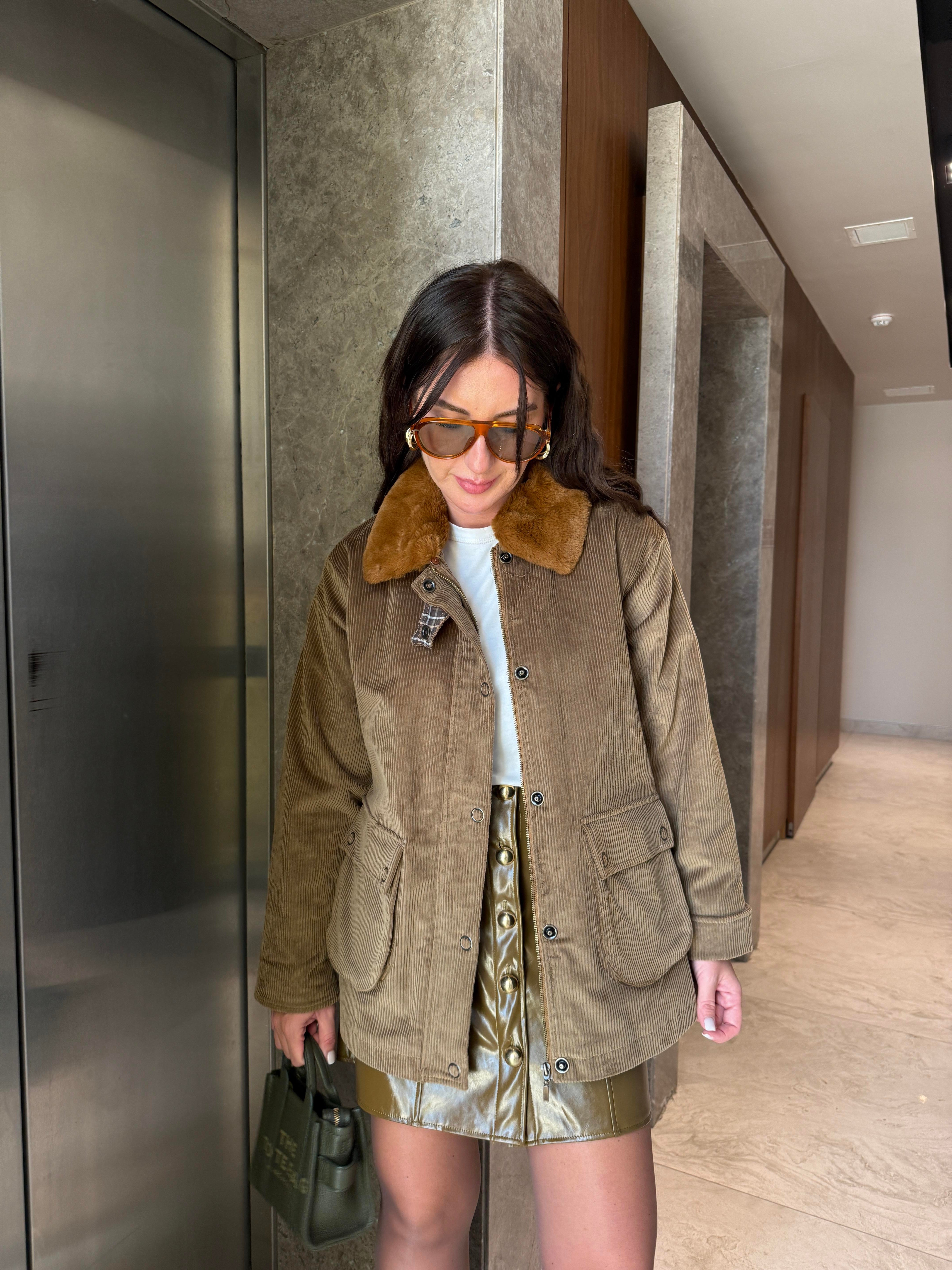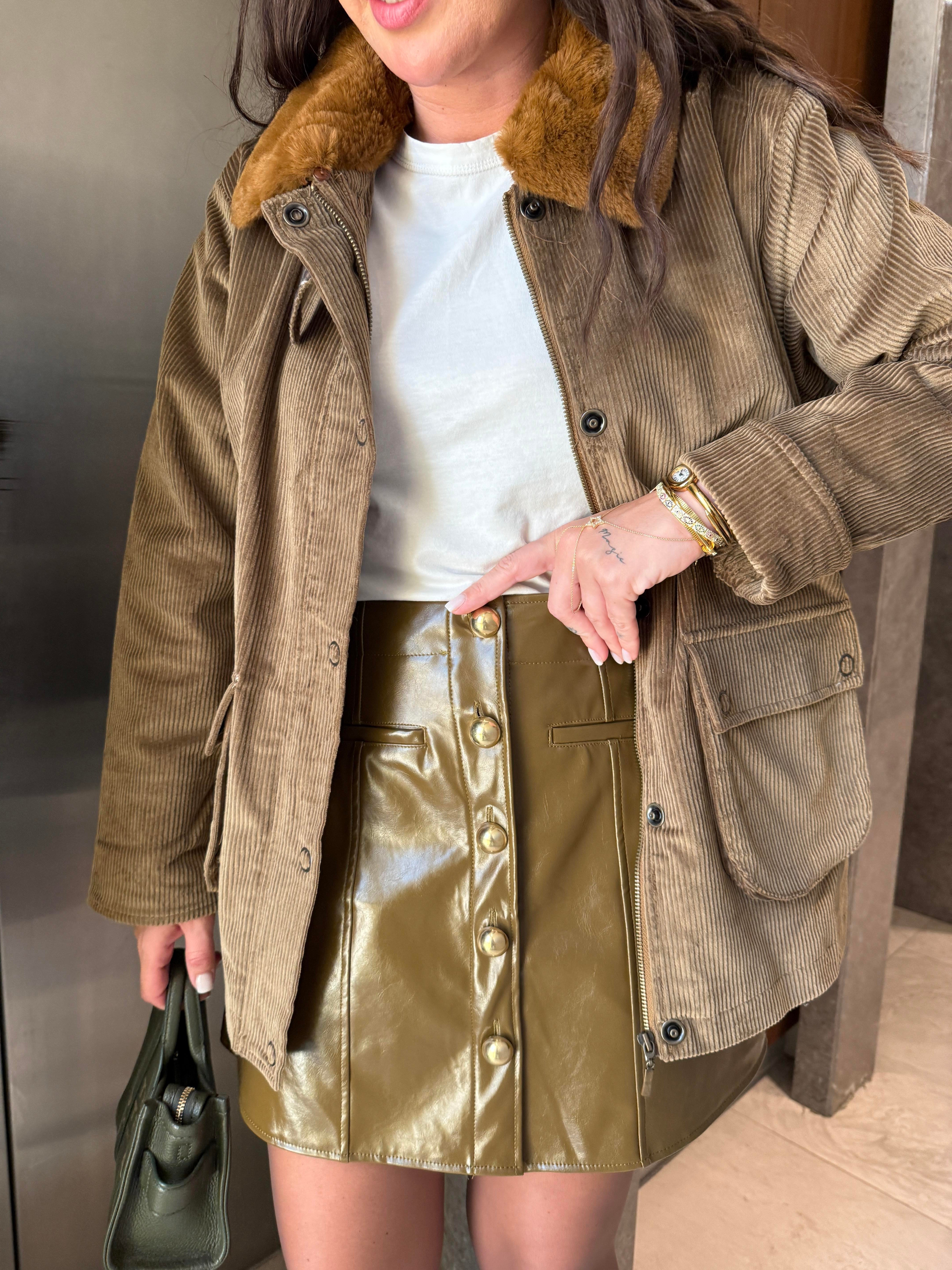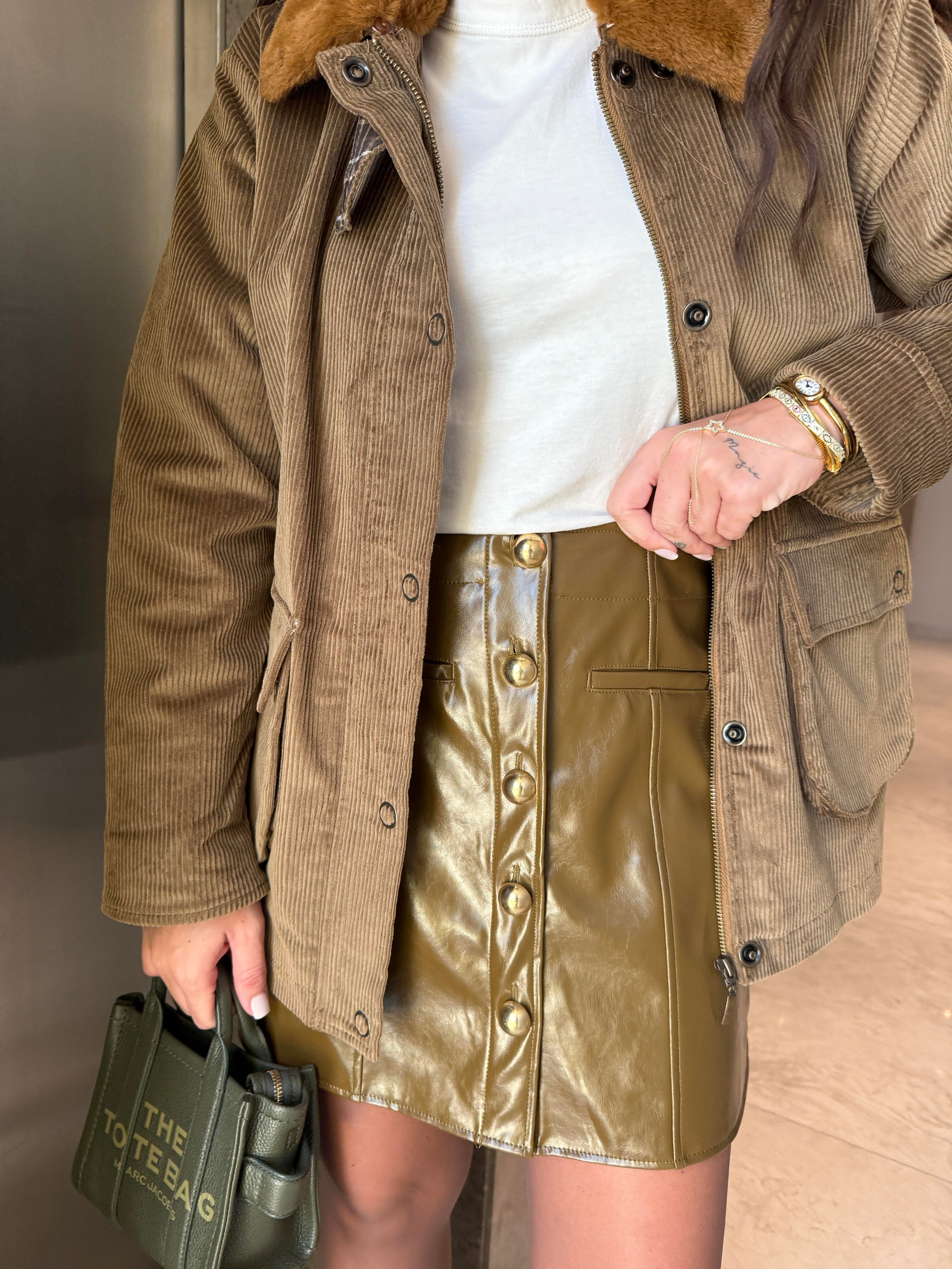 Orijinal Model , Önden Gold Düğmeli , Yağ Yeşili Deri Etek