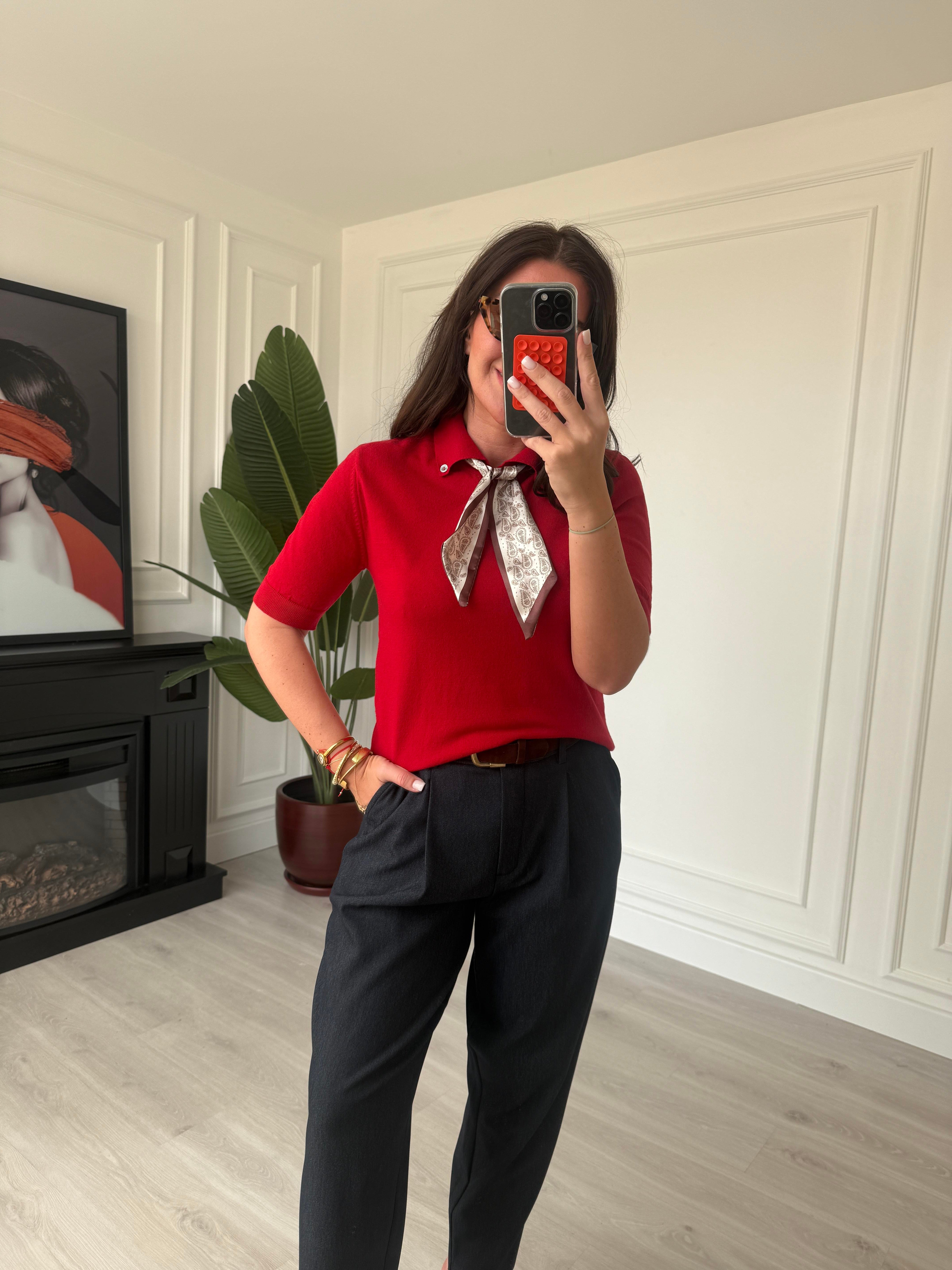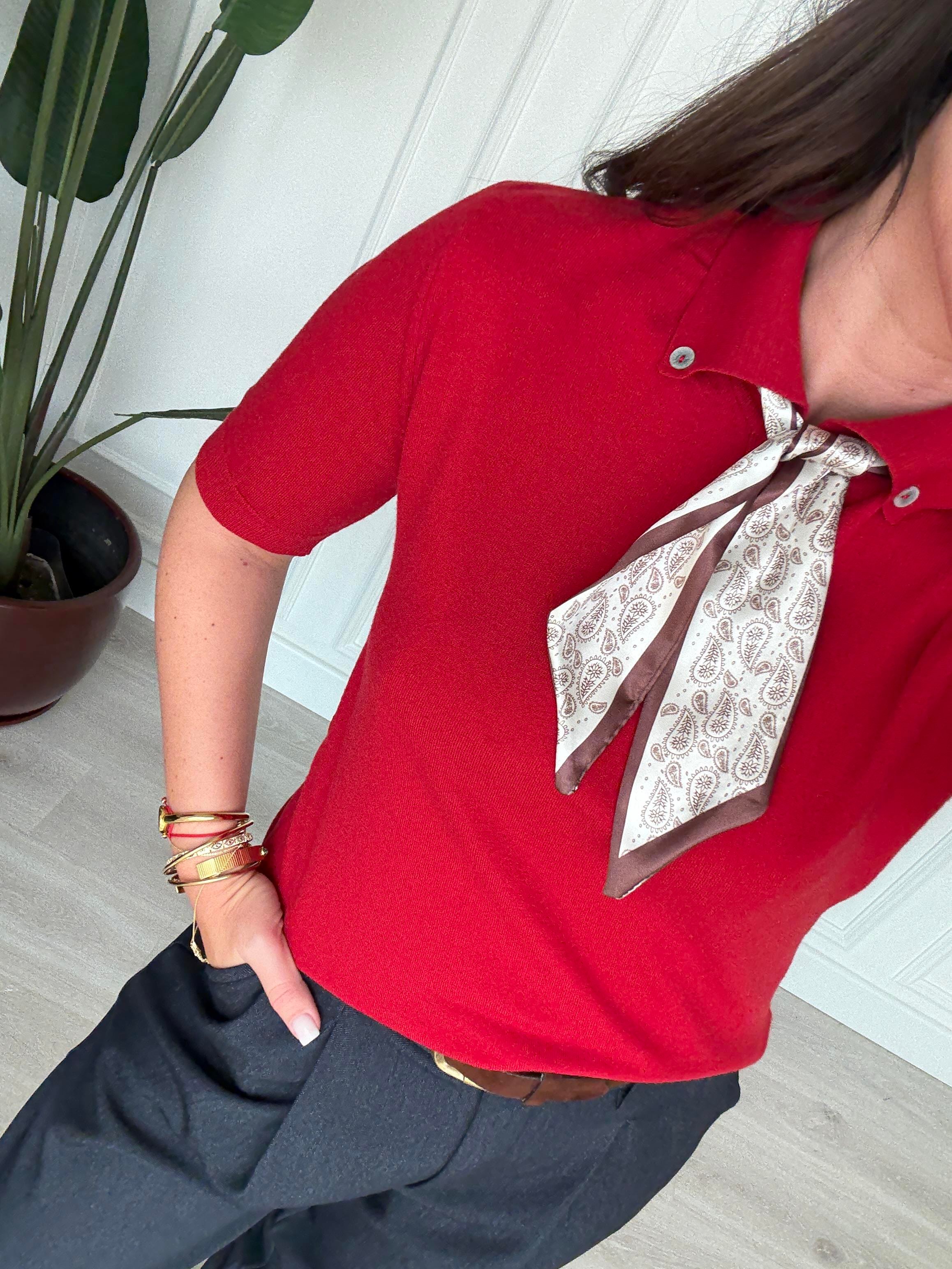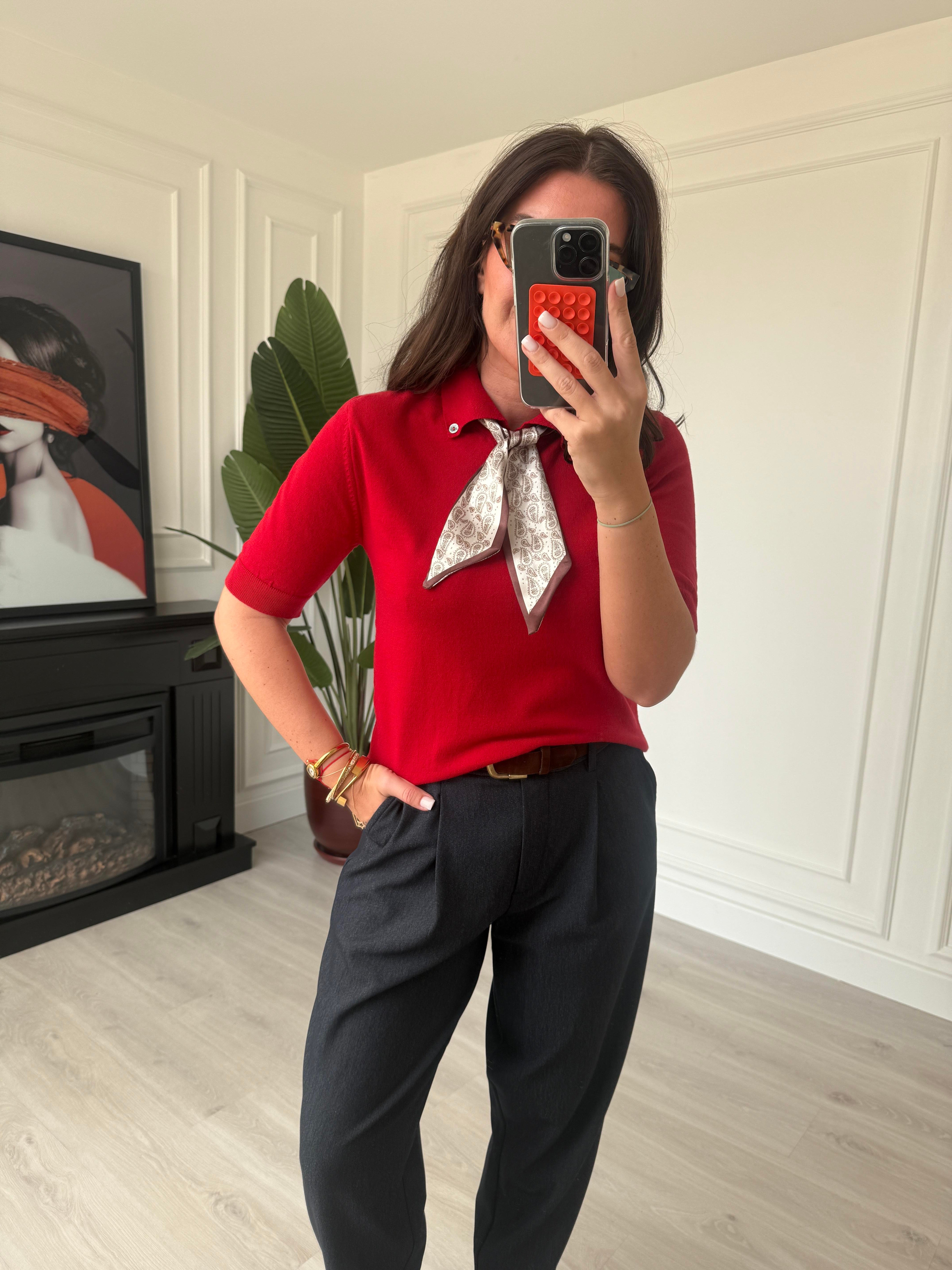 Özel İplik , Polo Yaka , Fularlı , Kırmızı Triko