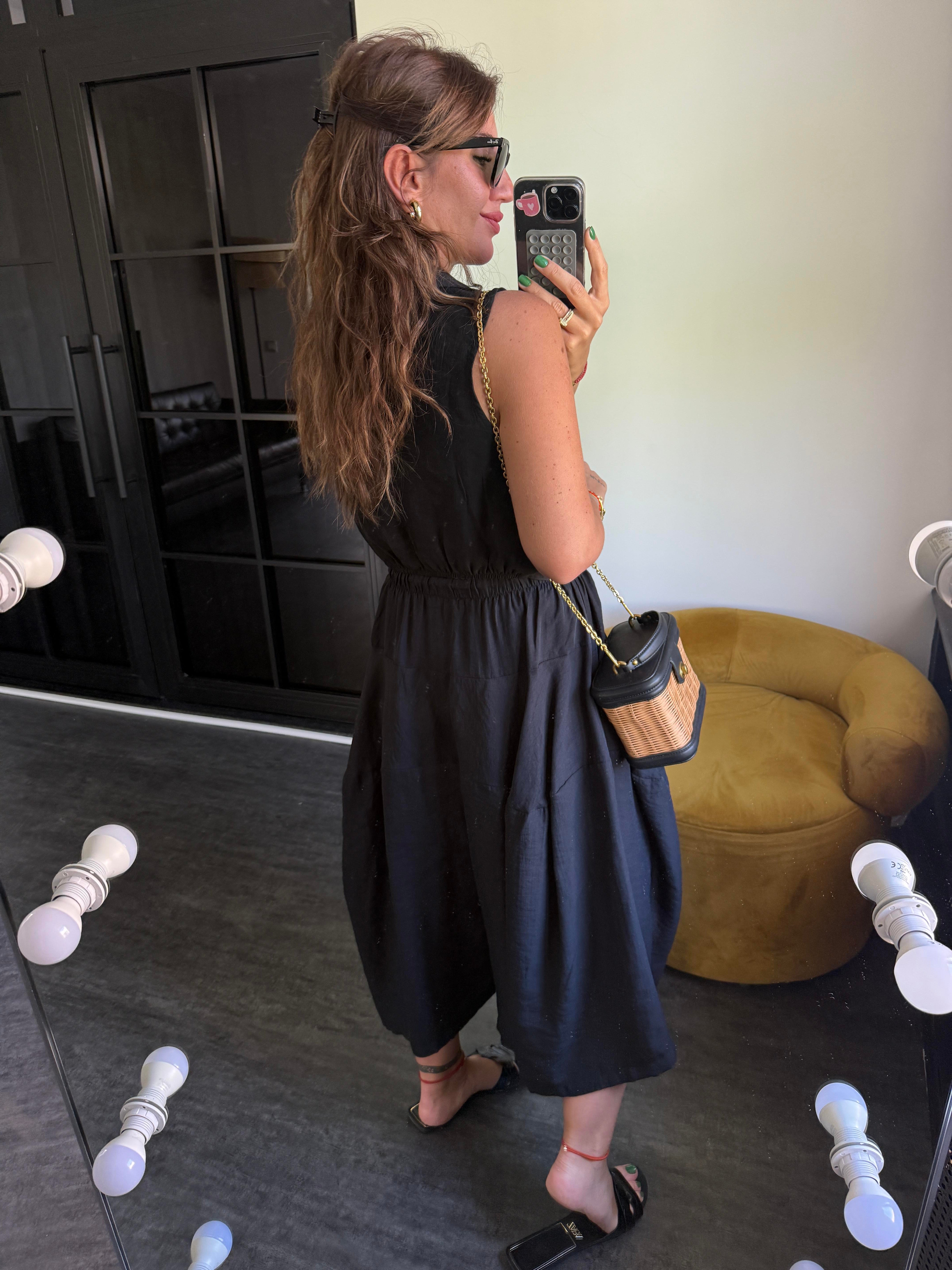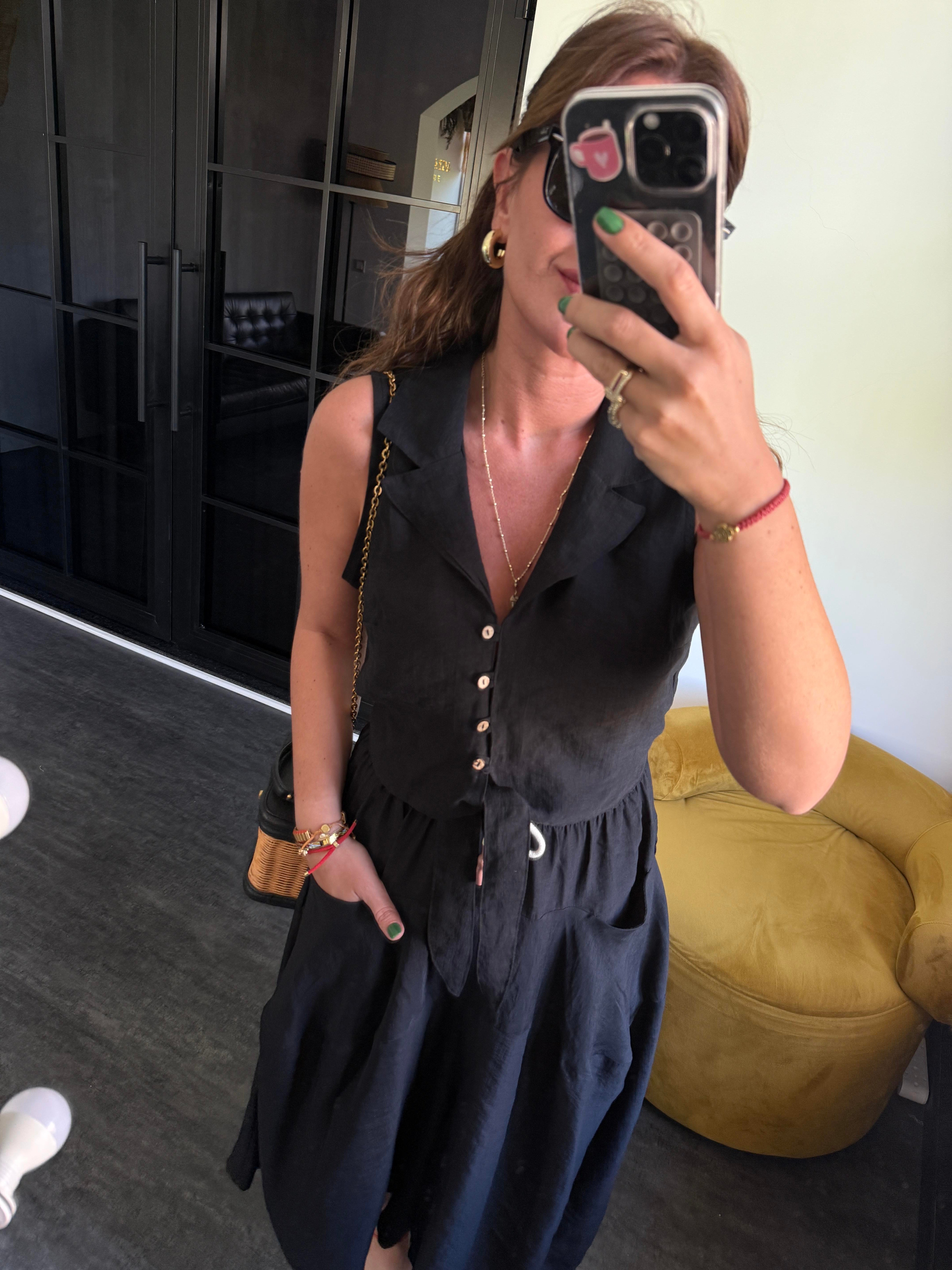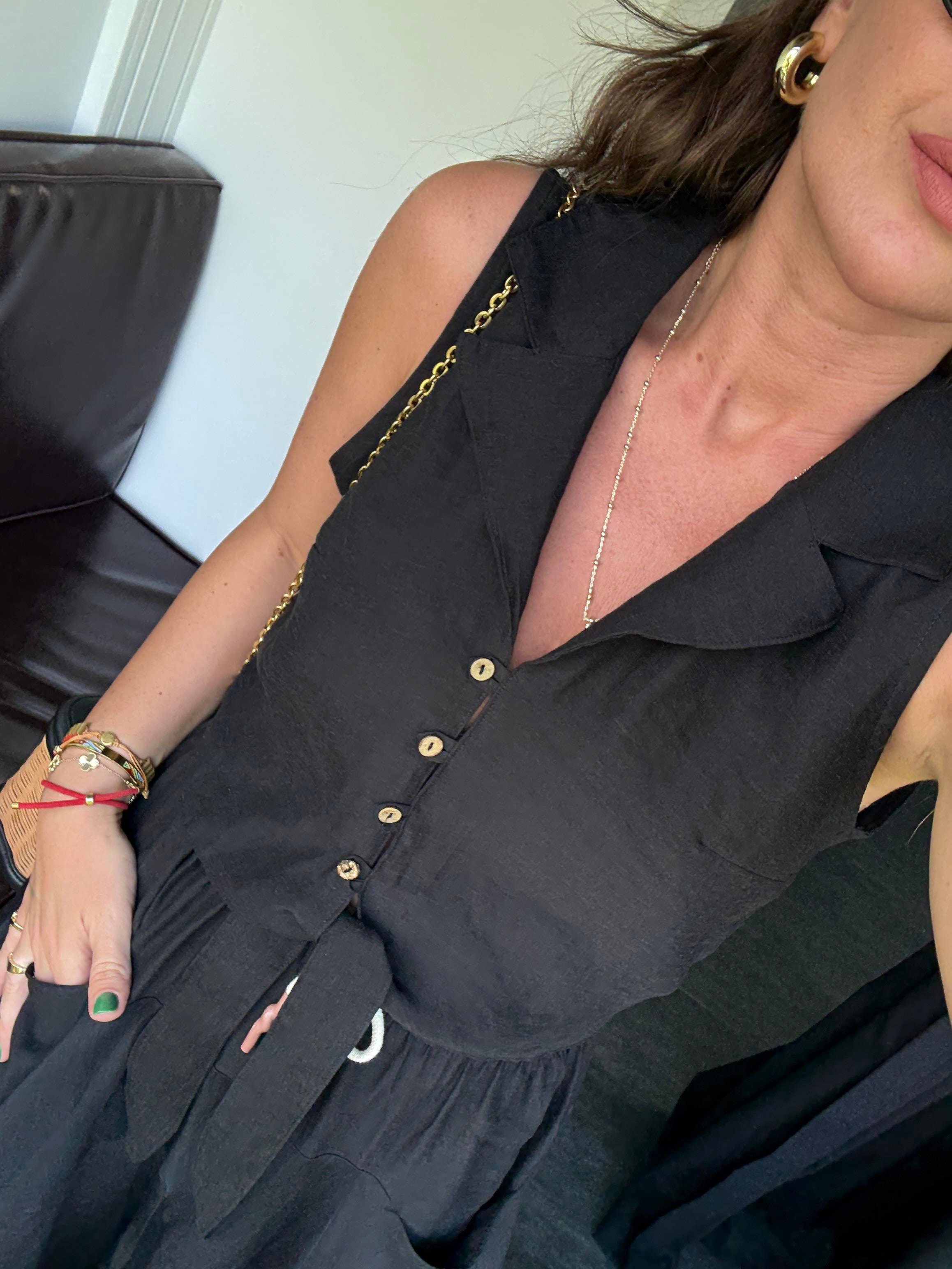 Siyah Önden Düğmeli, Arkası Lastikli Premium Tencel Yelek