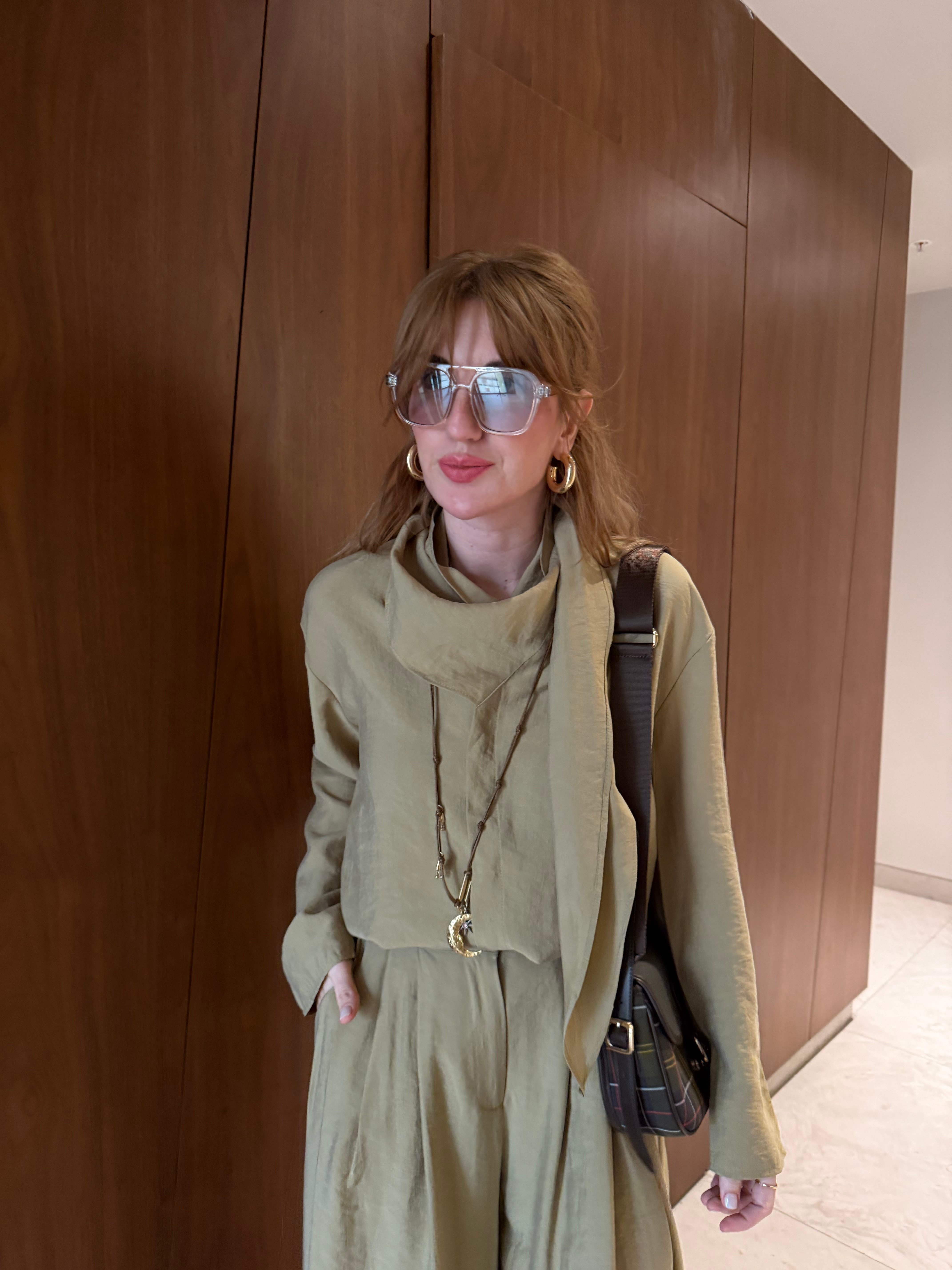 Yağ Yeşili Orijinal Model Fular Yakalı Gömlek & Pantalon Premium Tencel Takım
