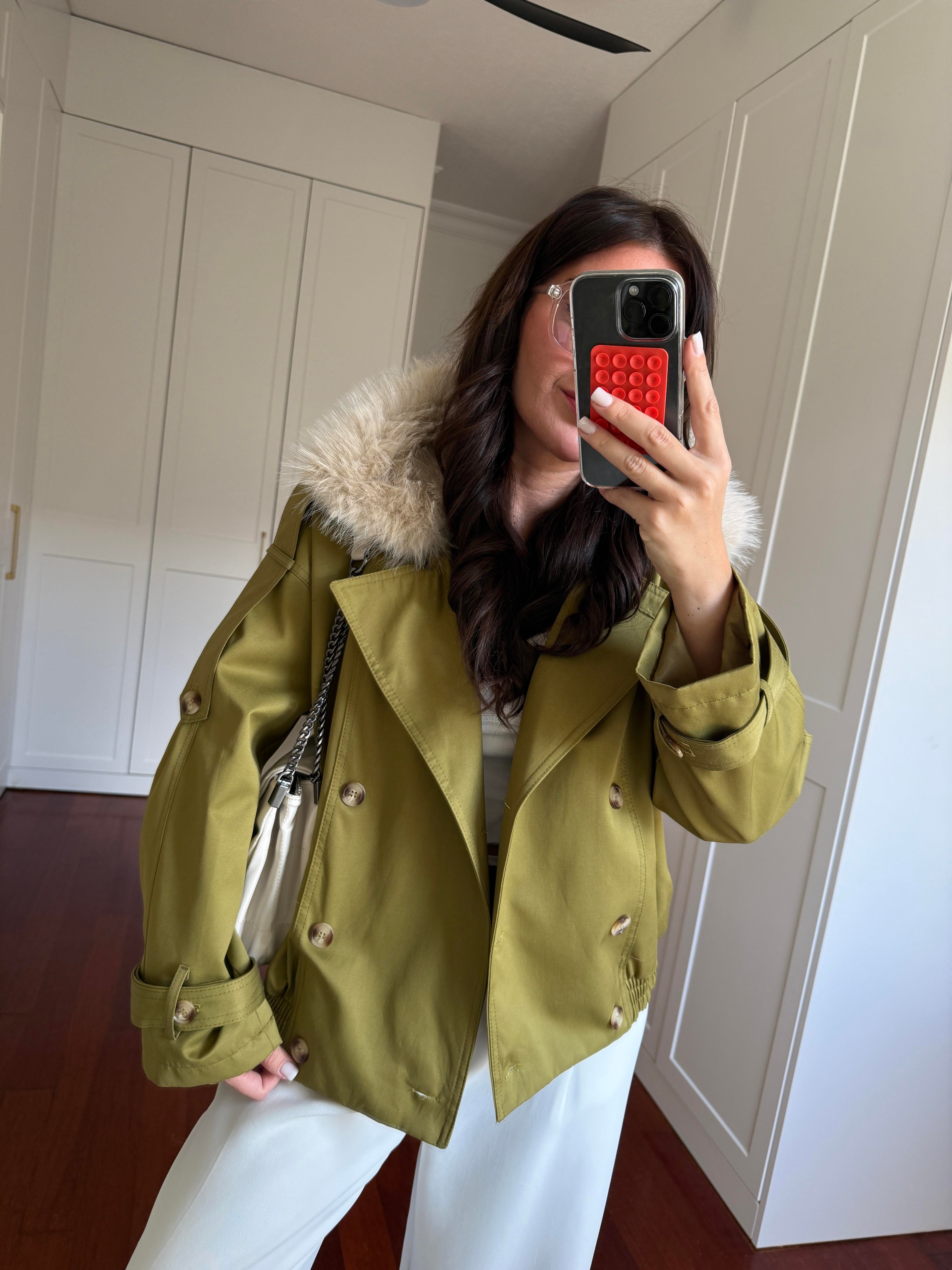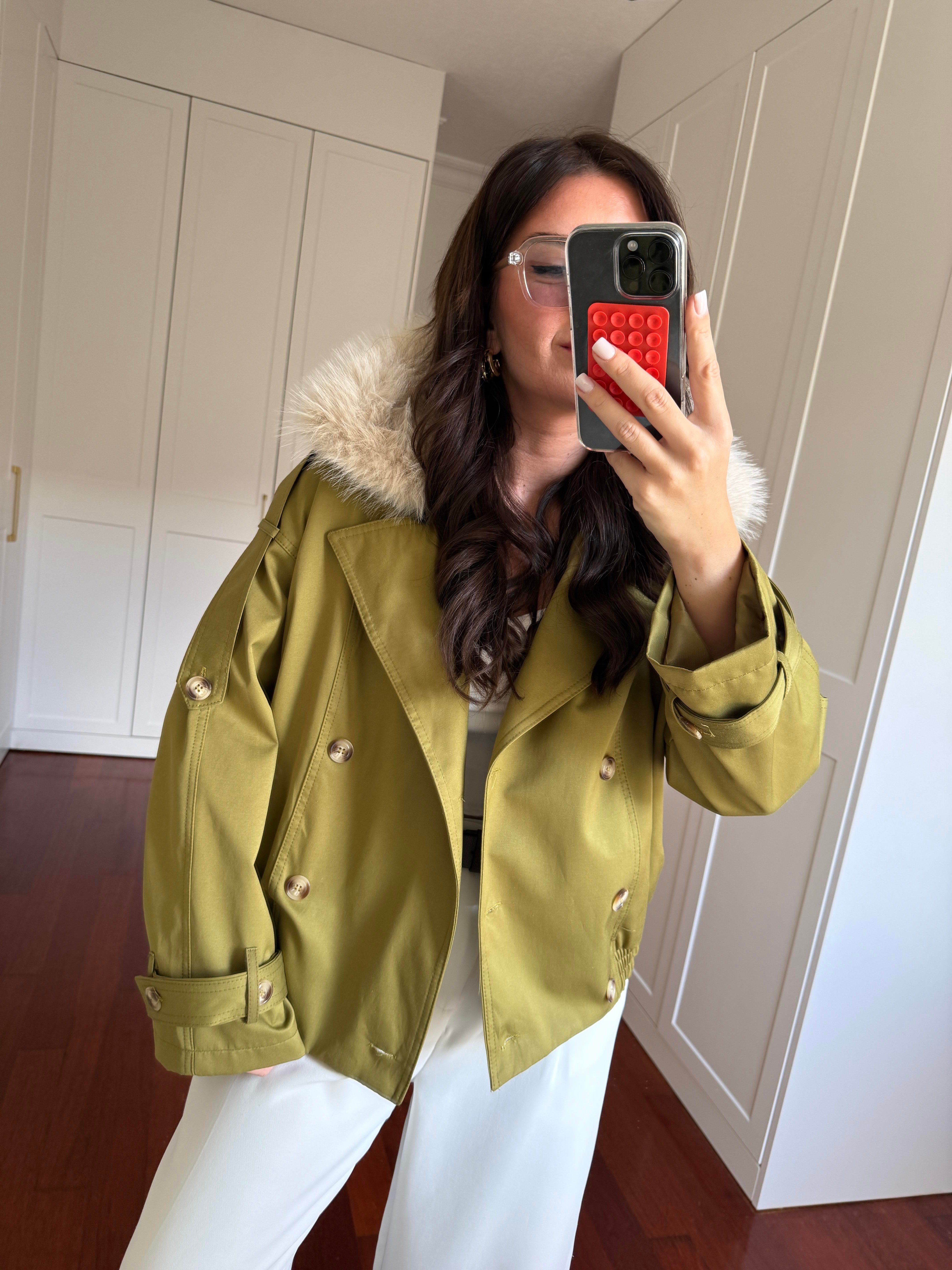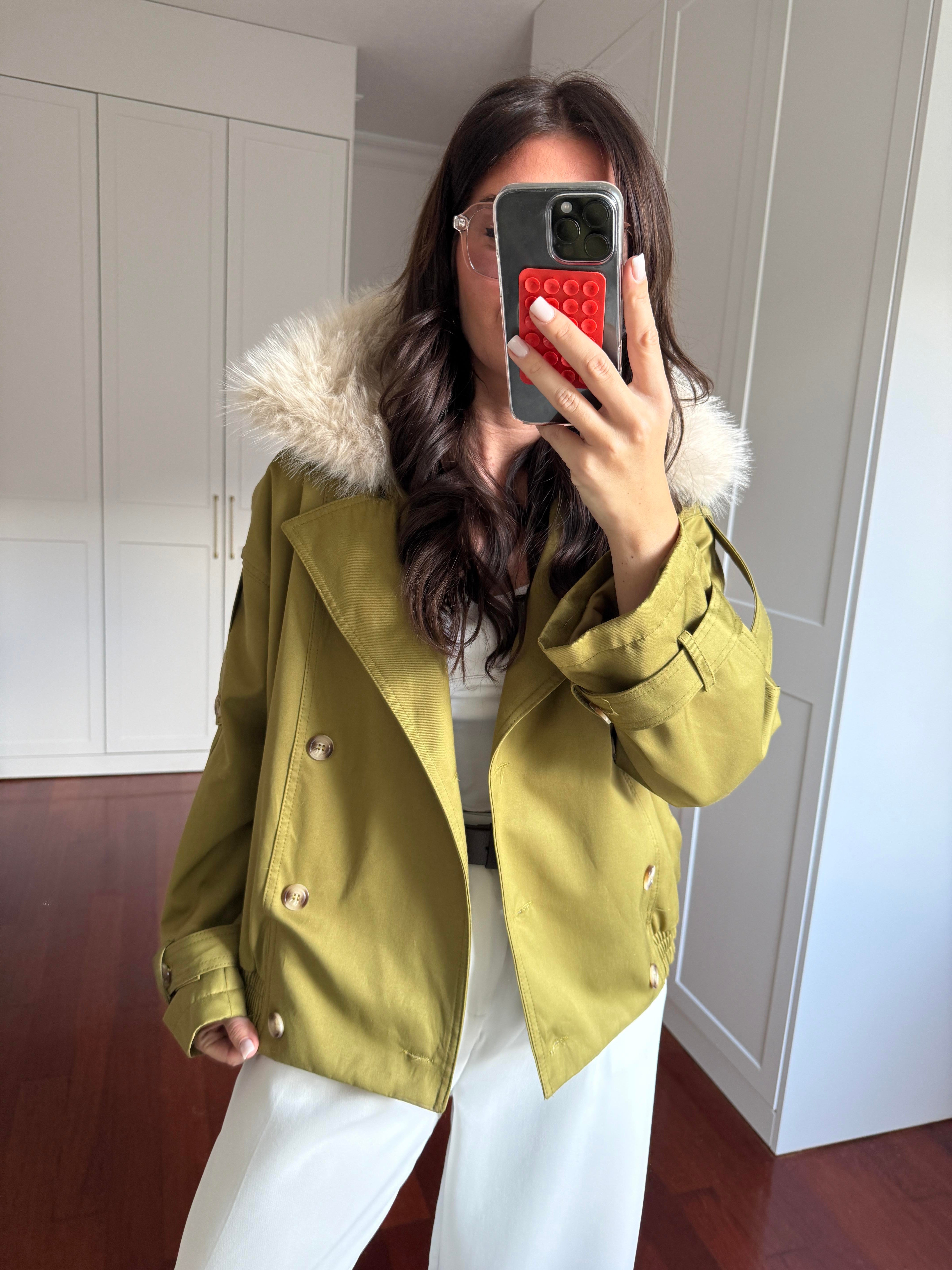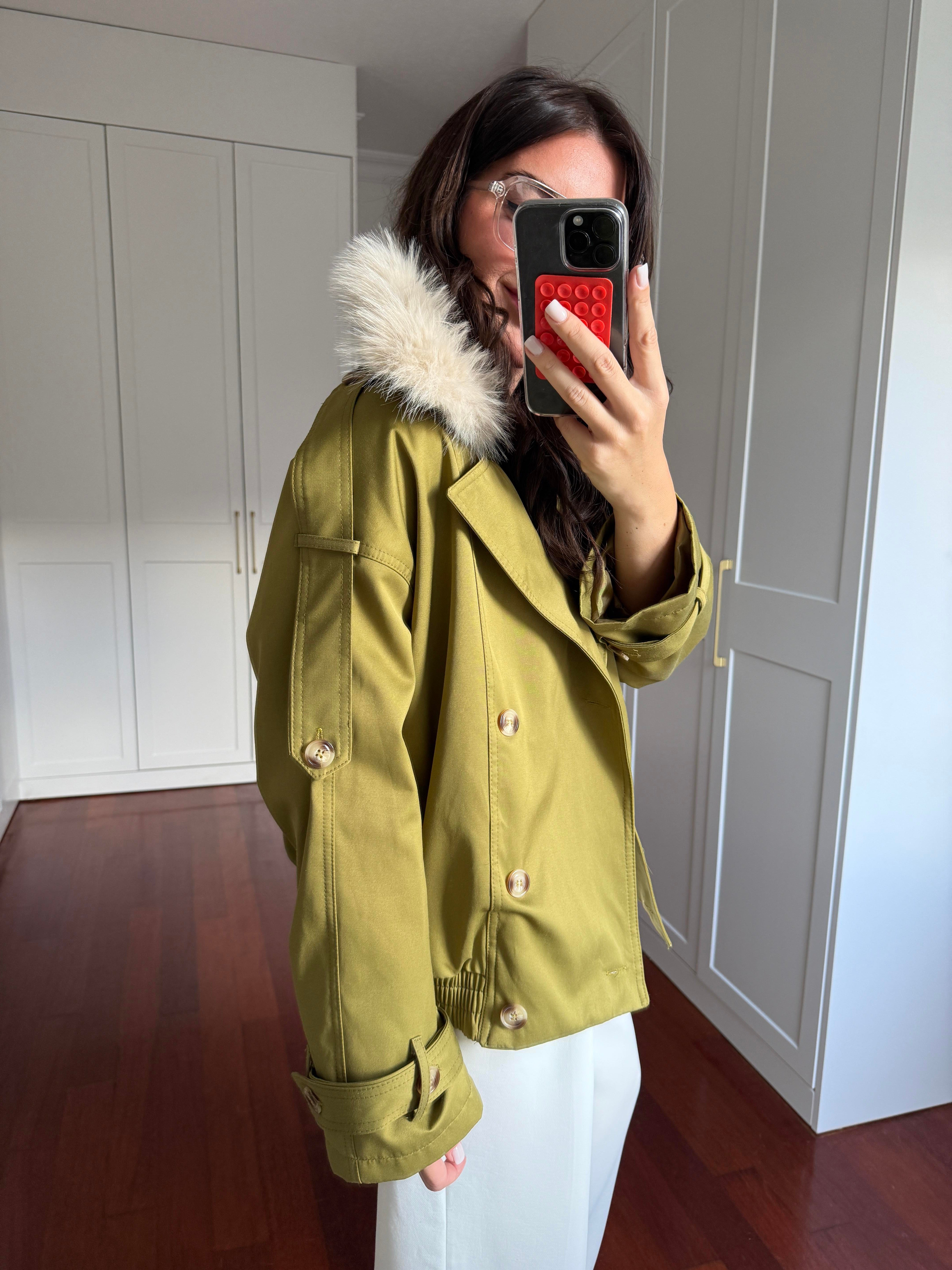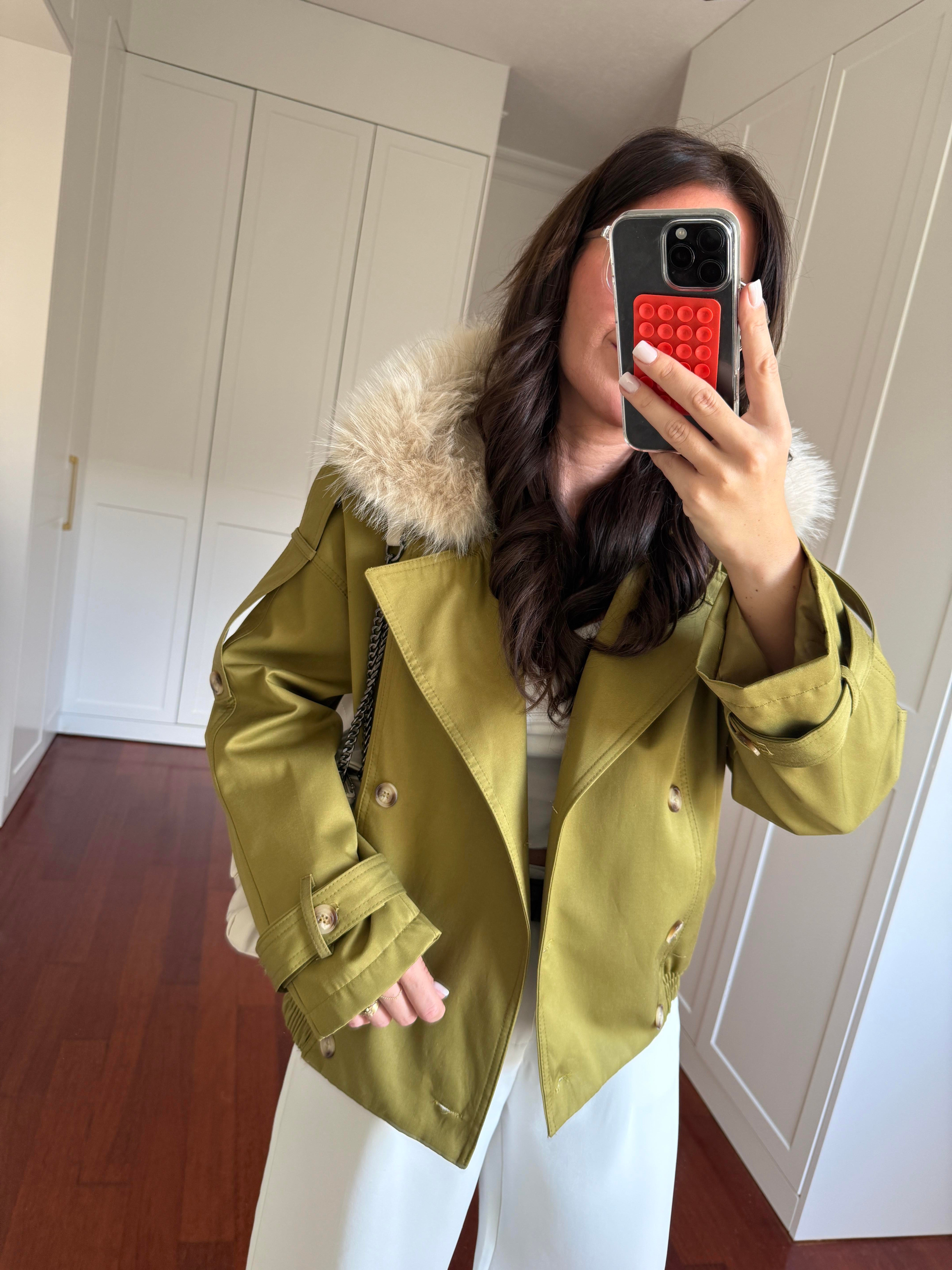 Yakası Çıkabilir Kürklü , Yağ Yeşili , Trençkot