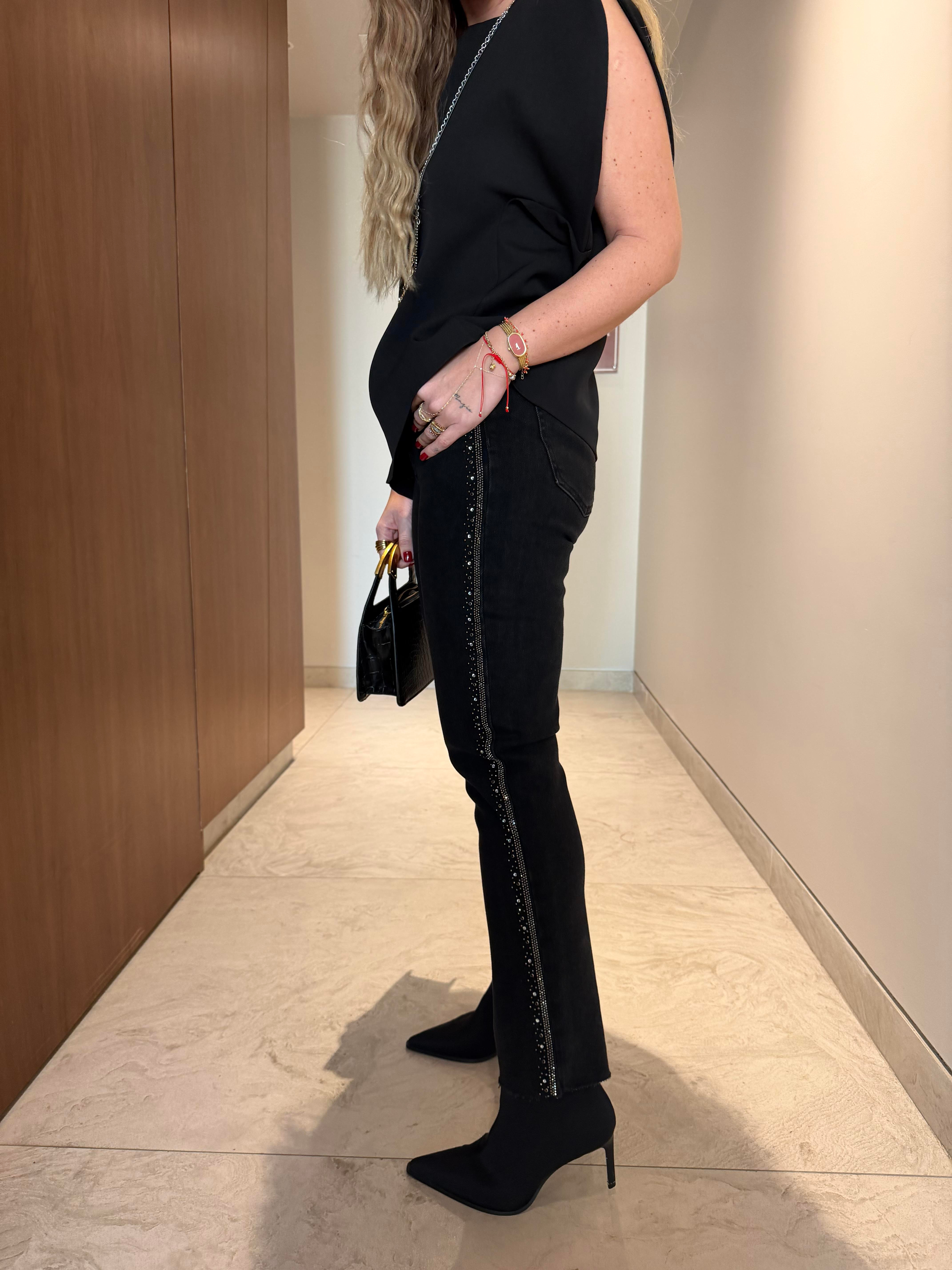 Yanları Zımba & Taş Detaylı , Siyah , Kesik Paça Jean