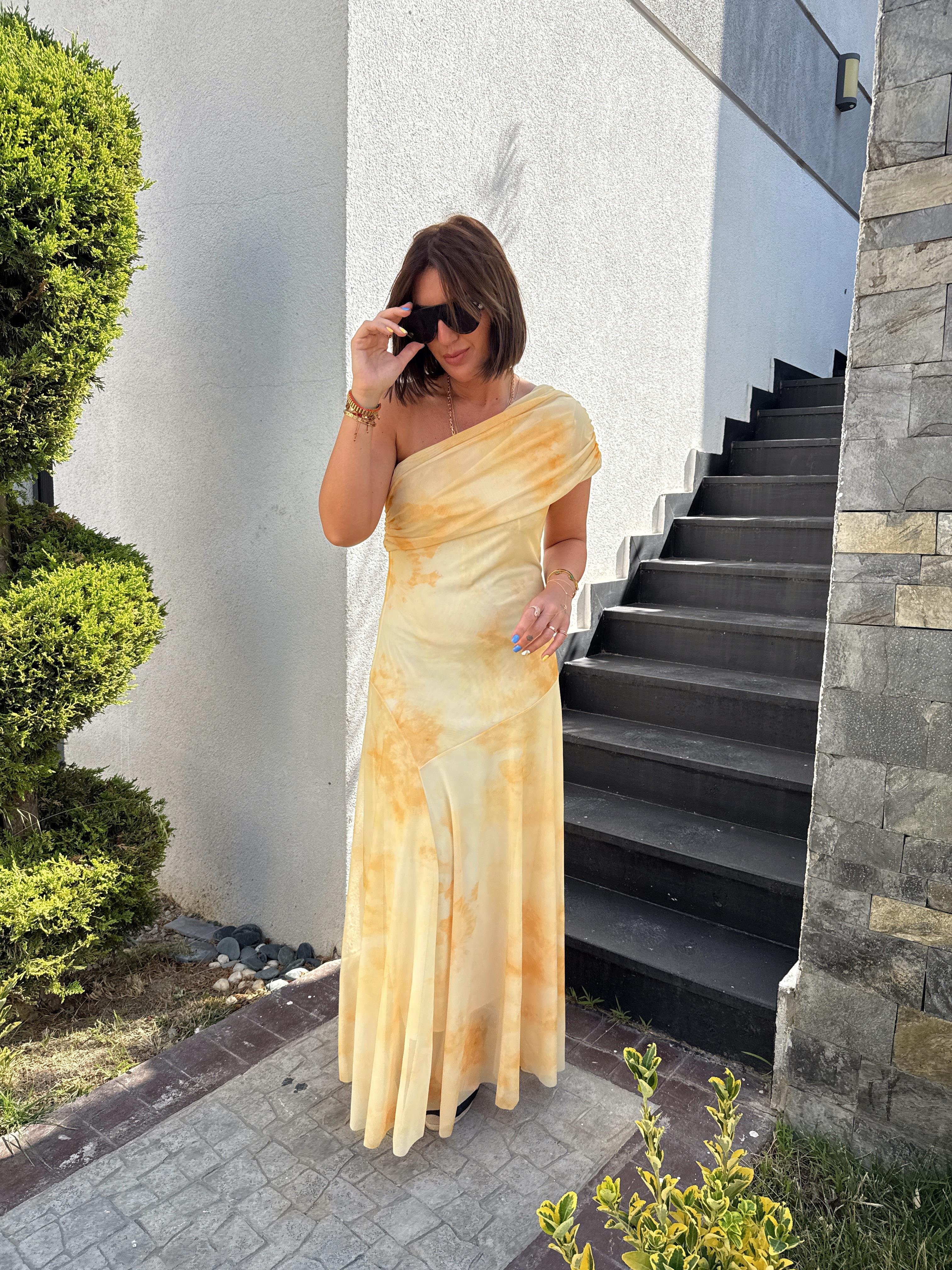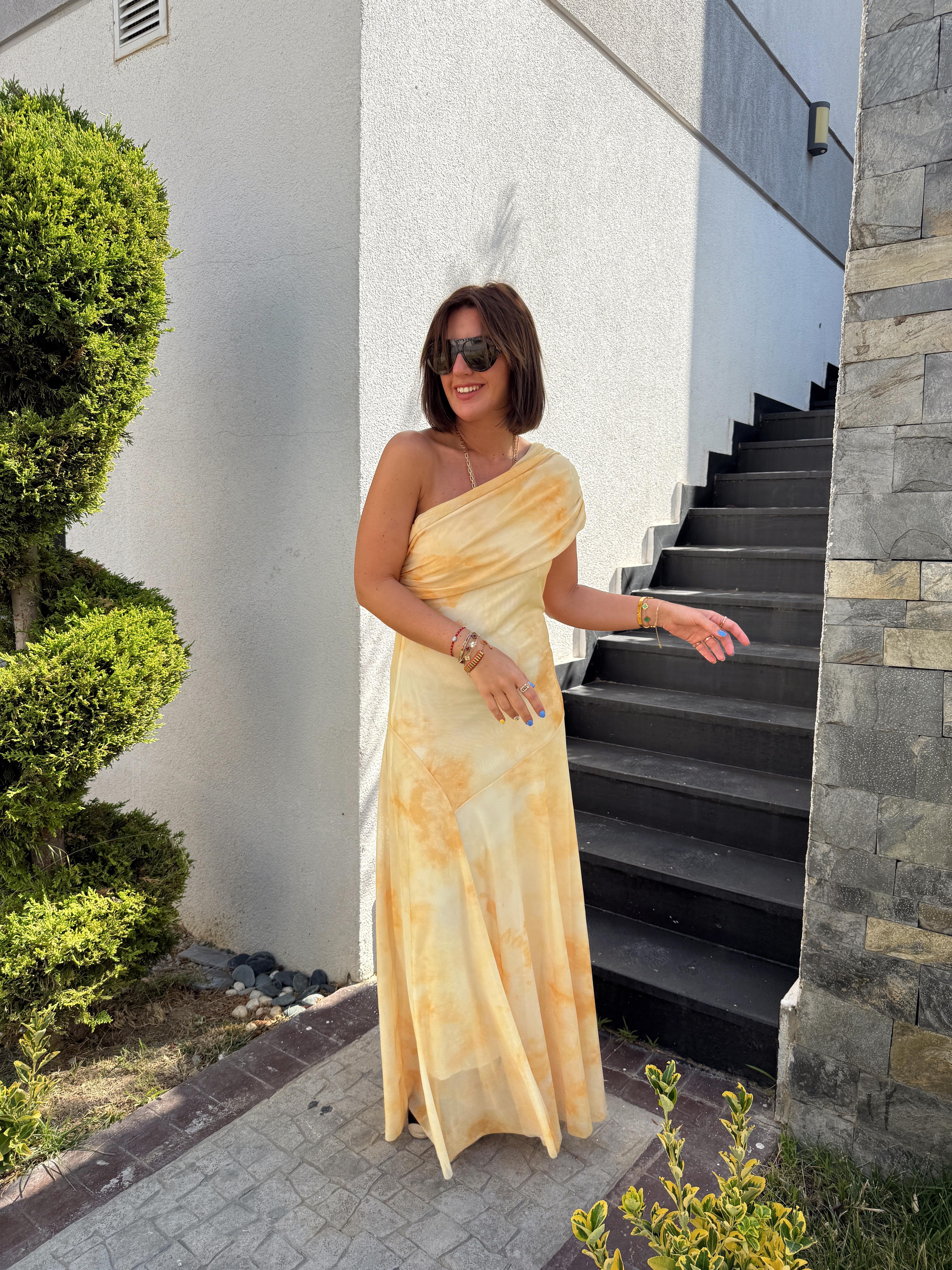 Yarım Omuz, Sarı Desenli Likralı Uzun Elbise