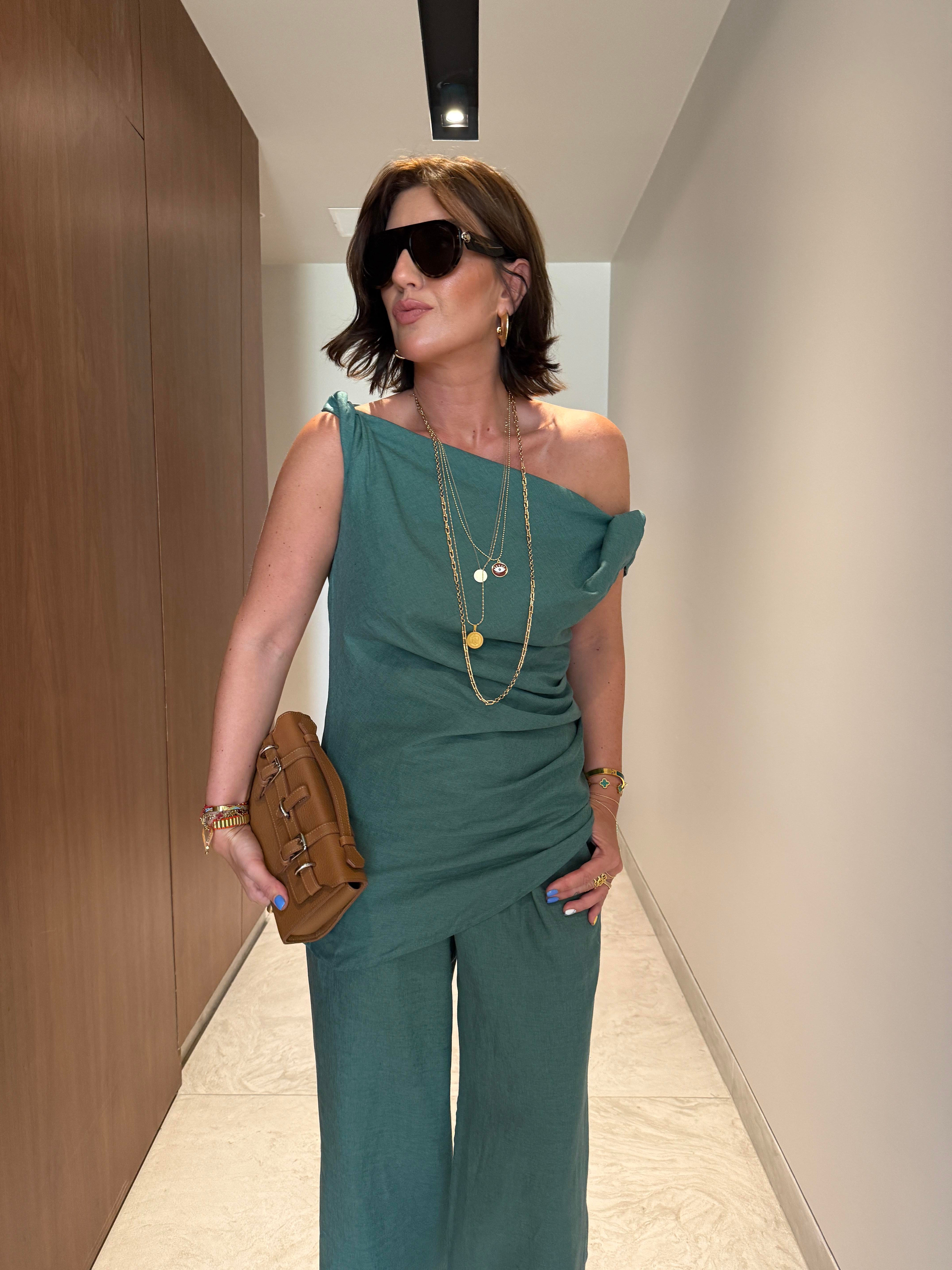 Zümrüt Yeşili , Premium Keten , Çapraz Omuzlu , Pantolon & Bluz Takım